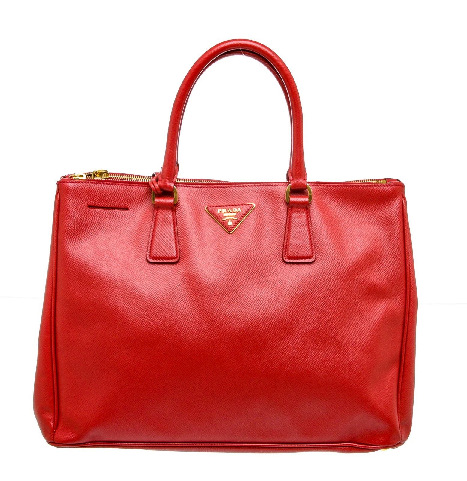 Crafted from red saffiano leather, this Prada bag features gold-tone hardware, dual rolled leather handles, protective feet, dual zip compartments and a middle open compartment with wall pockets.