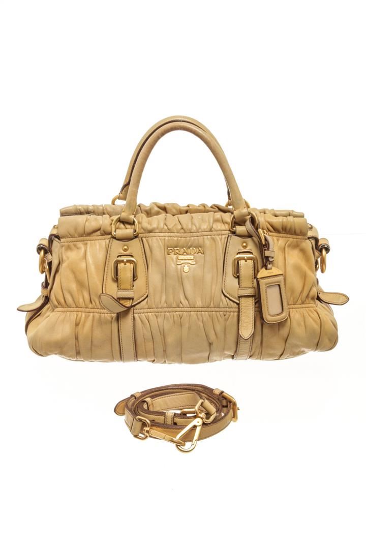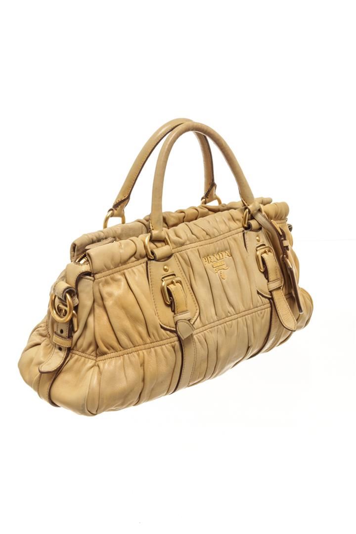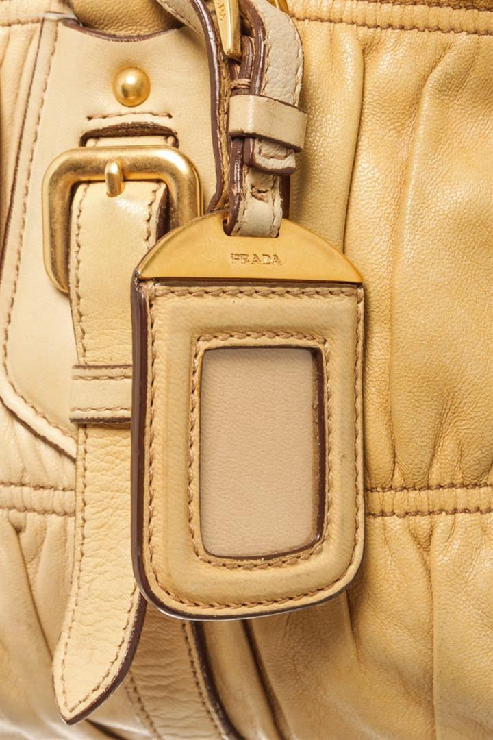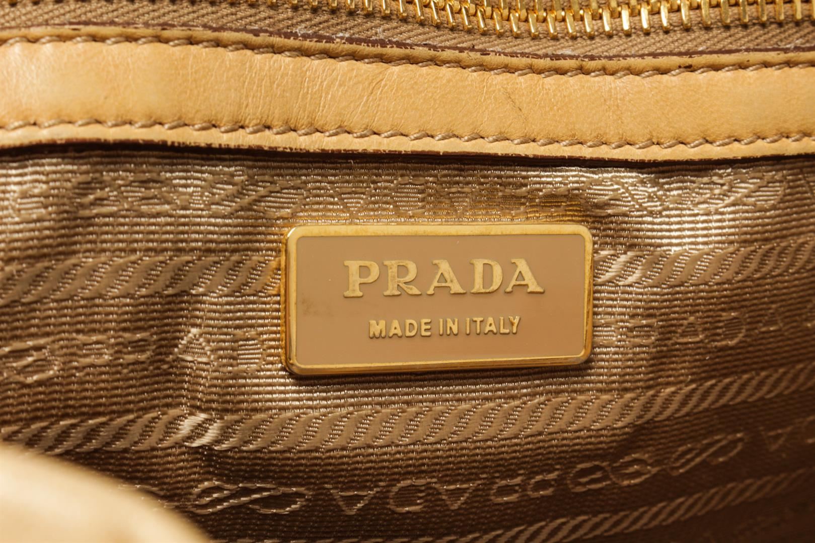 One Prada Light Brown Leather Shoulder Bag. Item is sold AS-IS. All available information is listed in the description and shown in the photo. Prada Light Brown Leather Shoulder Bag with gold tone hardware, two round top handles, adjustable shouder strap, zip closure, Prada fabric lining. 17cm x 38cm x 11.5cm / 6.69" x 14.96" x 4.52" Inches