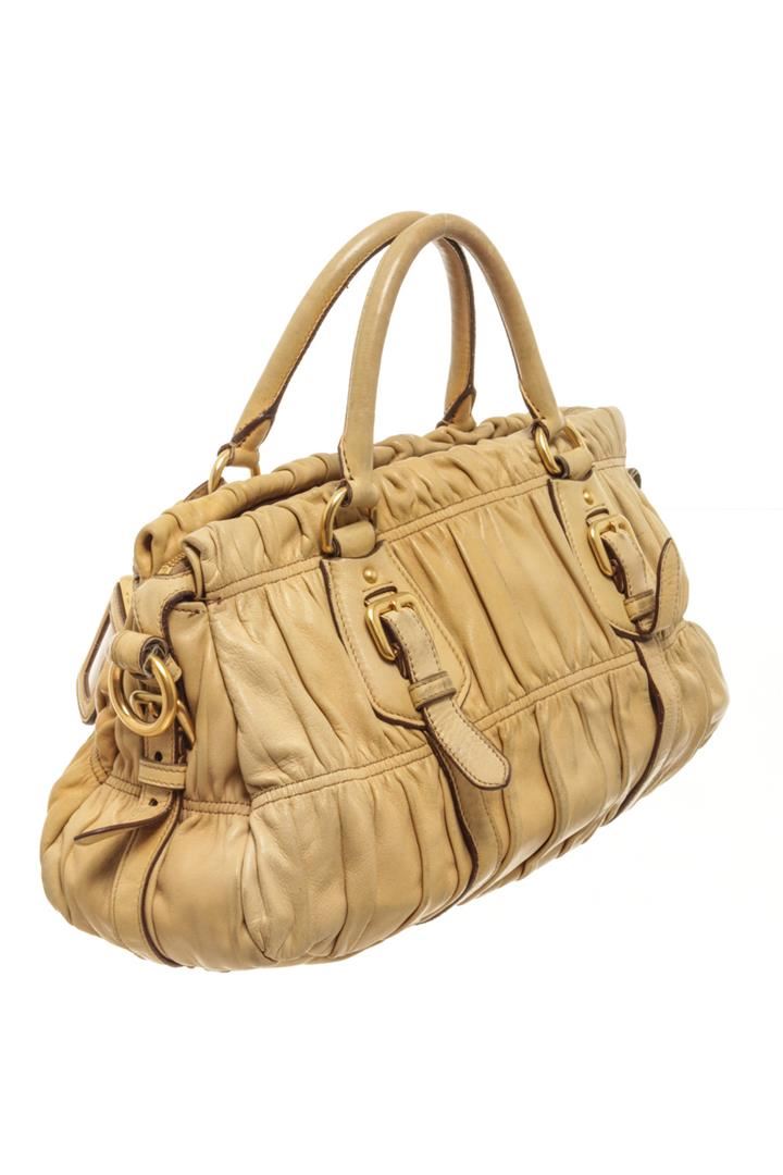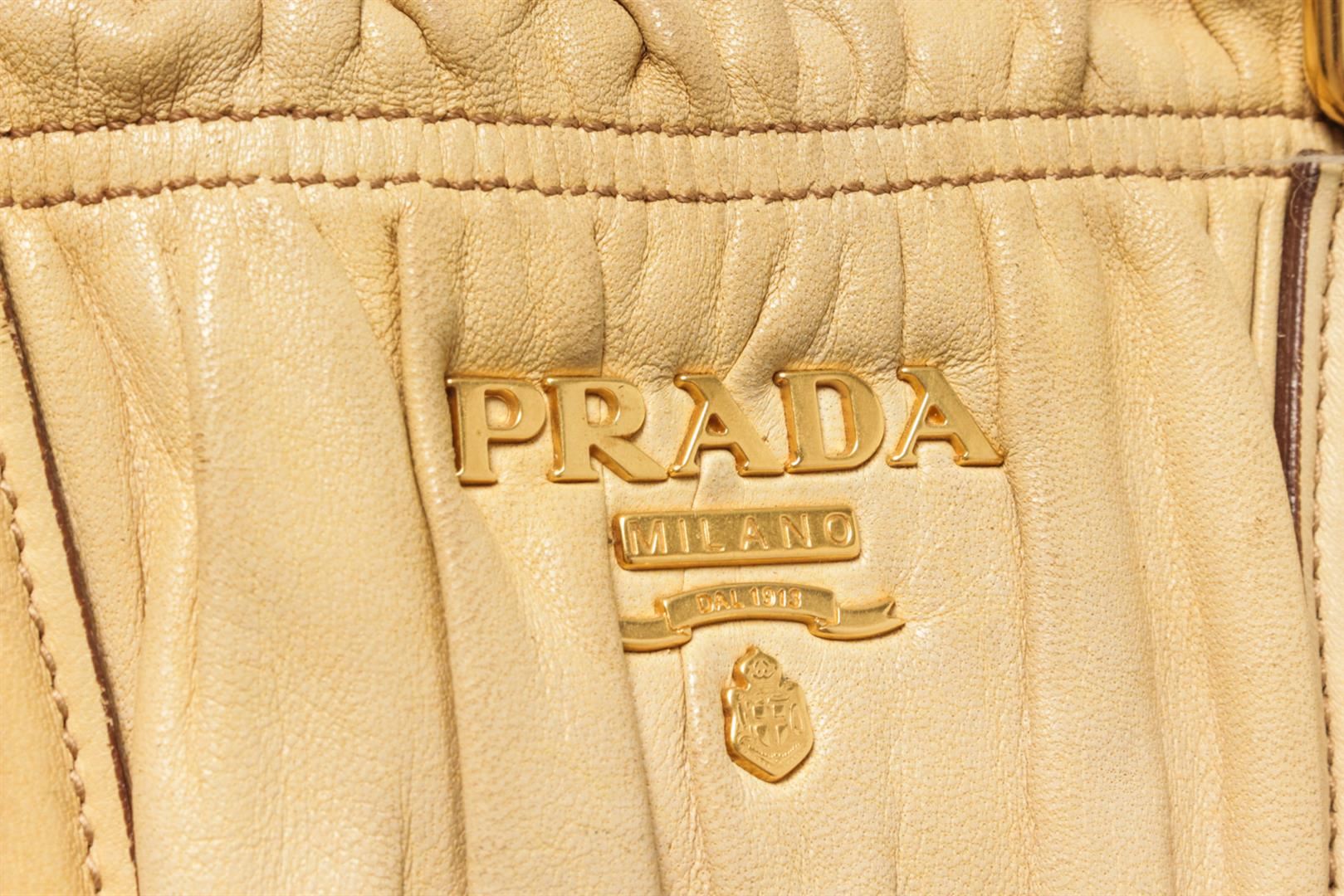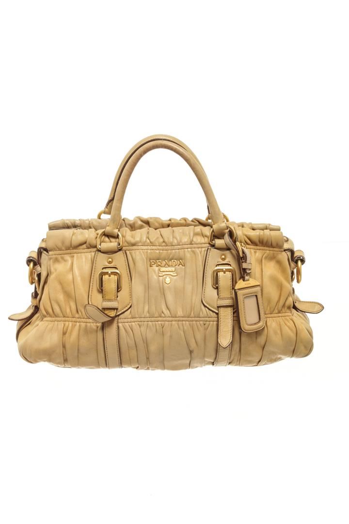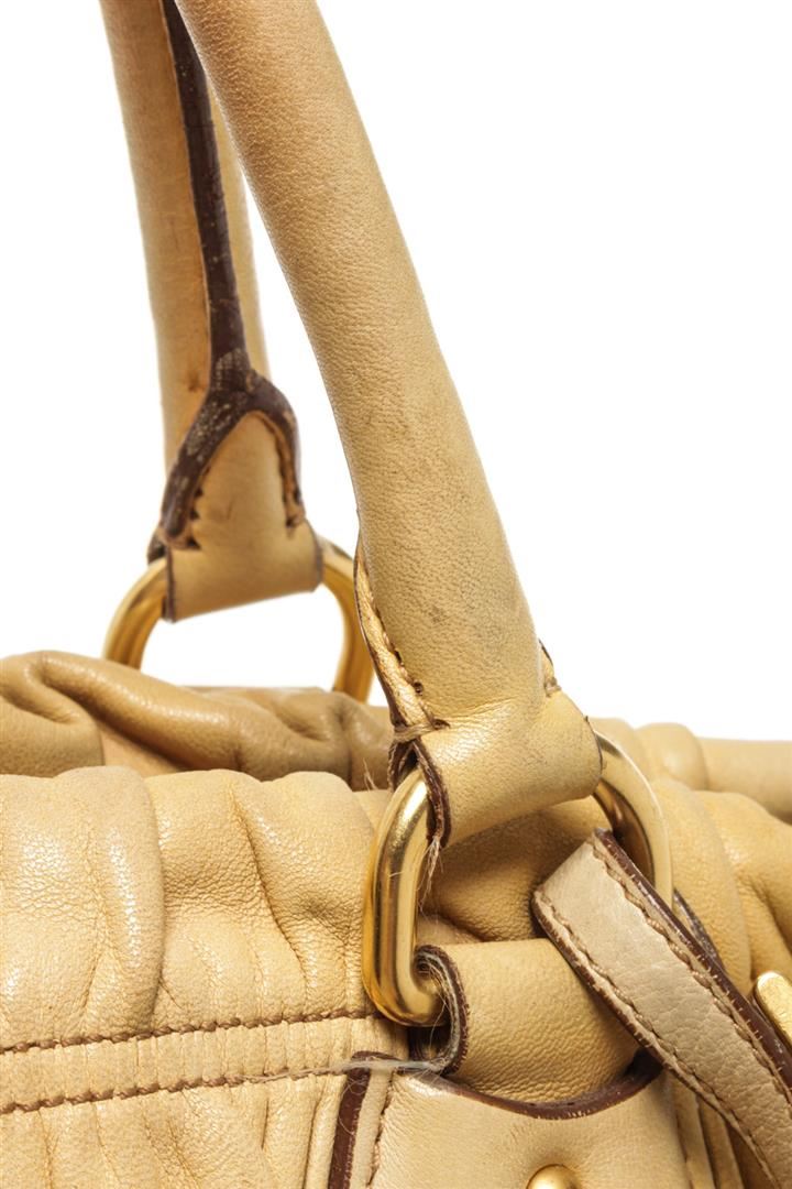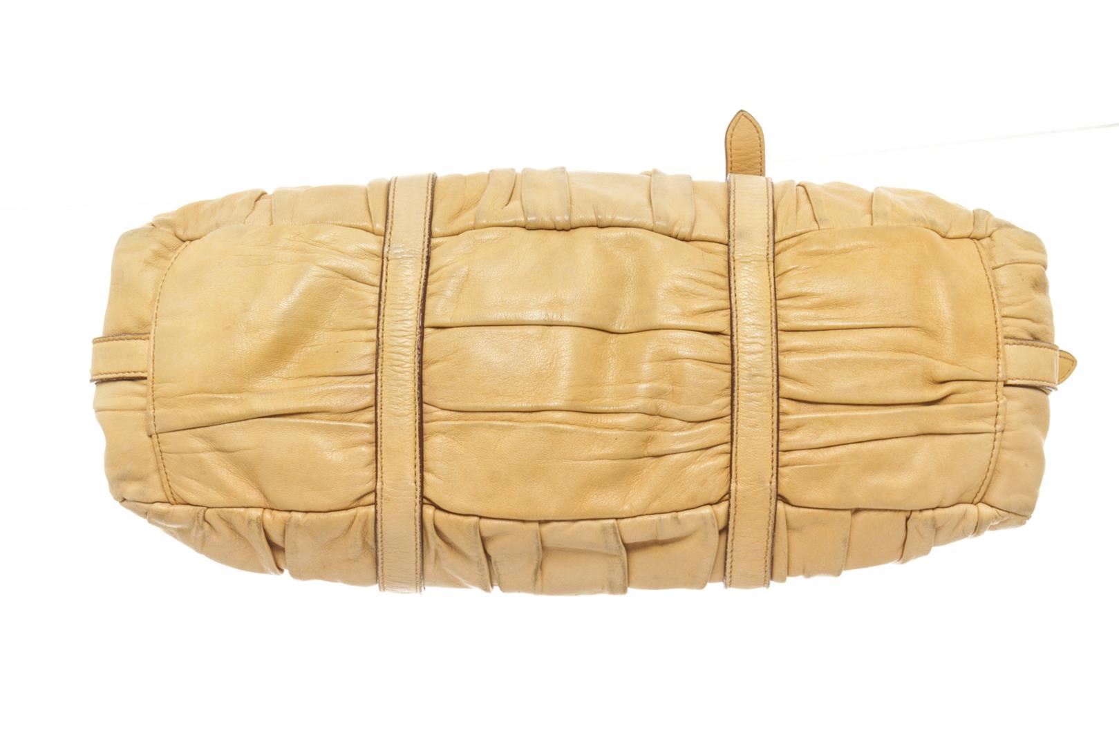 One Prada Light Brown Leather Shoulder Bag. Item is sold AS-IS. All available information is listed in the description and shown in the photo. Prada Light Brown Leather Shoulder Bag with gold tone hardware, two round top handles, adjustable shouder strap, zip closure, Prada fabric lining. 17cm x 38cm x 11.5cm / 6.69" x 14.96" x 4.52" Inches