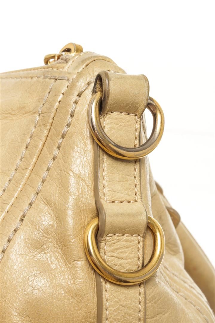 One Prada Light Yellow Beige Leather Shoulder Bag. Item is sold AS-IS. All available information is listed in the description and shown in the photo. Prada Light Yellow Beige Leather Shoulder Bag with top handle, exterior zipper pocket, Prada fabric lining, interior zipper pocket, gold tone hardware and zipper closure. There is a pen mark on the leather and the lining is heavily worn. Please refer to photos. Height:9.36 in, Length:15.8 in, Depth:5.85 in / 23.77 x 40.13 x 14.85 CM