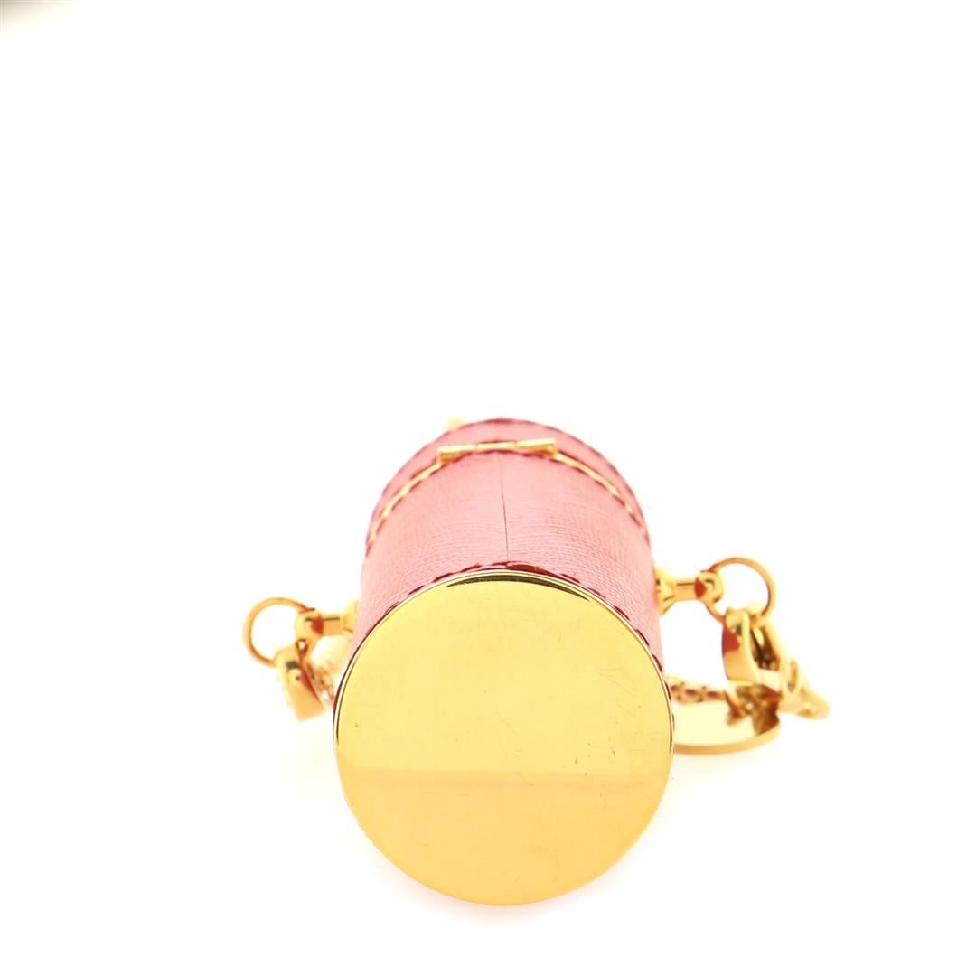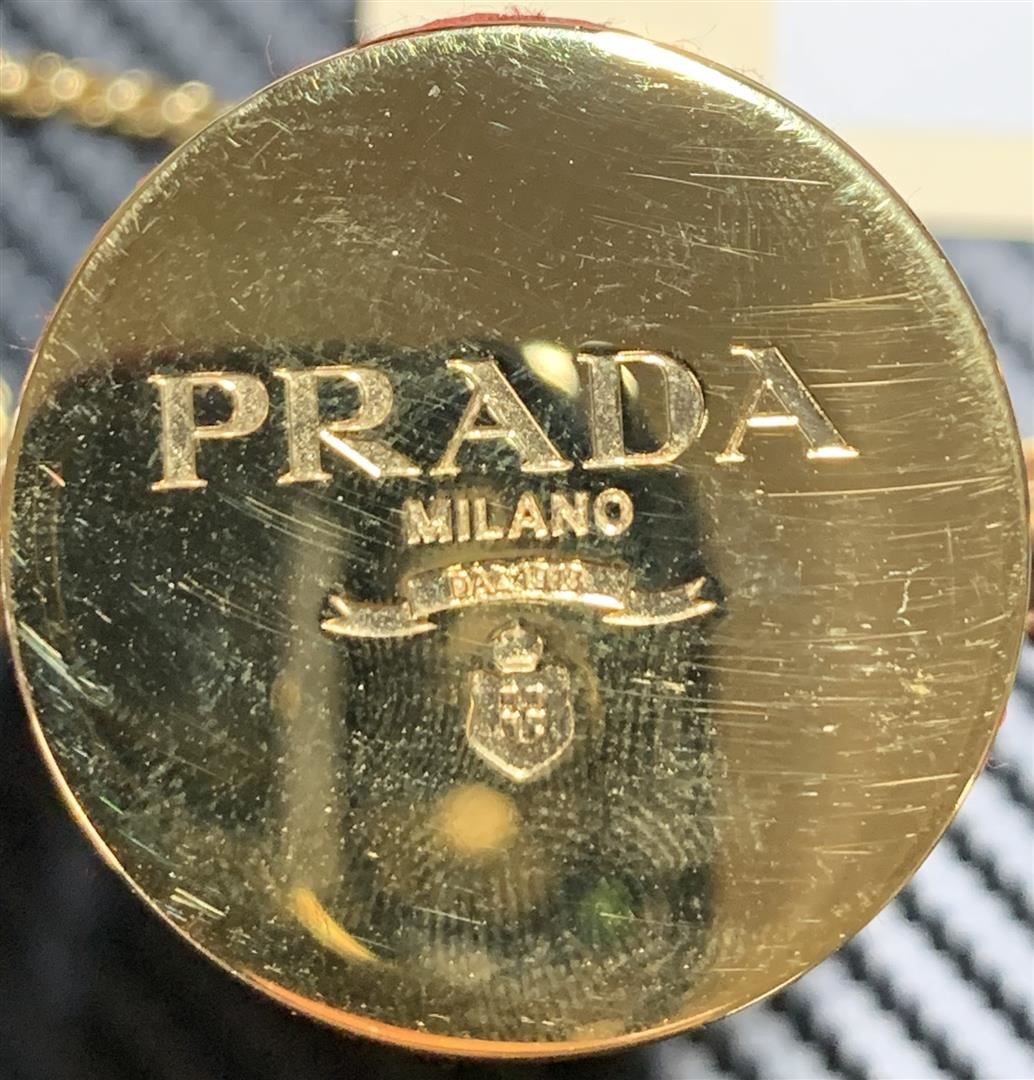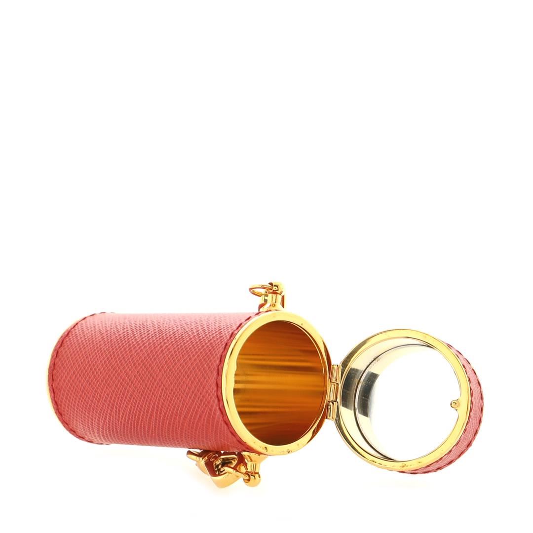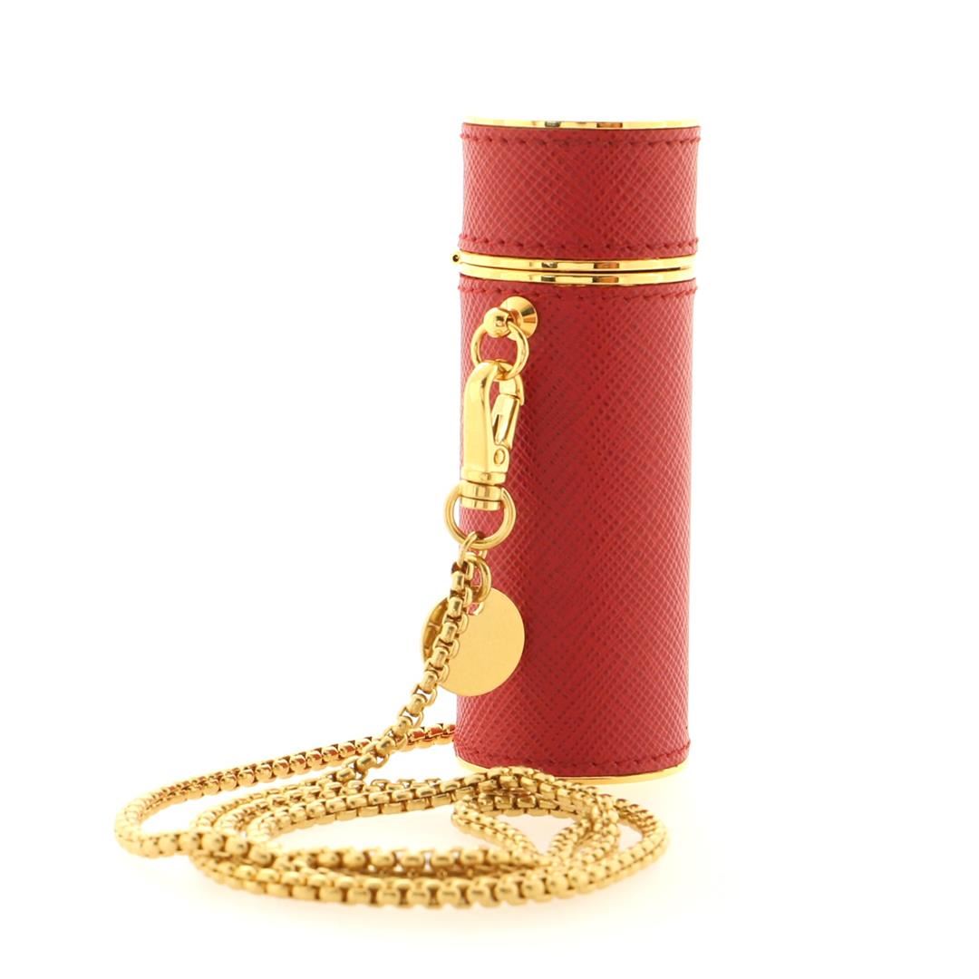 Prada Lipstick Case on Chain Saffiano Leather. Minor wear on exterior, scratches on hardware.