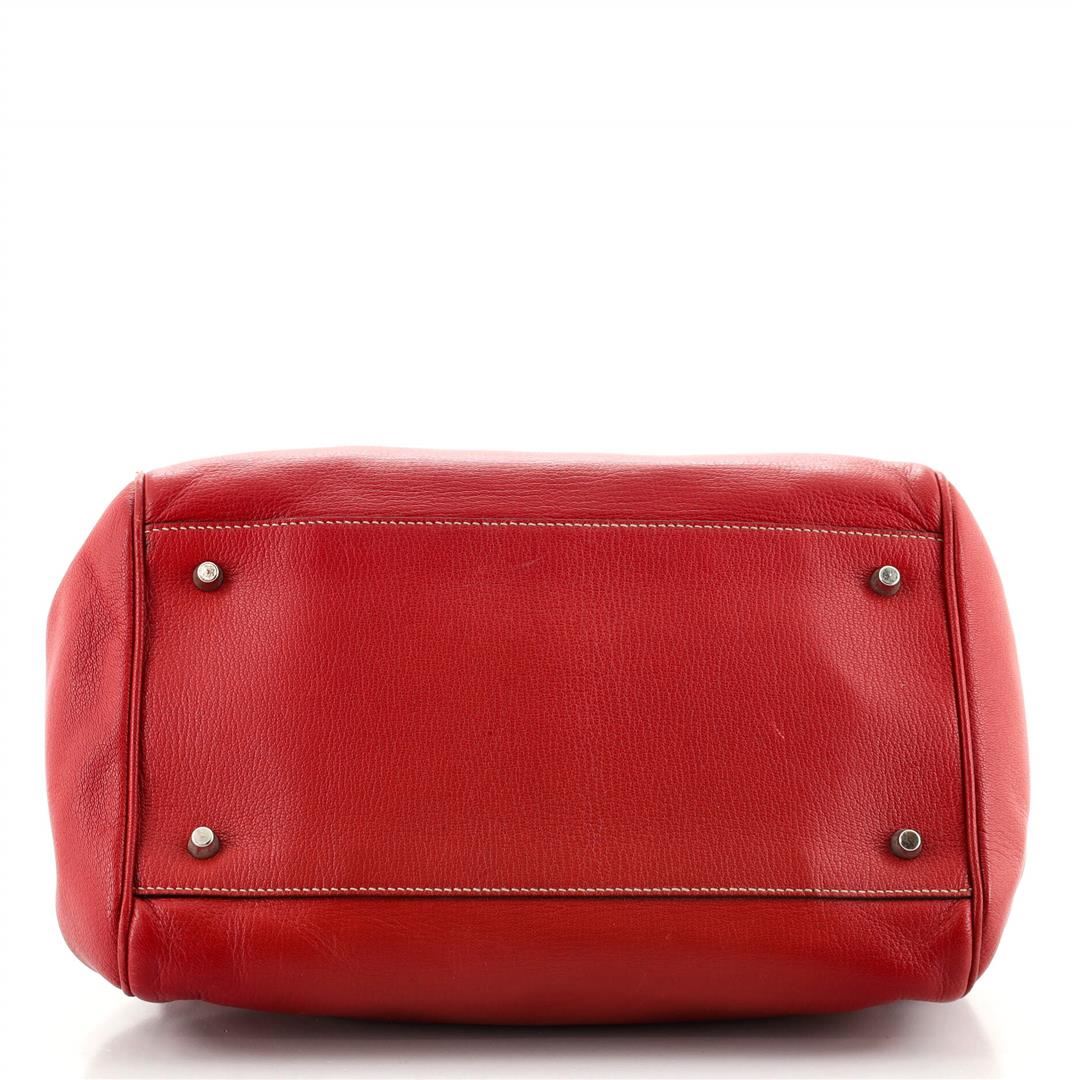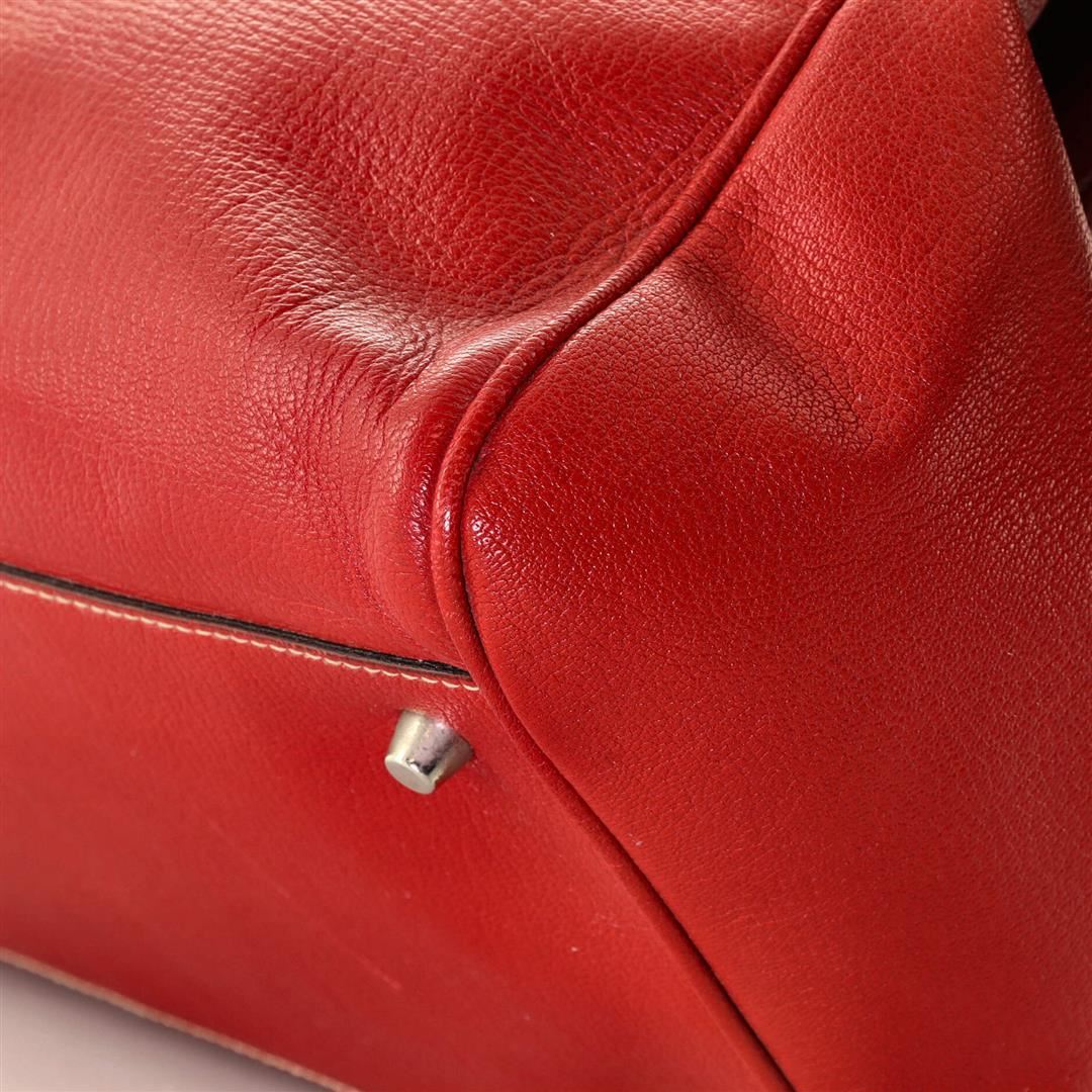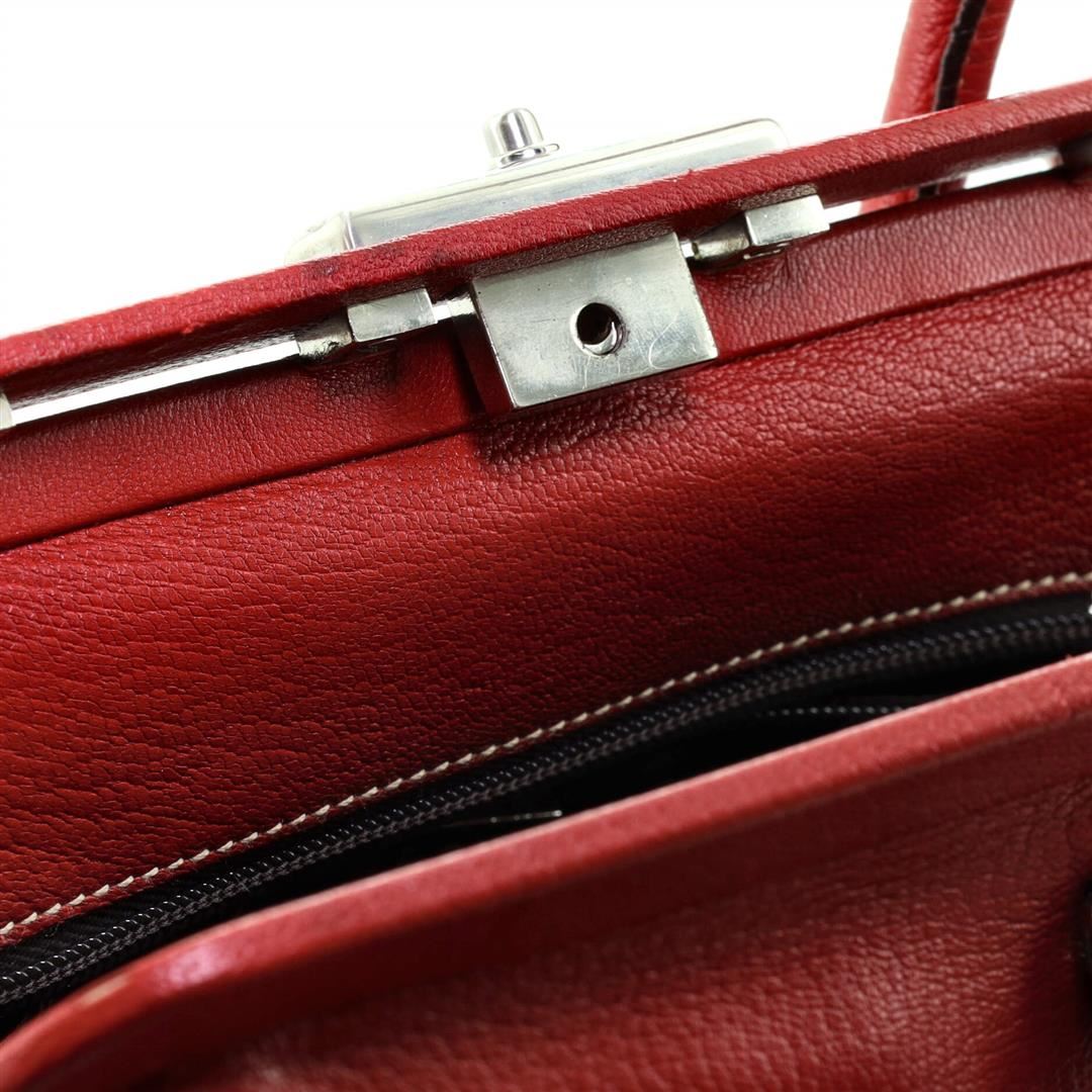 Prada Lock Frame Satchel Leather Medium. Please see photos and description for all available information! Prada Lock Frame Satchel Leather Medium. Creasing on exterior, moderate wear on base corners, heavy tear on opening trim. Small nicks on handles, cra