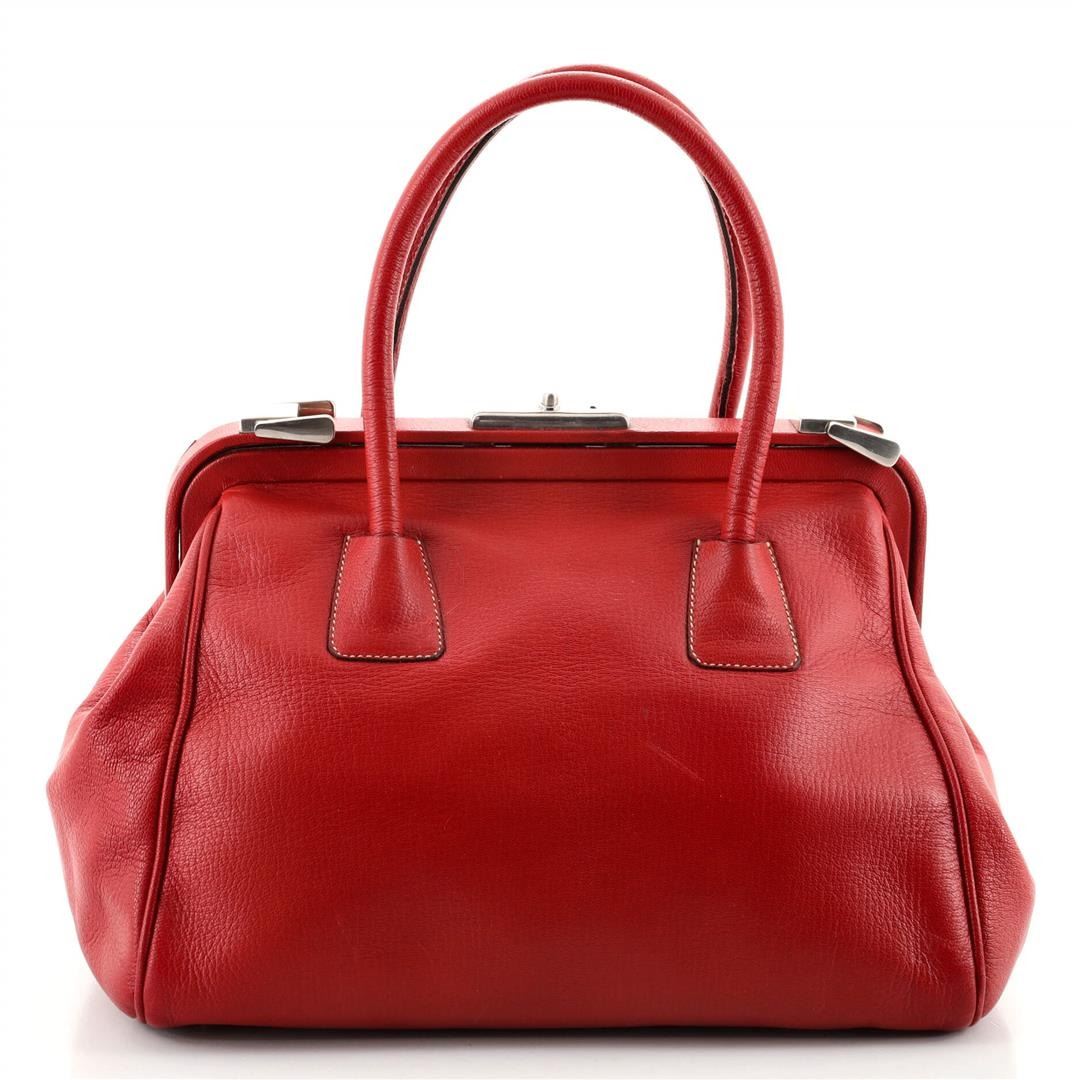 One Prada Lock Frame Satchel Leather Medium. Item is sold AS-IS. All available information is listed in the description and shown in the photo. Prada Lock Frame Satchel Leather Medium. Creasing on exterior, moderate wear on base corners, heavy tear on opening trim. Small nicks on handles, cracking on handle wax edges, indentations and scuffs on opening edges, scratches on hardware.