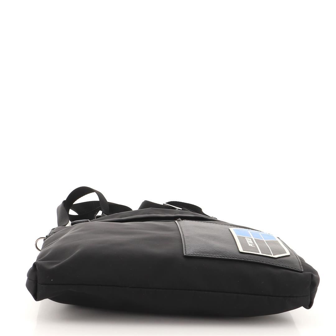 Prada Logo Patch Front Zip Messenger Bag Tessuto Medium. All available information is listed in the description and shown in the photos. Prada Logo Patch Front Zip Messenger Bag Tessuto Medium. Minor odor in interior. Wear, marks and creasing on exterior and in interior, scratches on hardware.