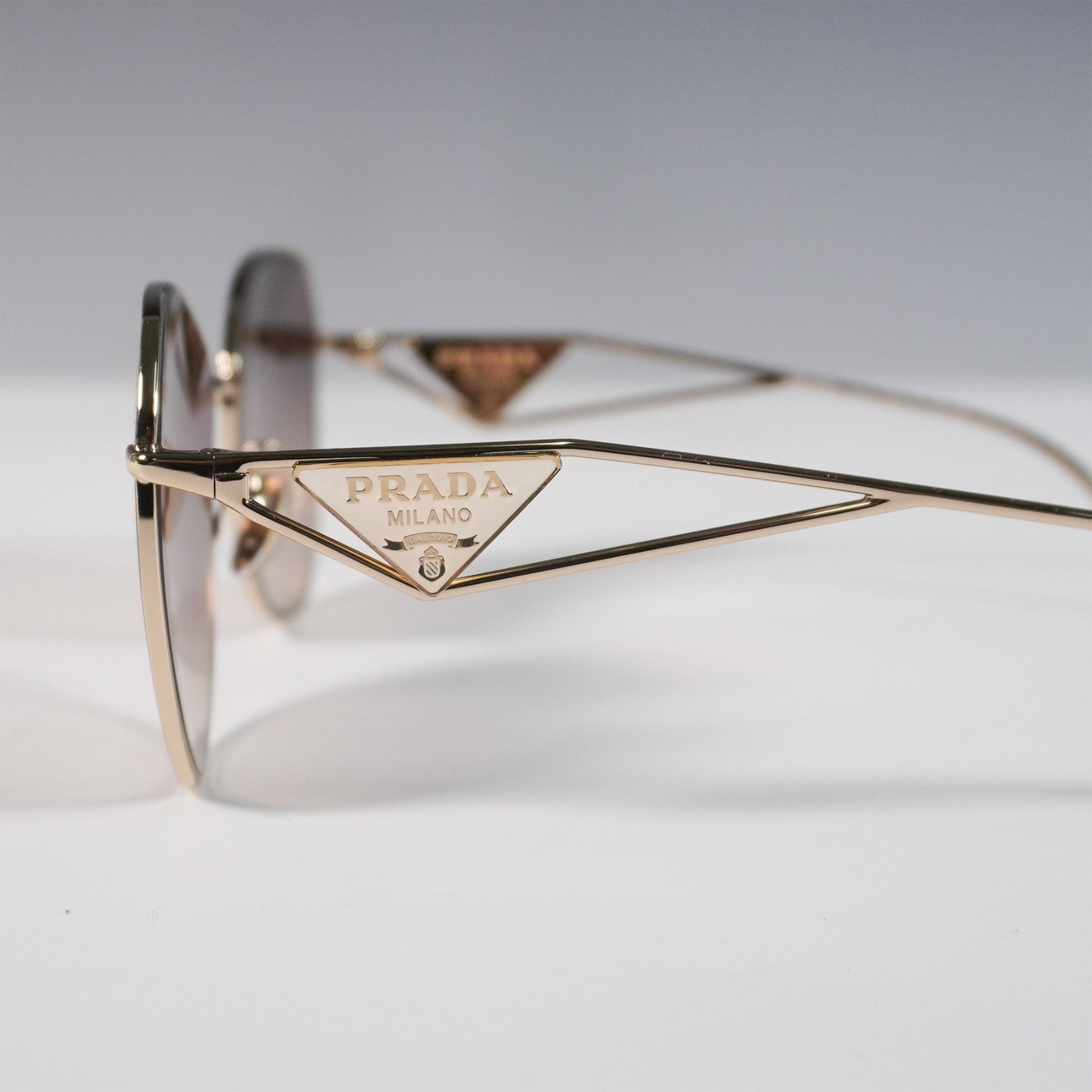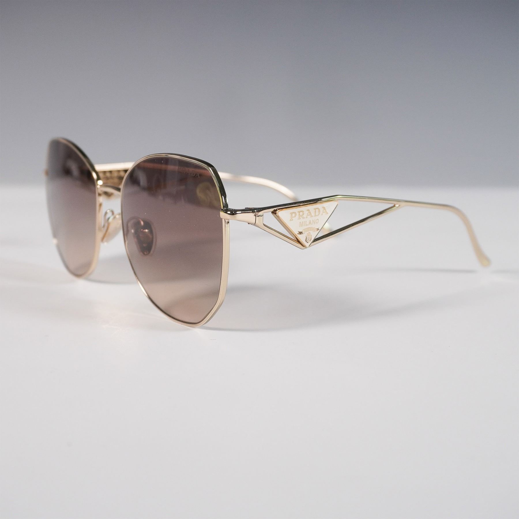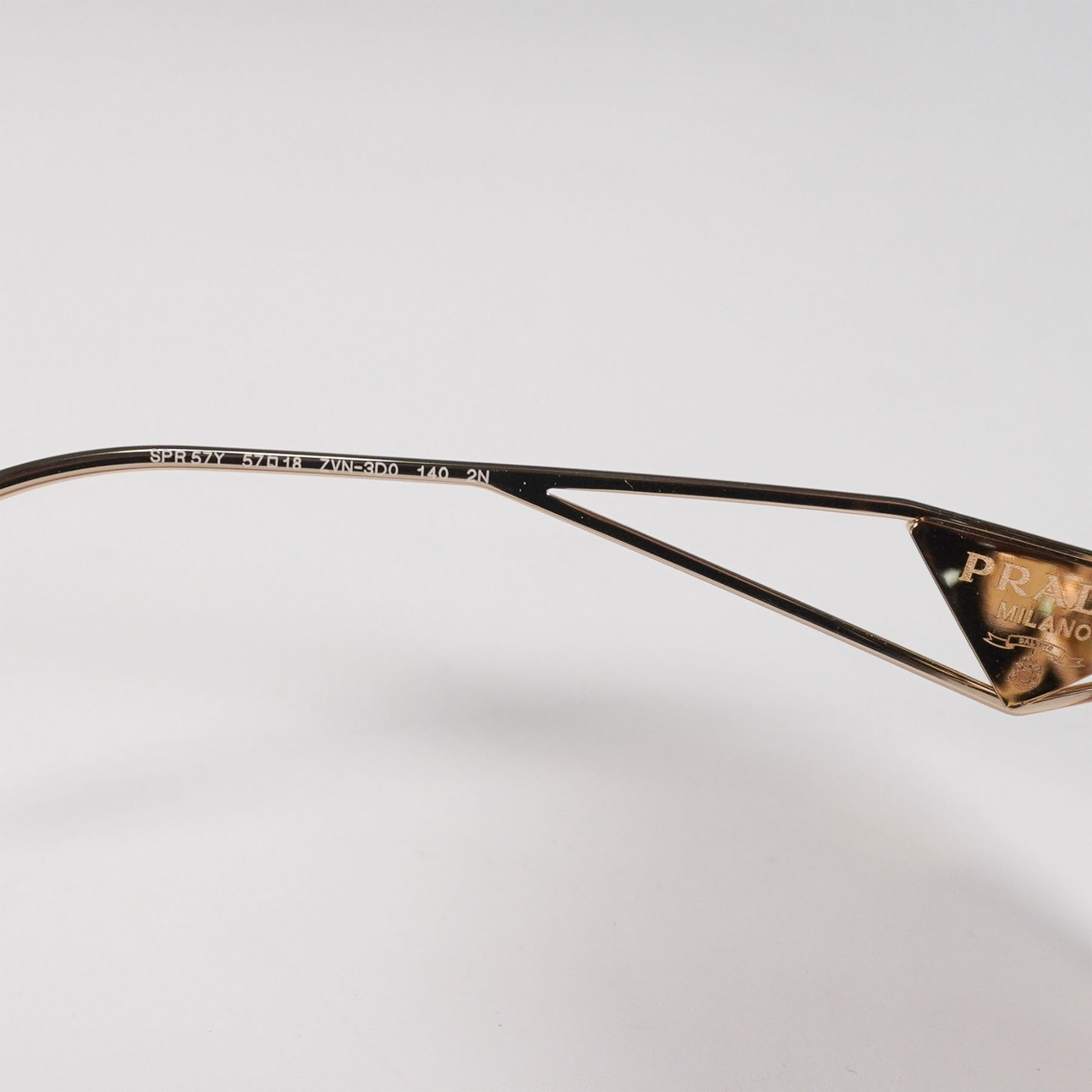 Prada Milano sunglasses featuring a gold-tone metal frame with geometric lenses and gradient brown tint. Distinctive openwork arms with Prada triangle logo detailing. Marked “SPR57Y†on the inner arm. Sleek, modern silhouette with luxury branding.
