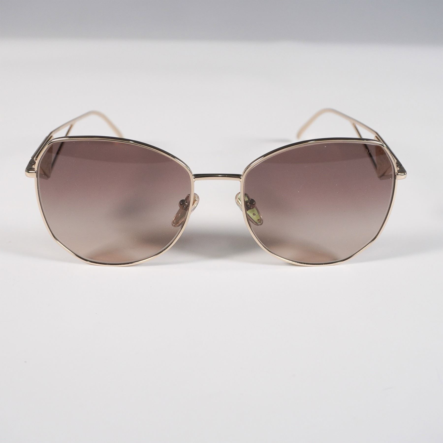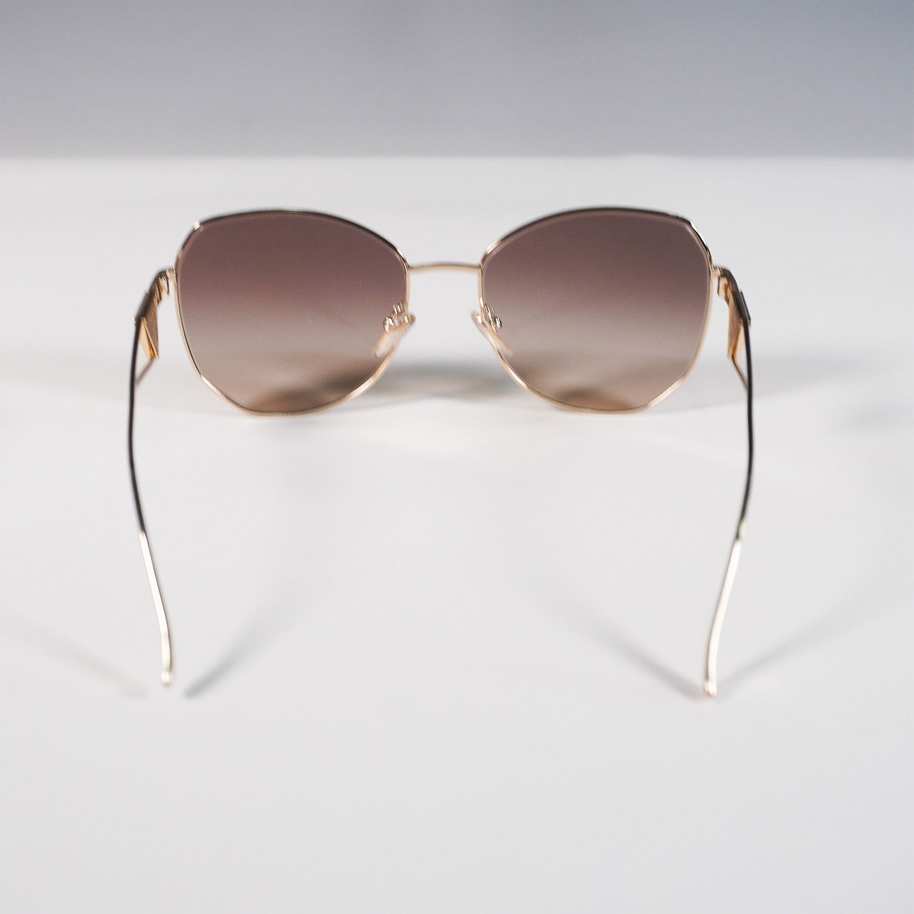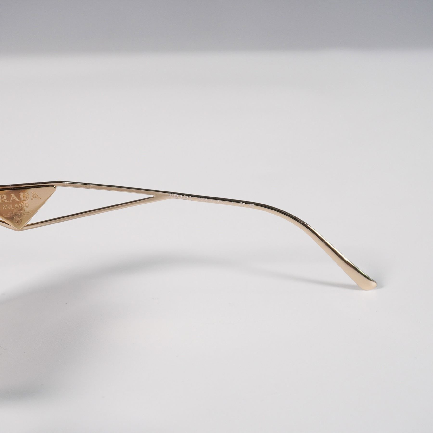 Prada Milano sunglasses featuring a gold-tone metal frame with geometric lenses and gradient brown tint. Distinctive openwork arms with Prada triangle logo detailing. Marked “SPR57Y†on the inner arm. Sleek, modern silhouette with luxury branding.