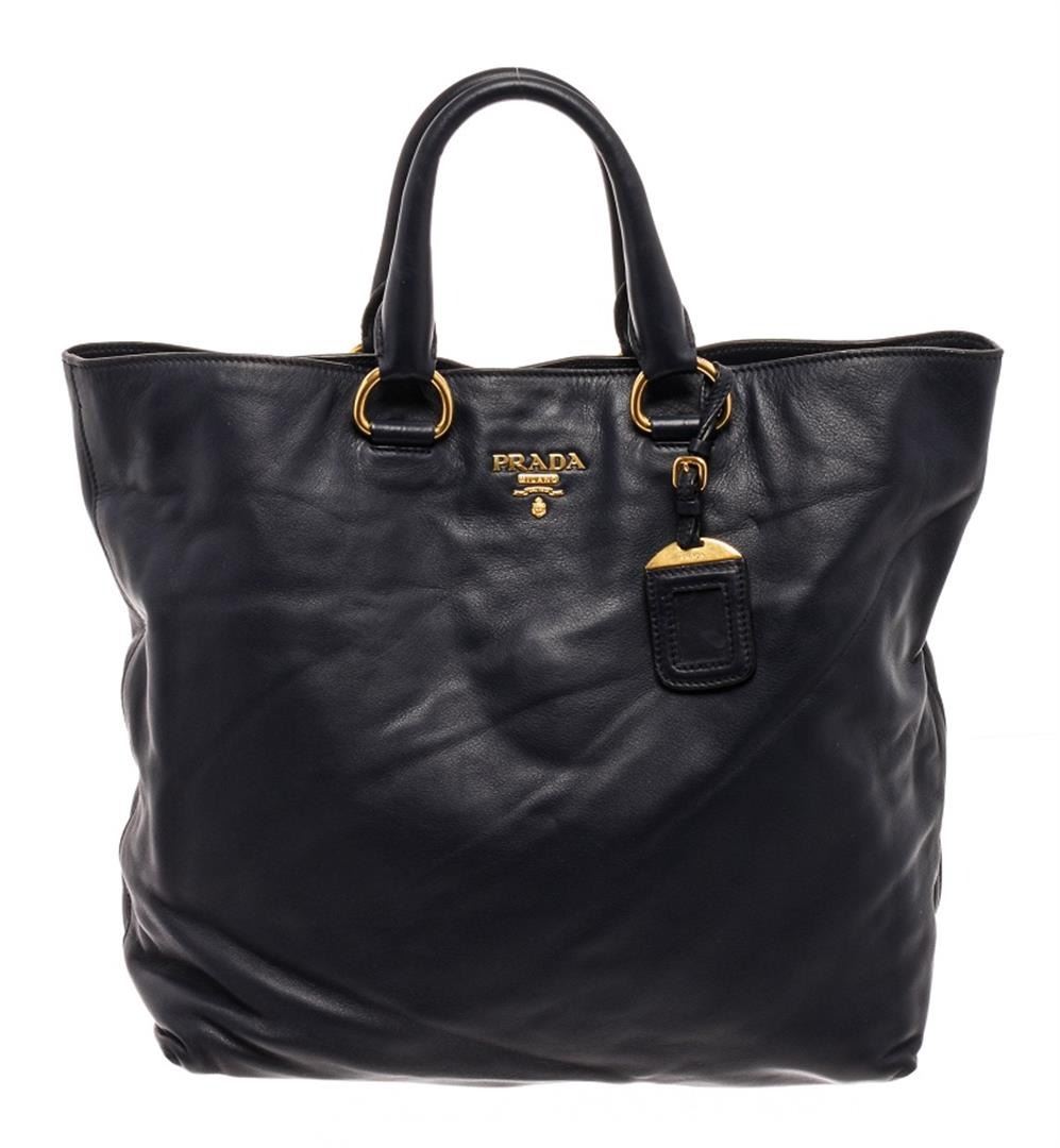 Prada Navy Leather 2Way Shoulder Bag. All available information is listed in the description and shown in the photos. Prada Navy Leather 2Way Shoulder Bag with black leather, logo lettering, transparent id slot tag, concealed magnetic fastening, two top handles, internal zip pocket, internal logo patch, leather lining, gold-tone hardware, square body. Height: 14.5" Width: 16.9" Depth: 1.57", Handle Drop: 5.11" / 37 x 43 x 4 Cm