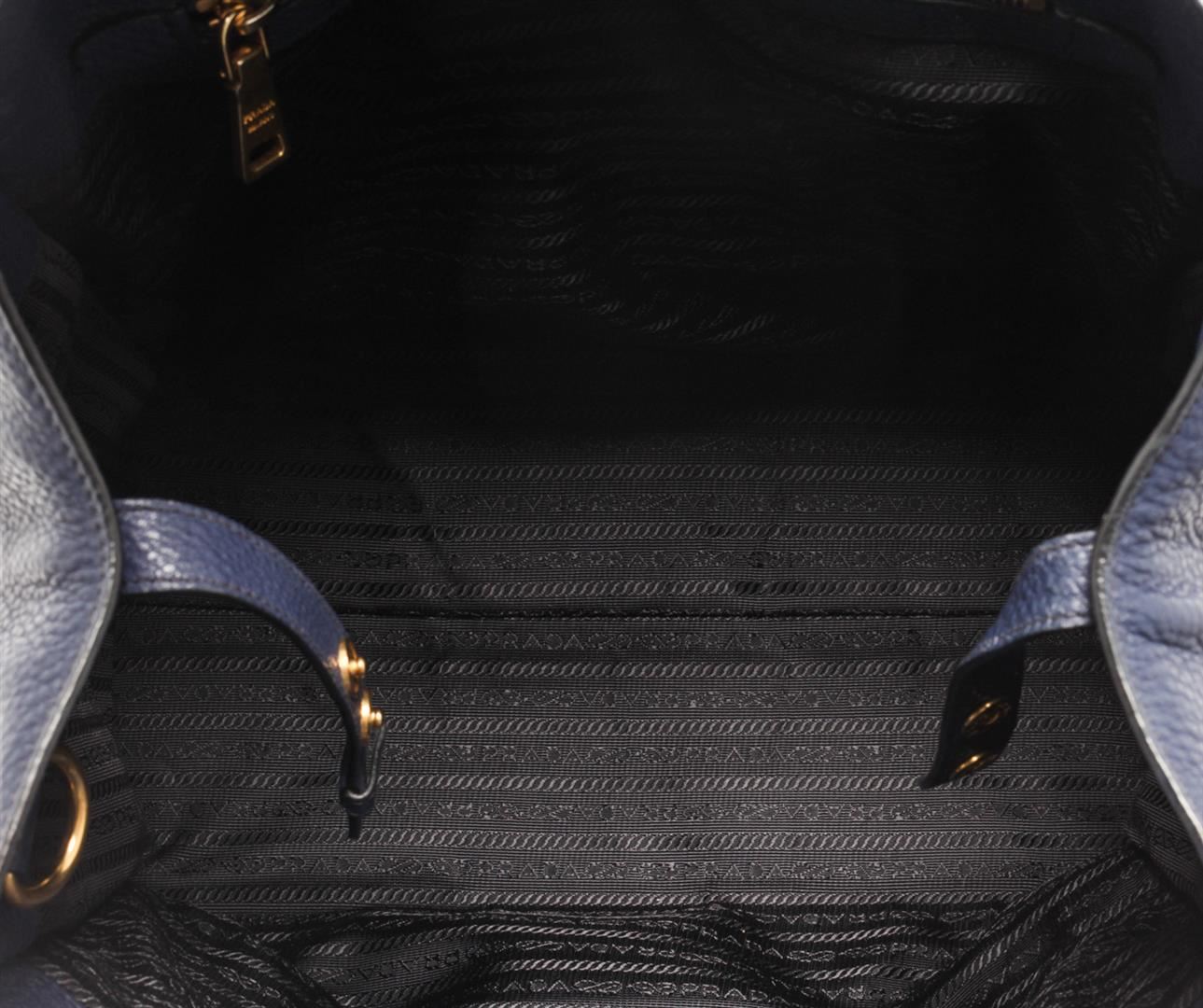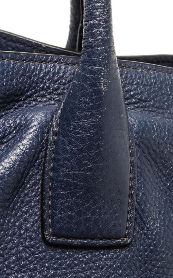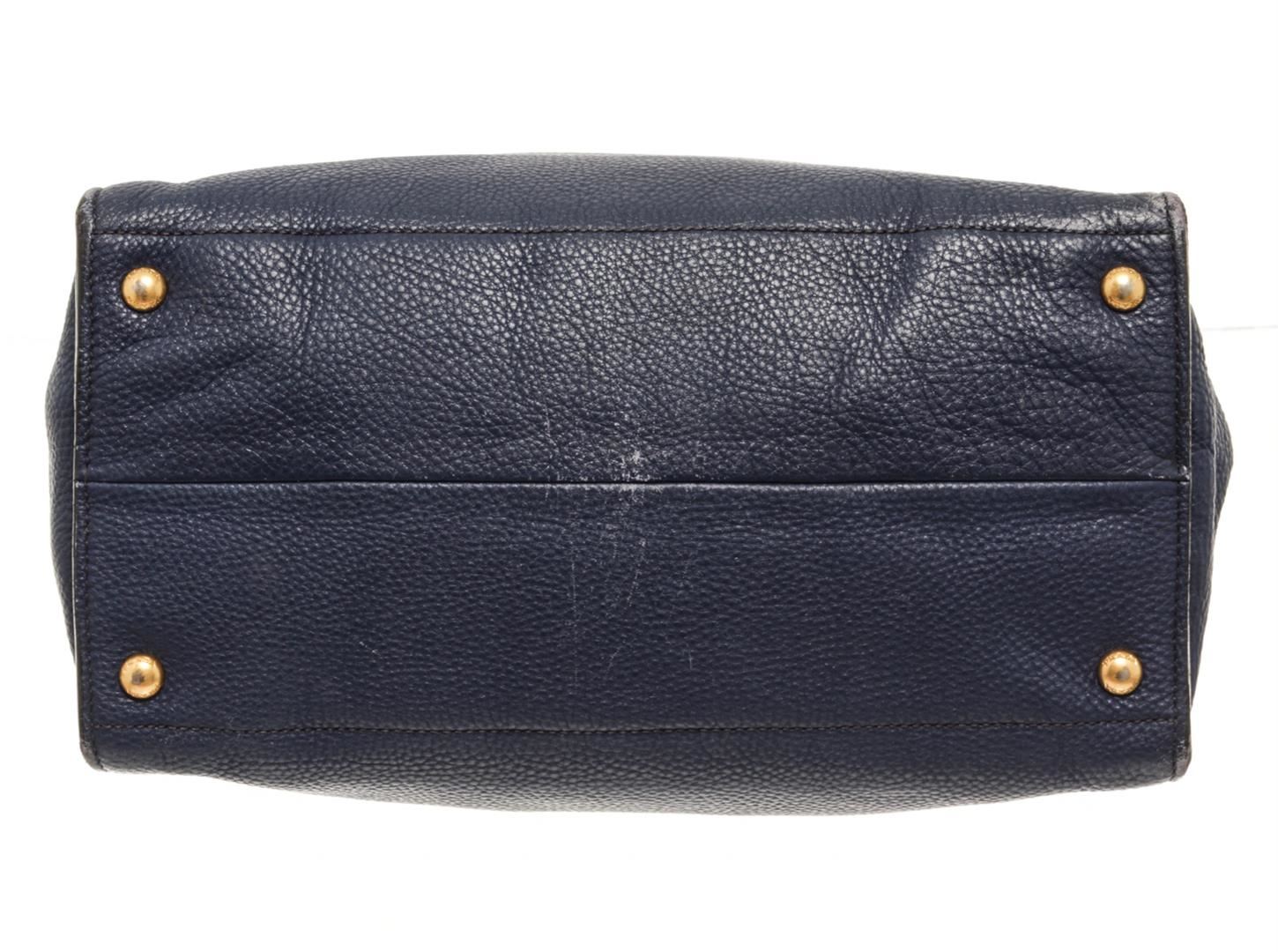 One Prada Navy Leather Tote Bag. Item is sold AS-IS. All available information is listed in the description and shown in the photo. Prada Navy Leather Tote Bag with top handle, fabric lining, interior zipper pocket, button closure and gold tone hardware. There is some wear on the leather, a white mark on the front, wear on the handles and marks on the bottom. Please refer to photos. 13"L x 13"W x 6"H / height : 32 cm width : 33 cm depth : 16 cm