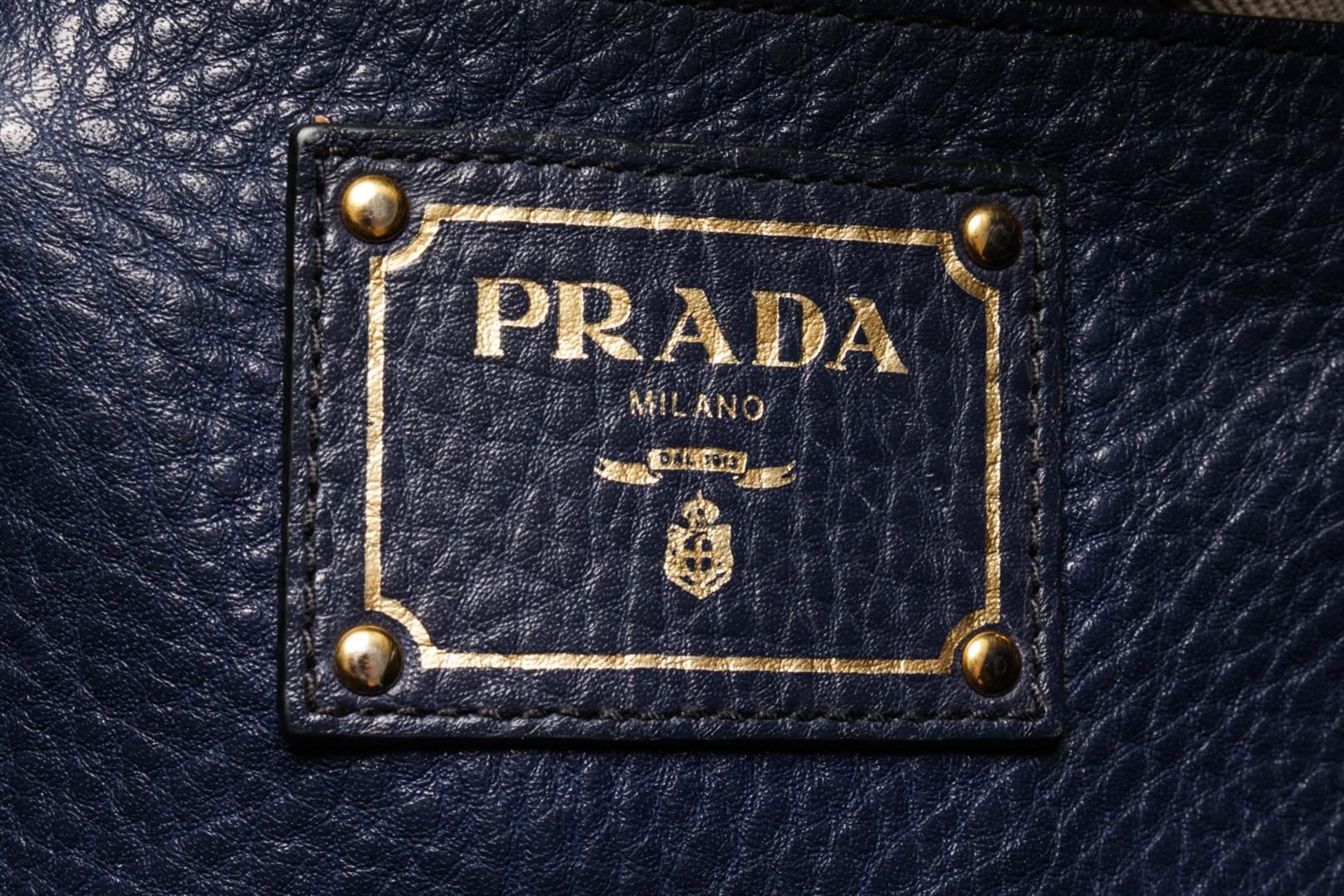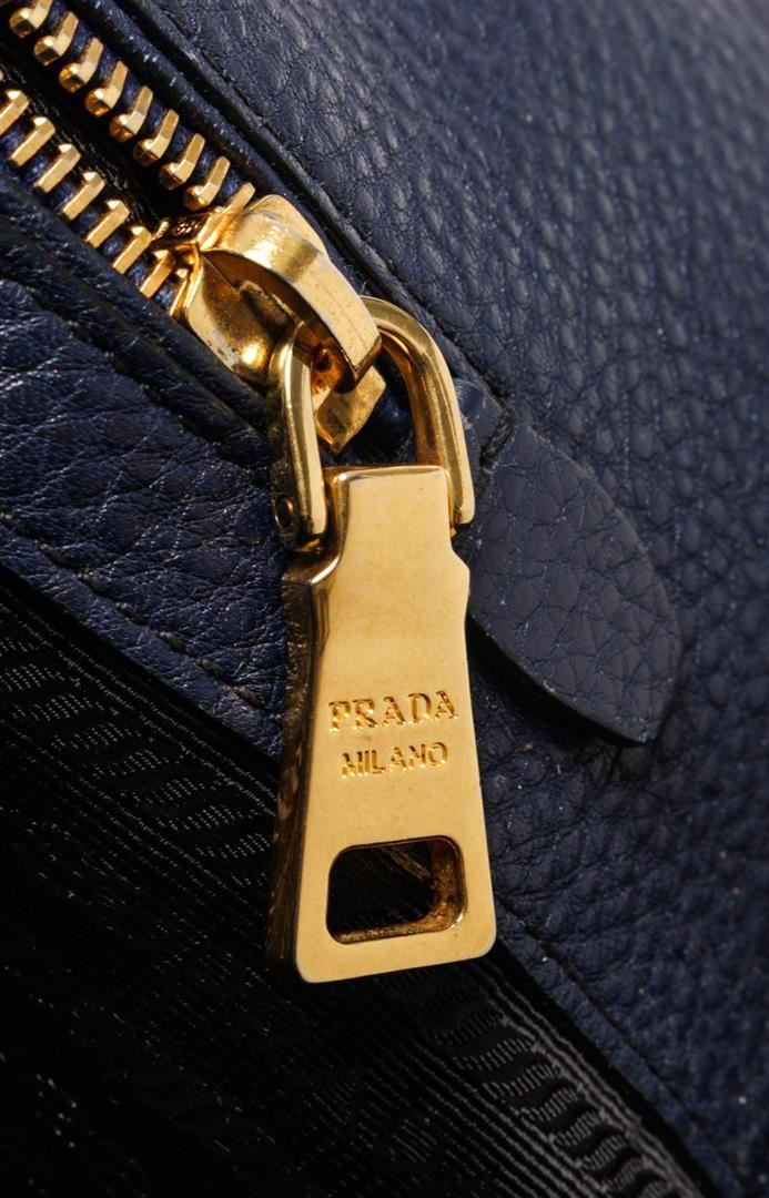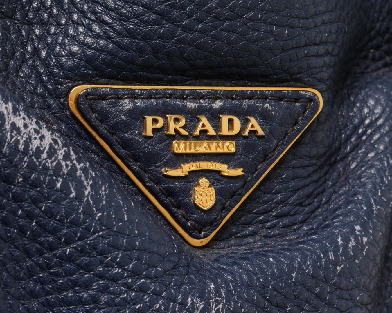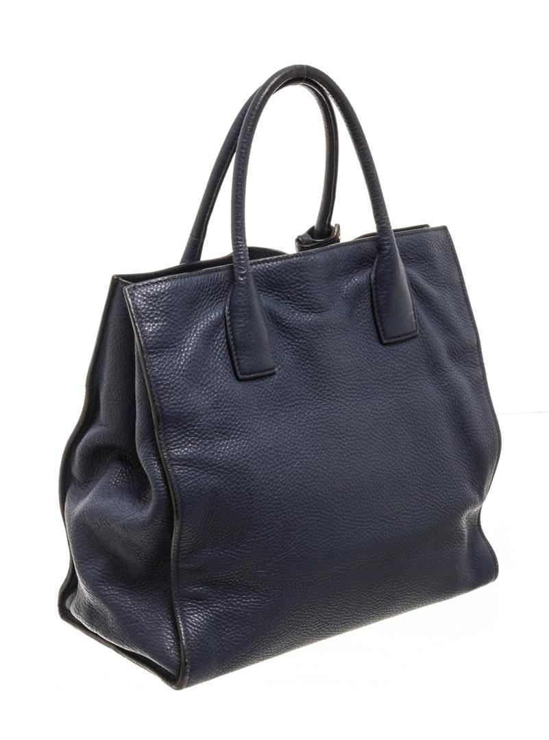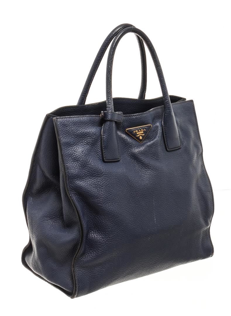 One Prada Navy Leather Tote Bag. Item is sold AS-IS. All available information is listed in the description and shown in the photo. Prada Navy Leather Tote Bag with top handle, fabric lining, interior zipper pocket, button closure and gold tone hardware. There is some wear on the leather, a white mark on the front, wear on the handles and marks on the bottom. Please refer to photos. 13"L x 13"W x 6"H / height : 32 cm width : 33 cm depth : 16 cm