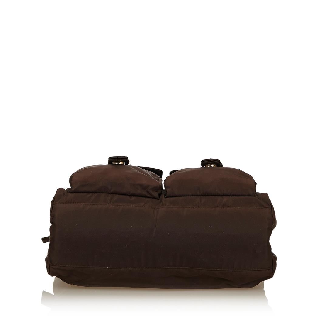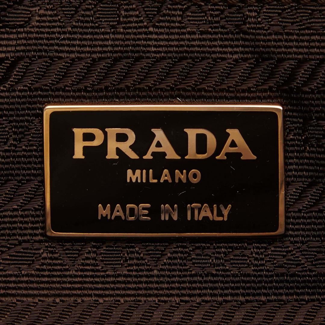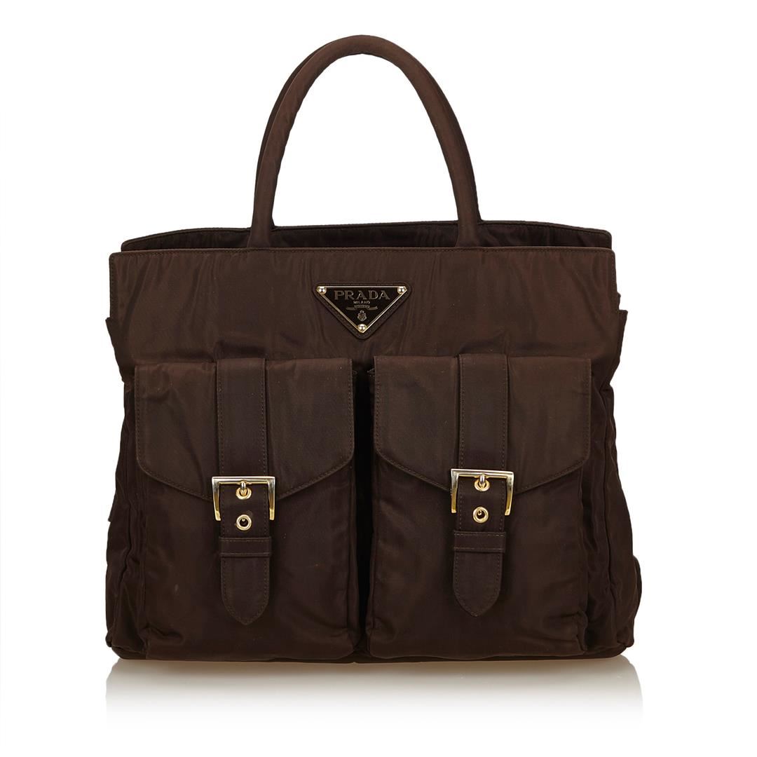 One Prada Nylon Handbag. This handbag features a nylon body, exterior flap pockets with belt details, rolled handles, and interior zip pockets.