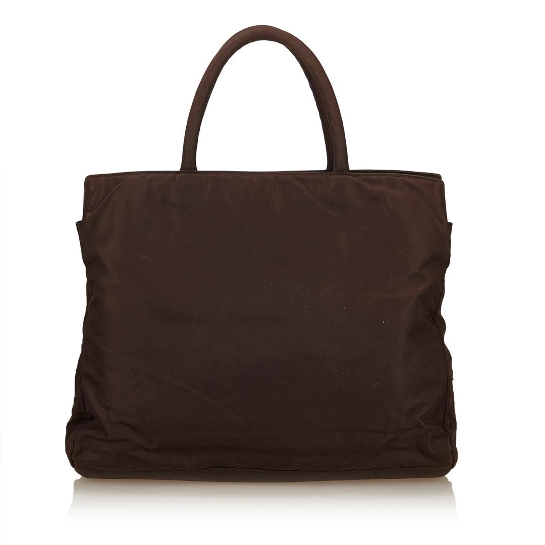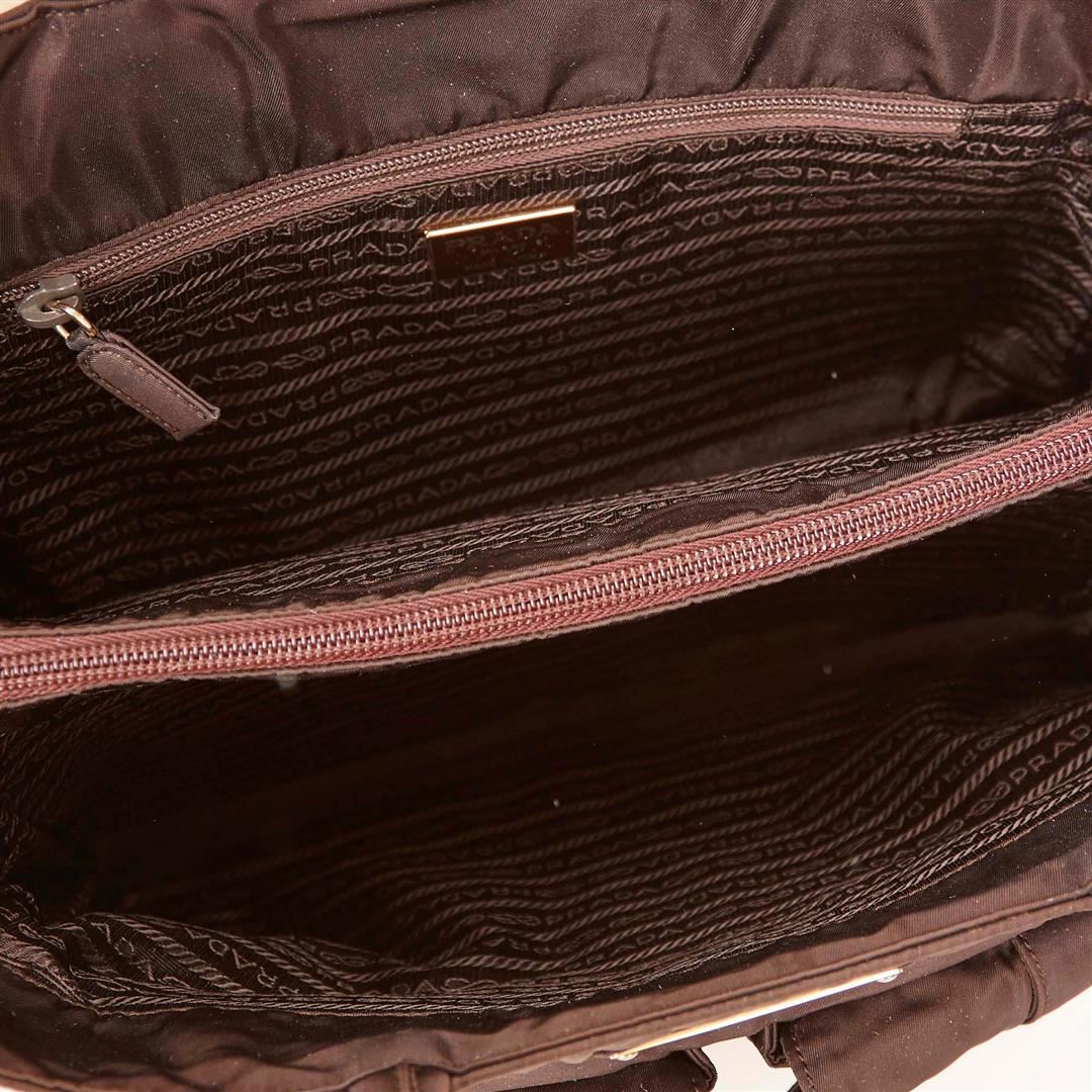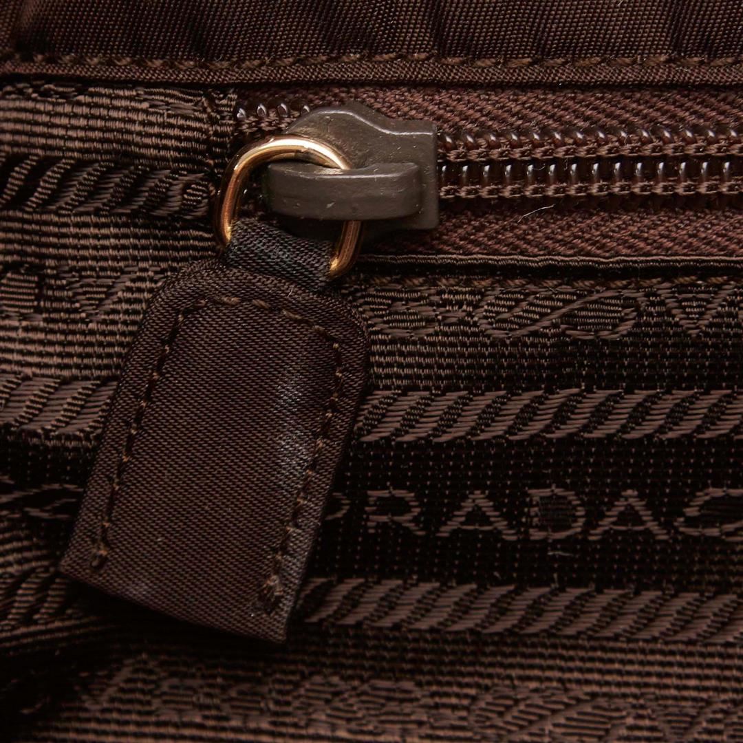 One Prada Nylon Handbag. This handbag features a nylon body, exterior flap pockets with belt details, rolled handles, and interior zip pockets.