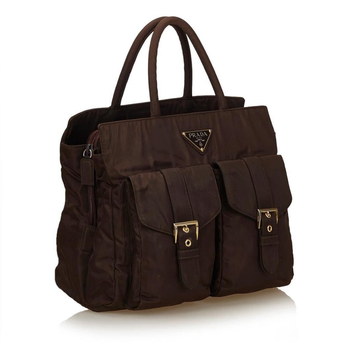 One Prada Nylon Handbag. This handbag features a nylon body, exterior flap pockets with belt details, rolled handles, and interior zip pockets.