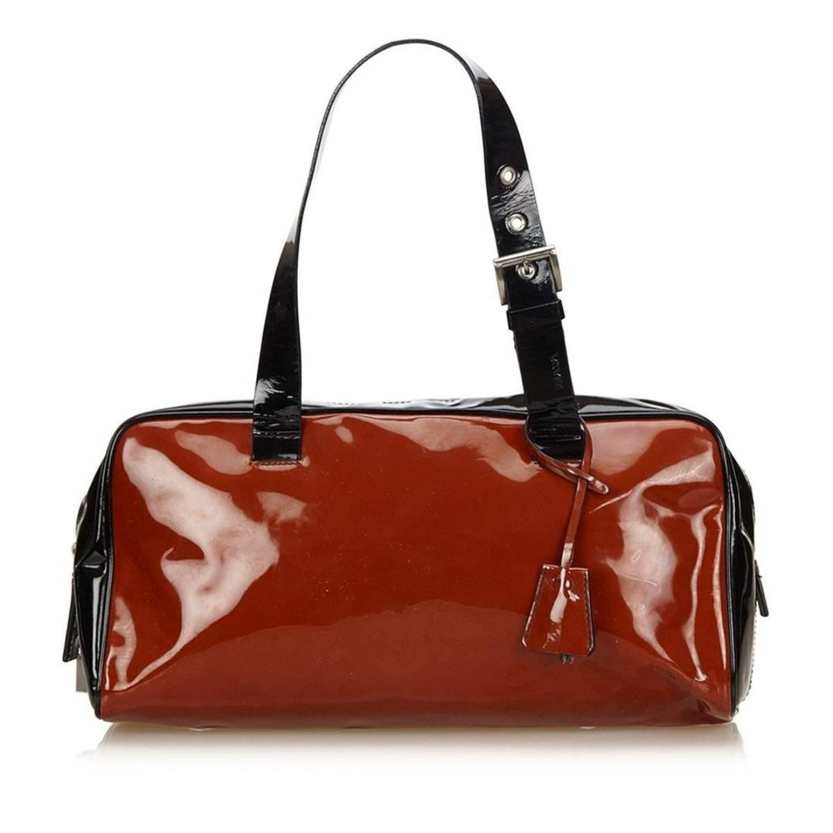 This handbag features a patent leather body, flat leather handles with belt details, top zip closure, and interior zip pocket. Measurements: Length: 32.5 in / 83 cm Width: 20.5 in / 52 cm 11 in / 28 cmCONDITION: Pre-Owned Good overall, please see photographs for detail.