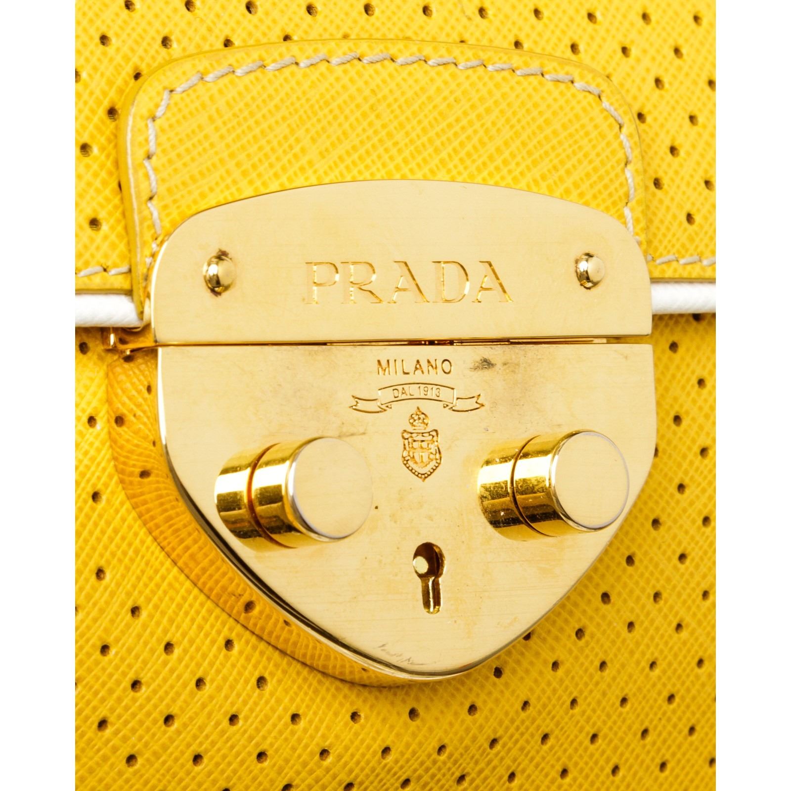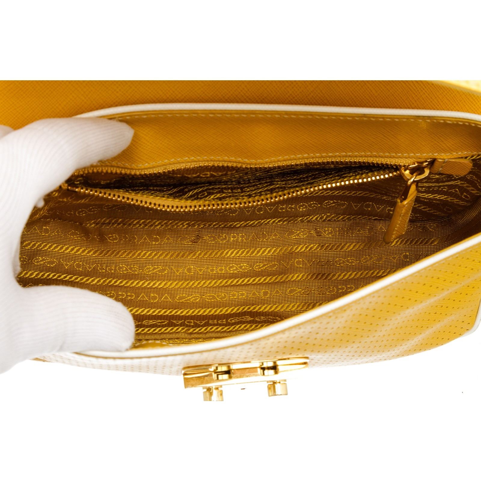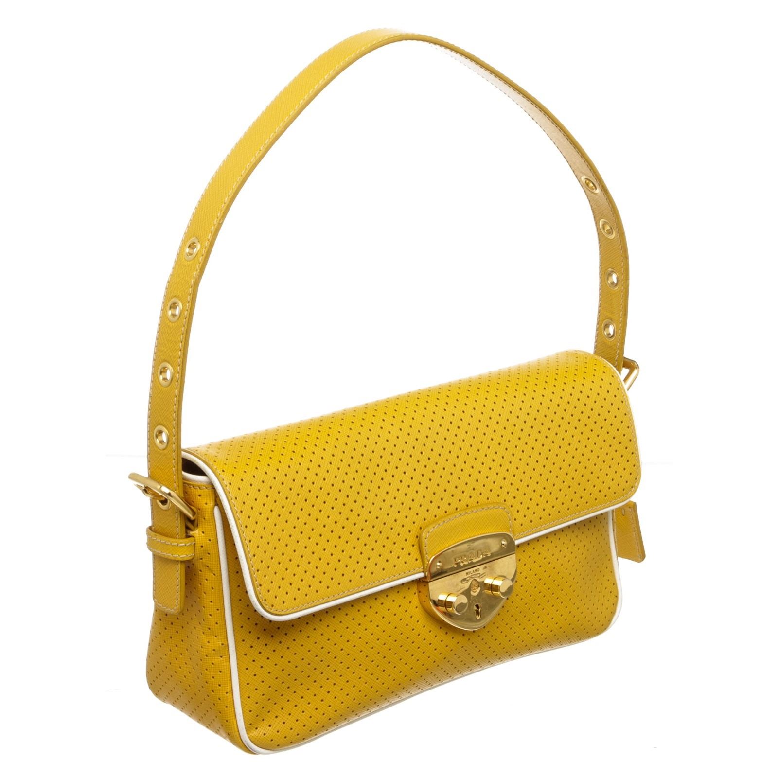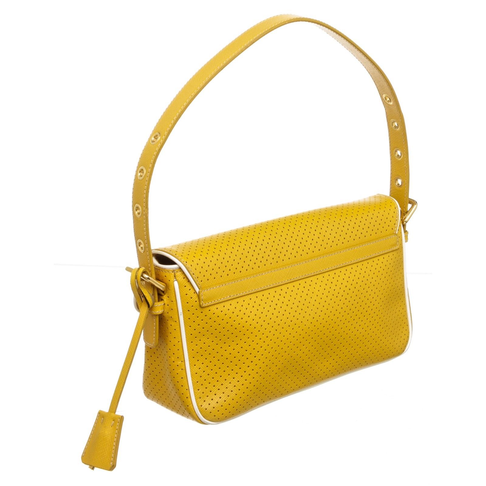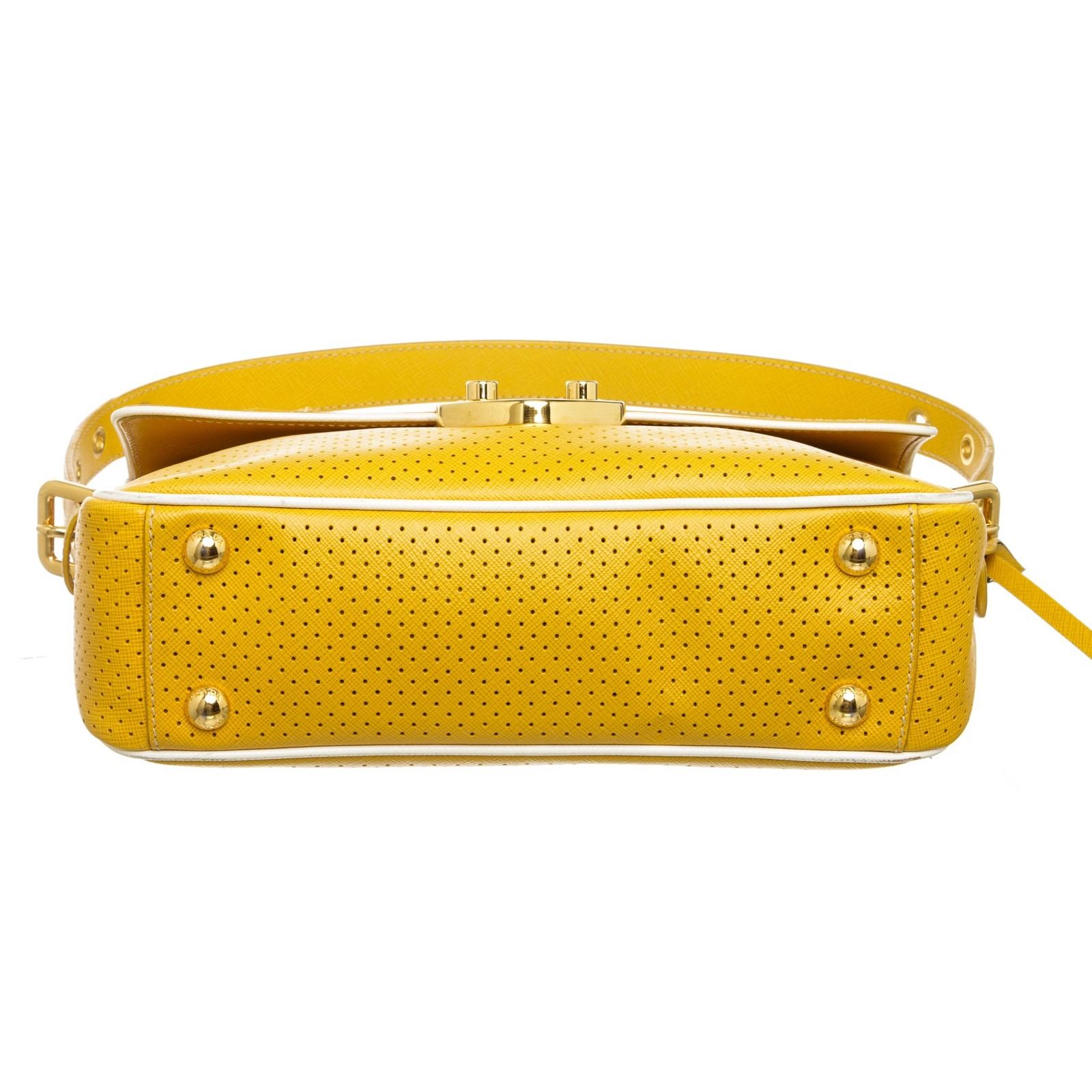 Description: Prada Yellow Perforated Leather Shoulder Bag. Prada yellow perforated leather shoulder bag with gold-tone hardware, yellow fabric lining, interior zip pocket, adjustable shoulder strap, flap with pinch-lock closure.