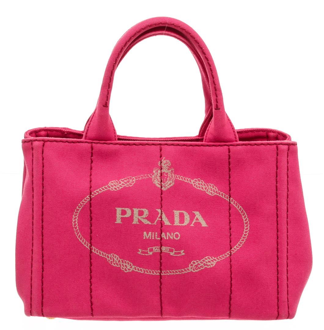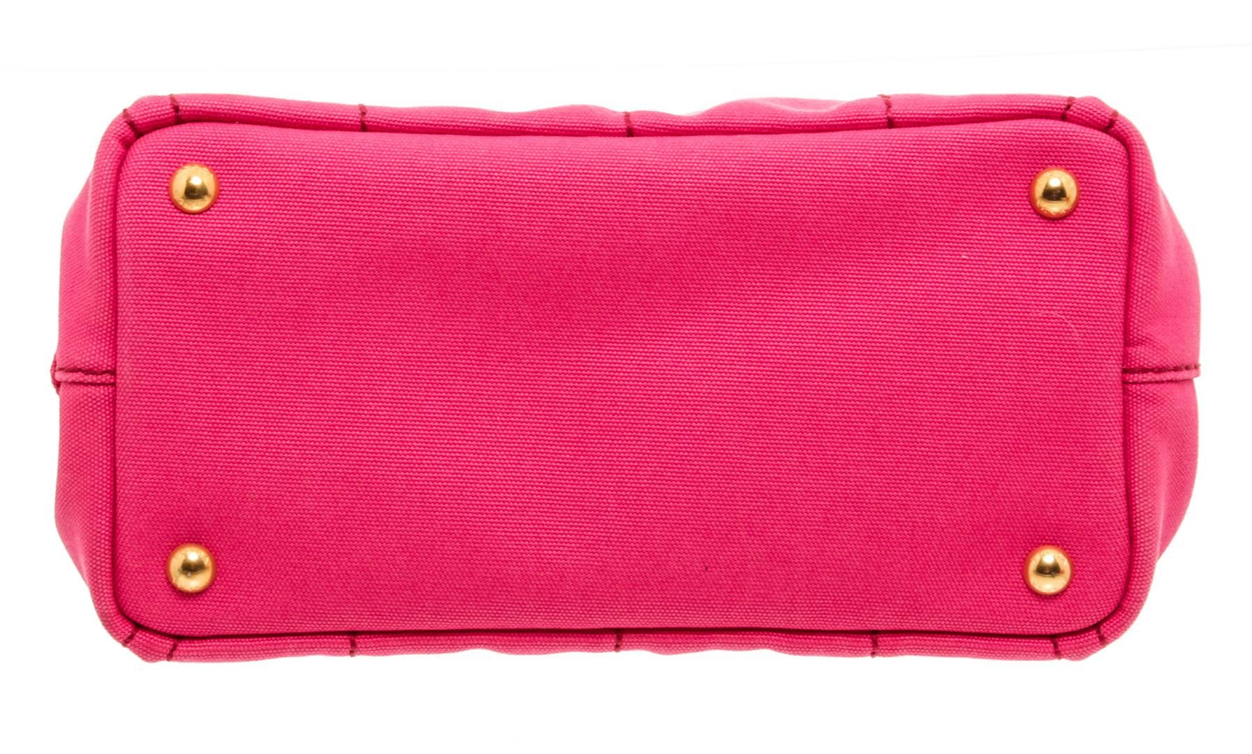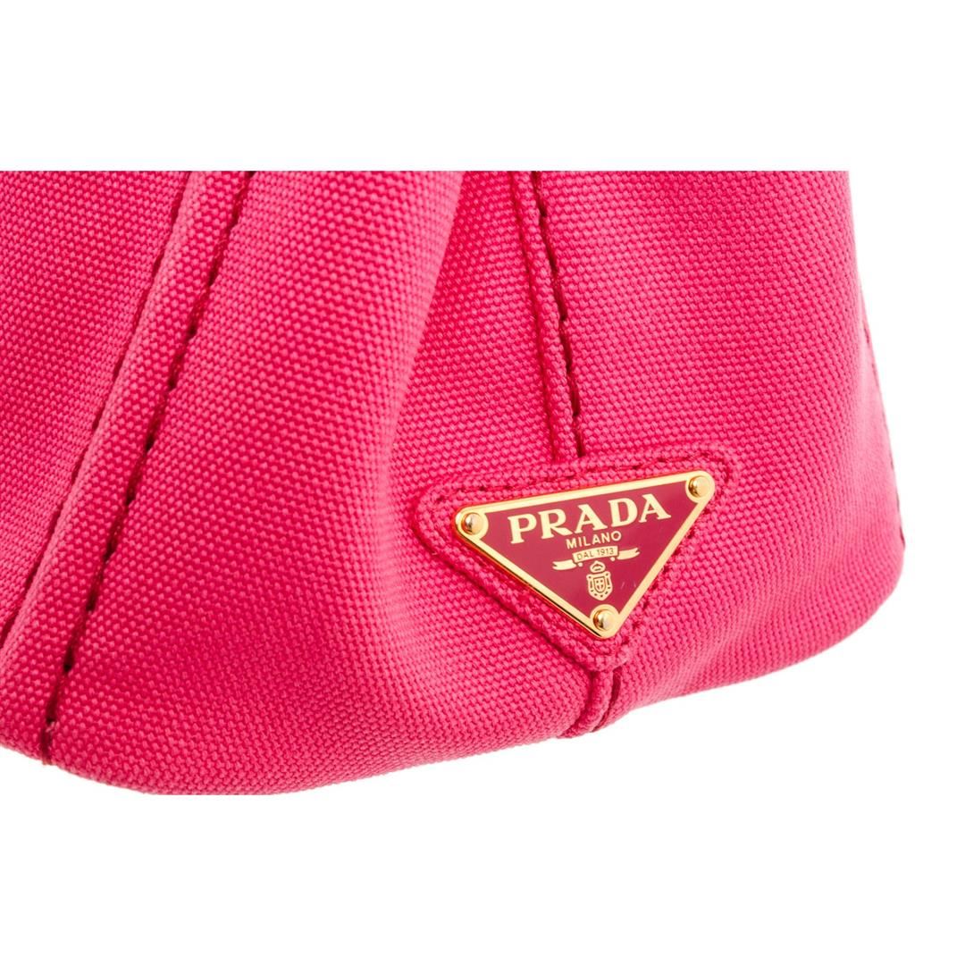 Prada pink canvas Canapa tote bag with dual interior zip pockets, interior slip pockets, side snaps, front logo print, optional adjustable shoulder strap. Authentic.