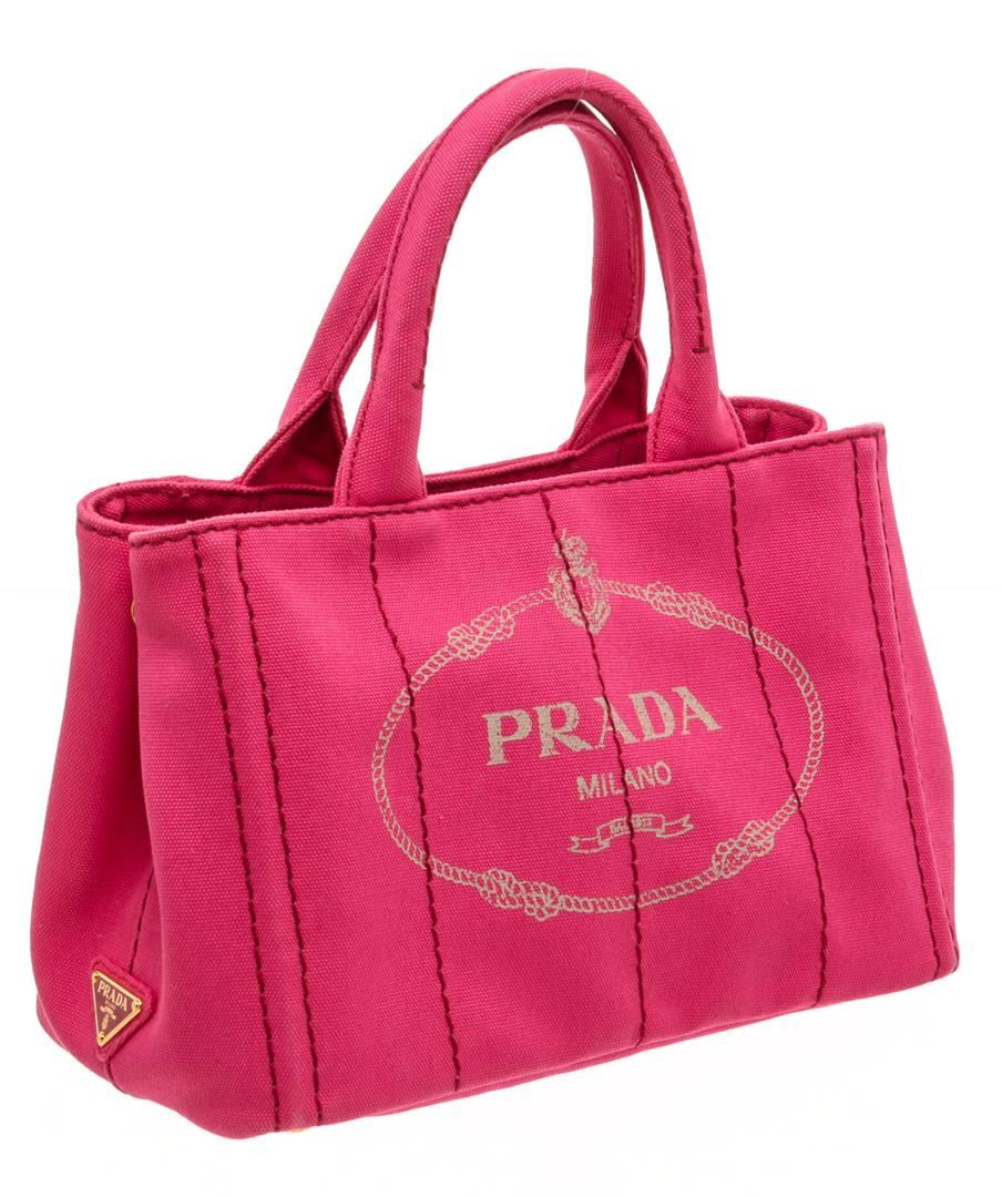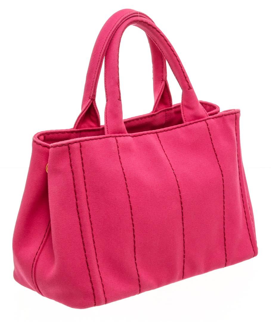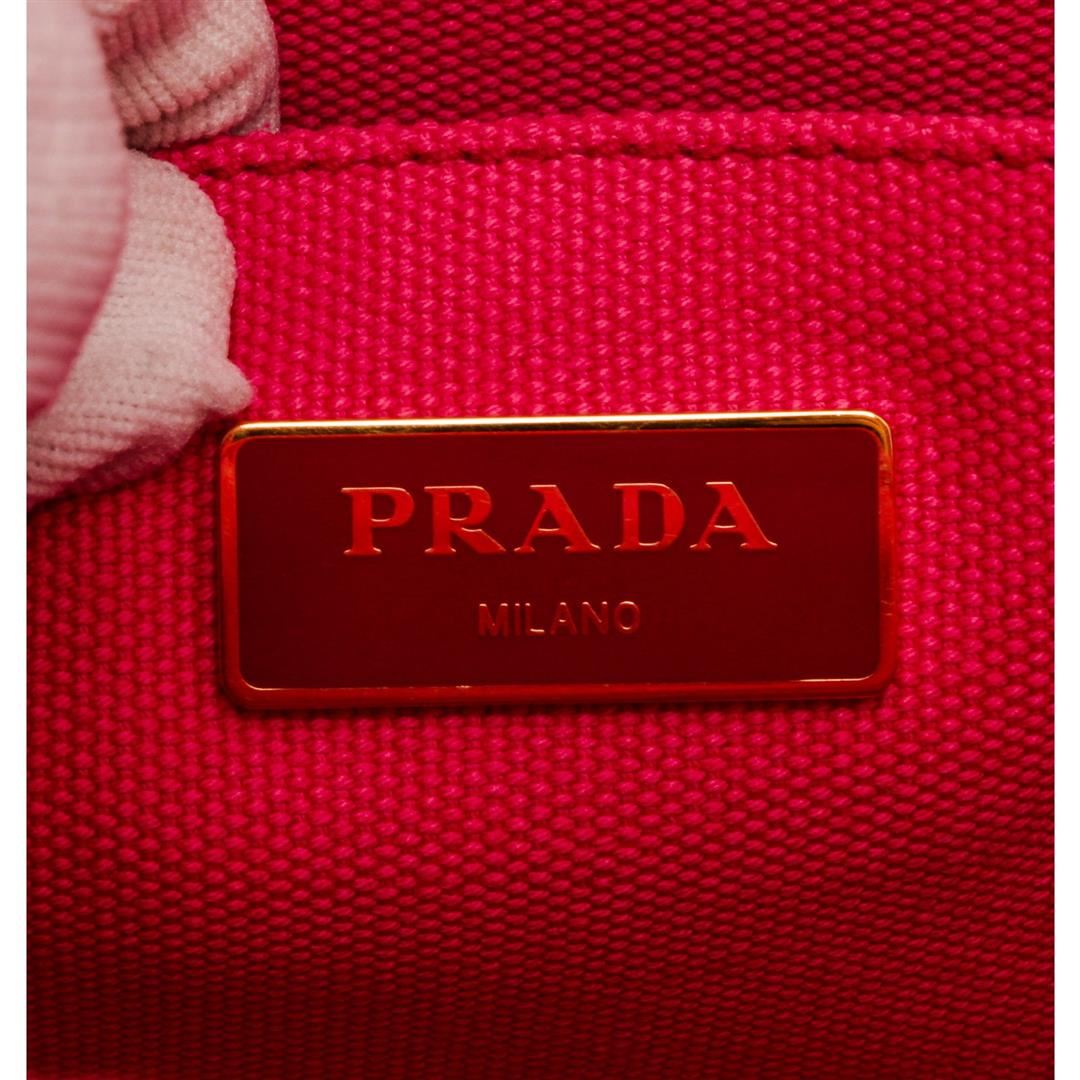 Prada pink canvas Canapa tote bag with dual interior zip pockets, interior slip pockets, side snaps, front logo print, optional adjustable shoulder strap. Authentic.
