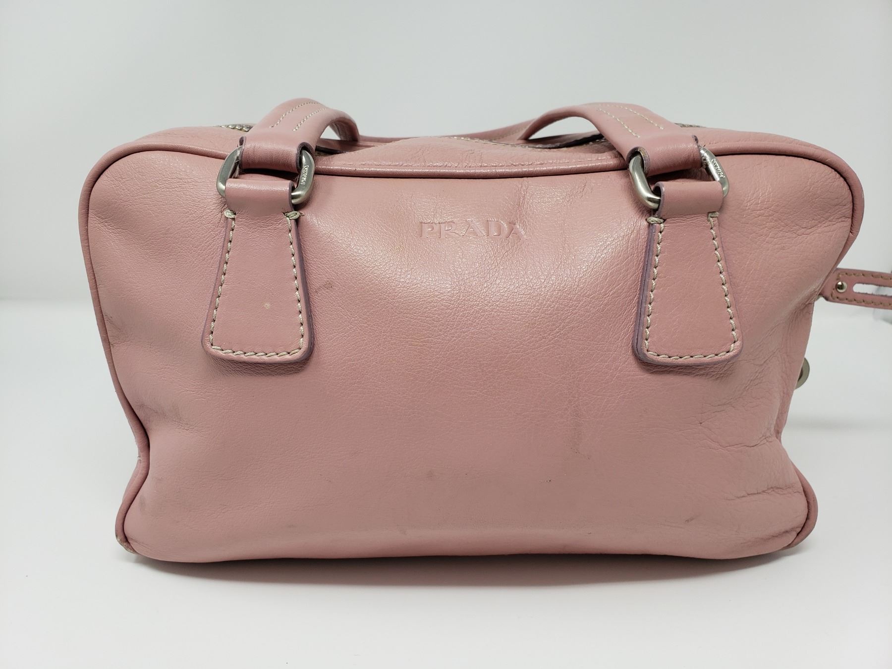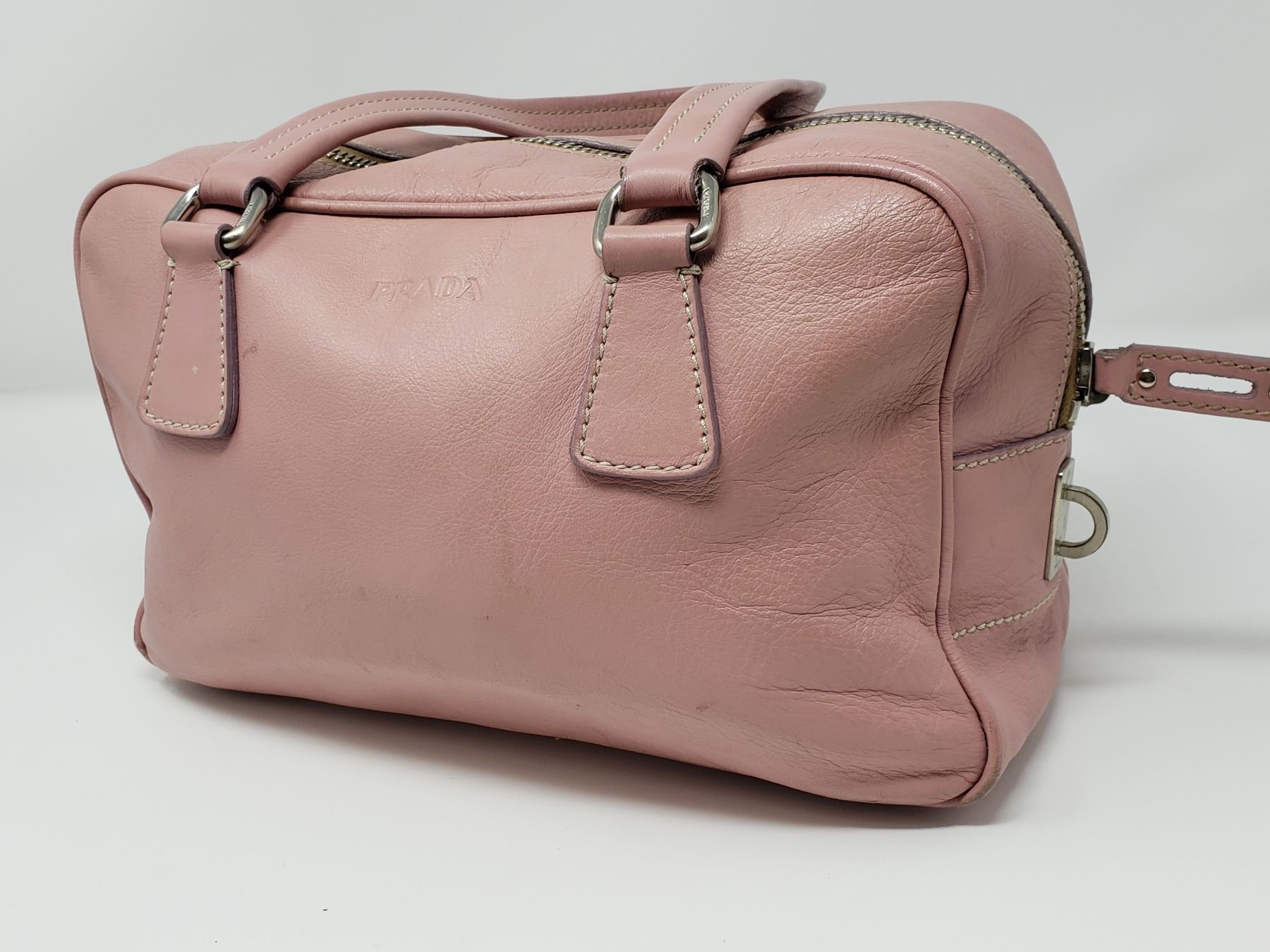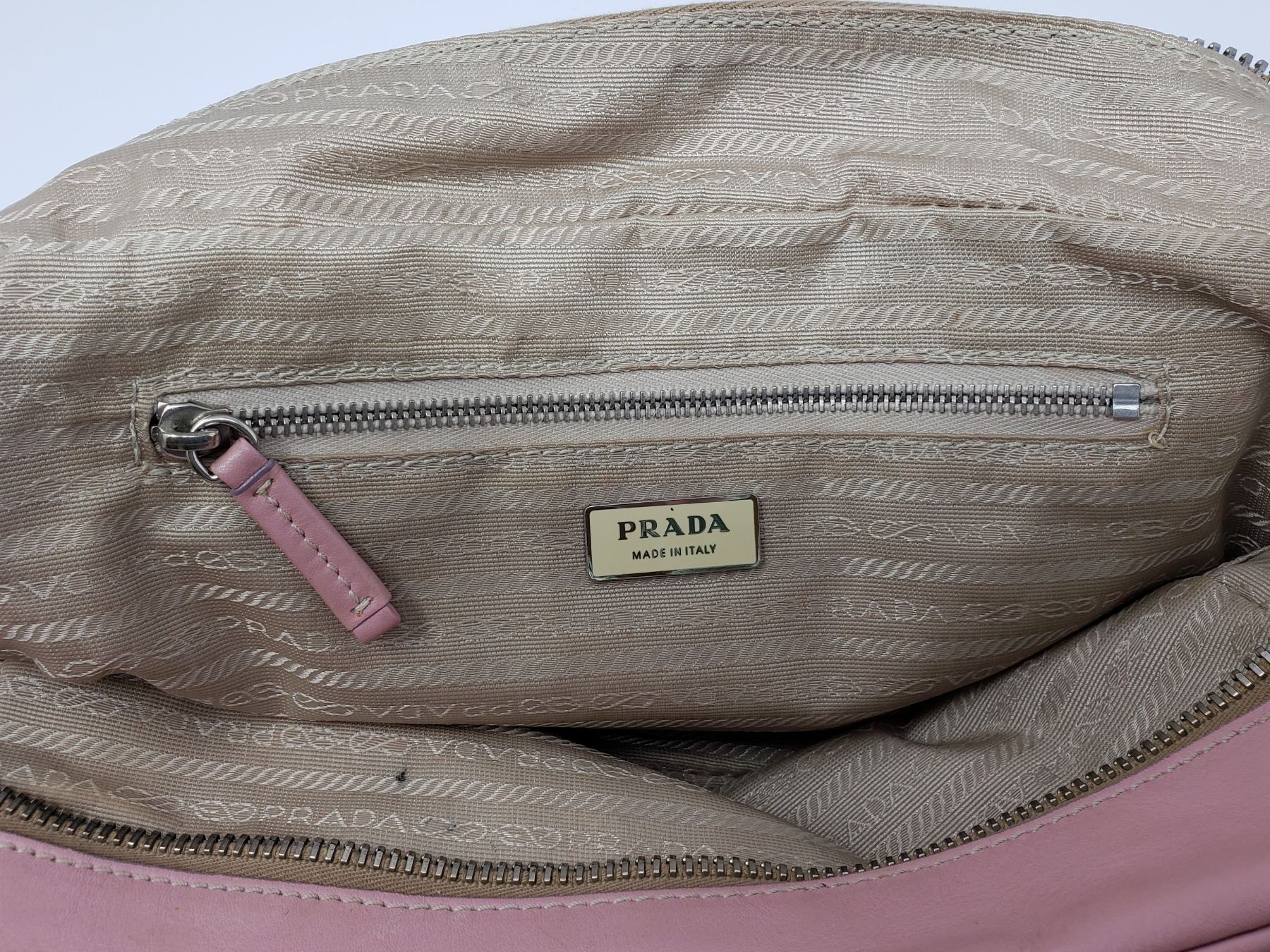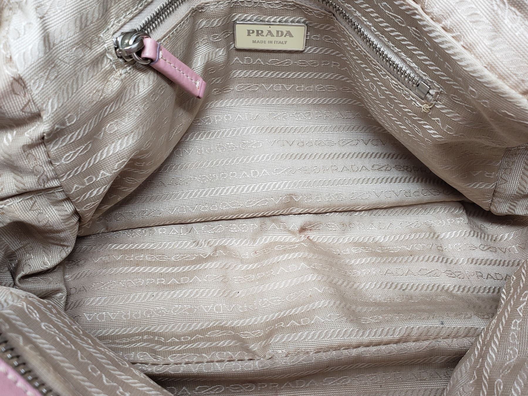 Description: Prada Pink Leather Handbag . Address Tag on Outside . Pink Leather Handles . Silver Zipper with Pink Leather Zipper pull . One inside zippered Pocket , Champagne Satin lining with Prada Logo .