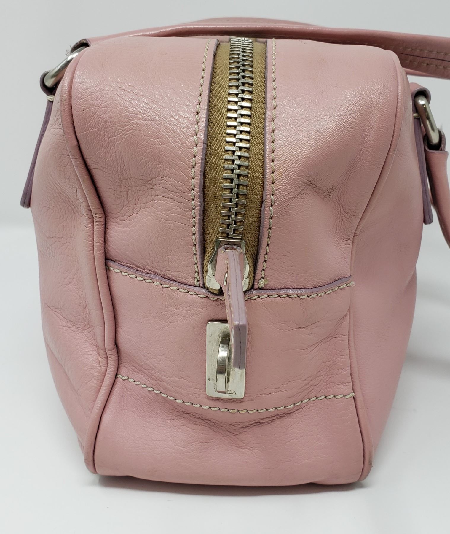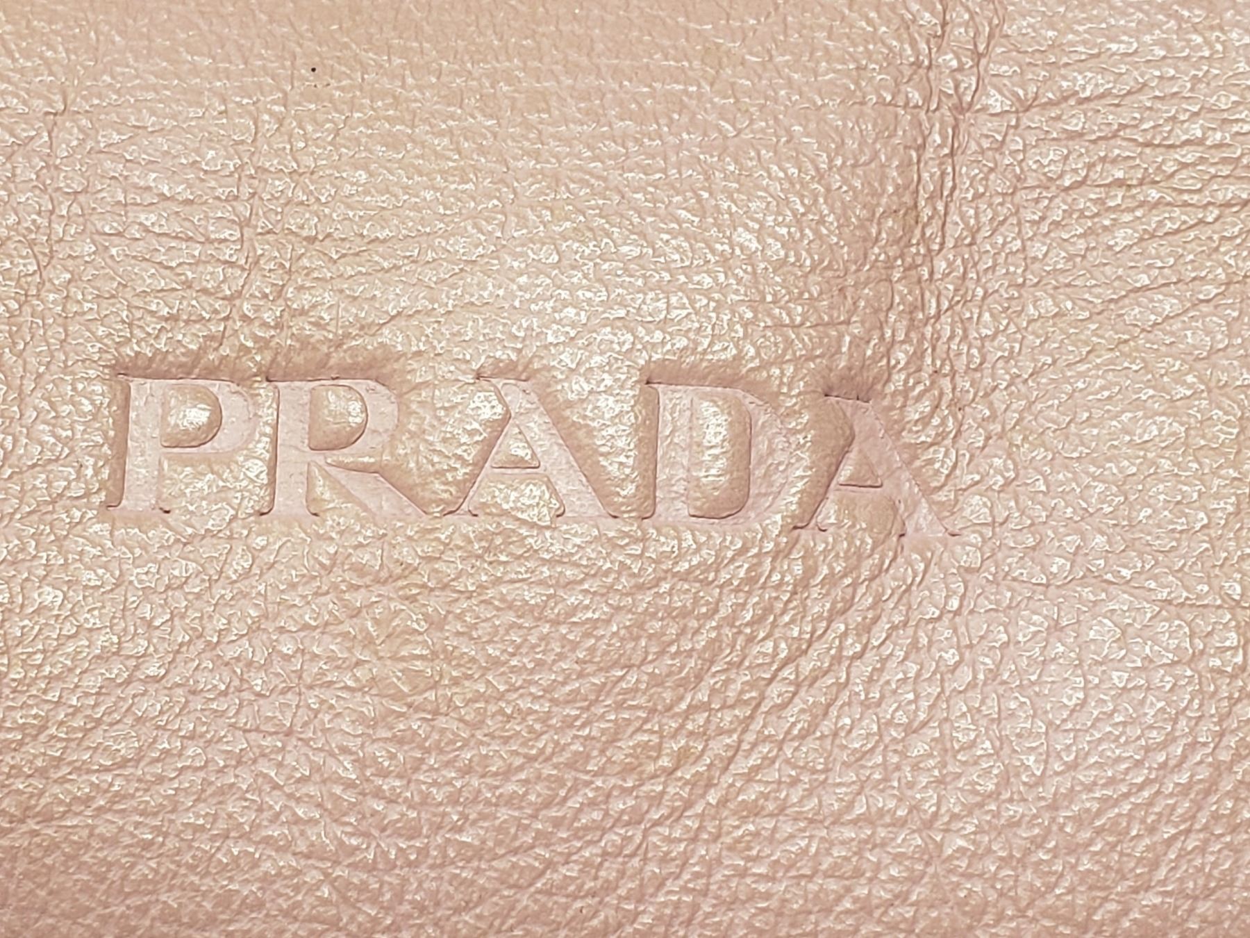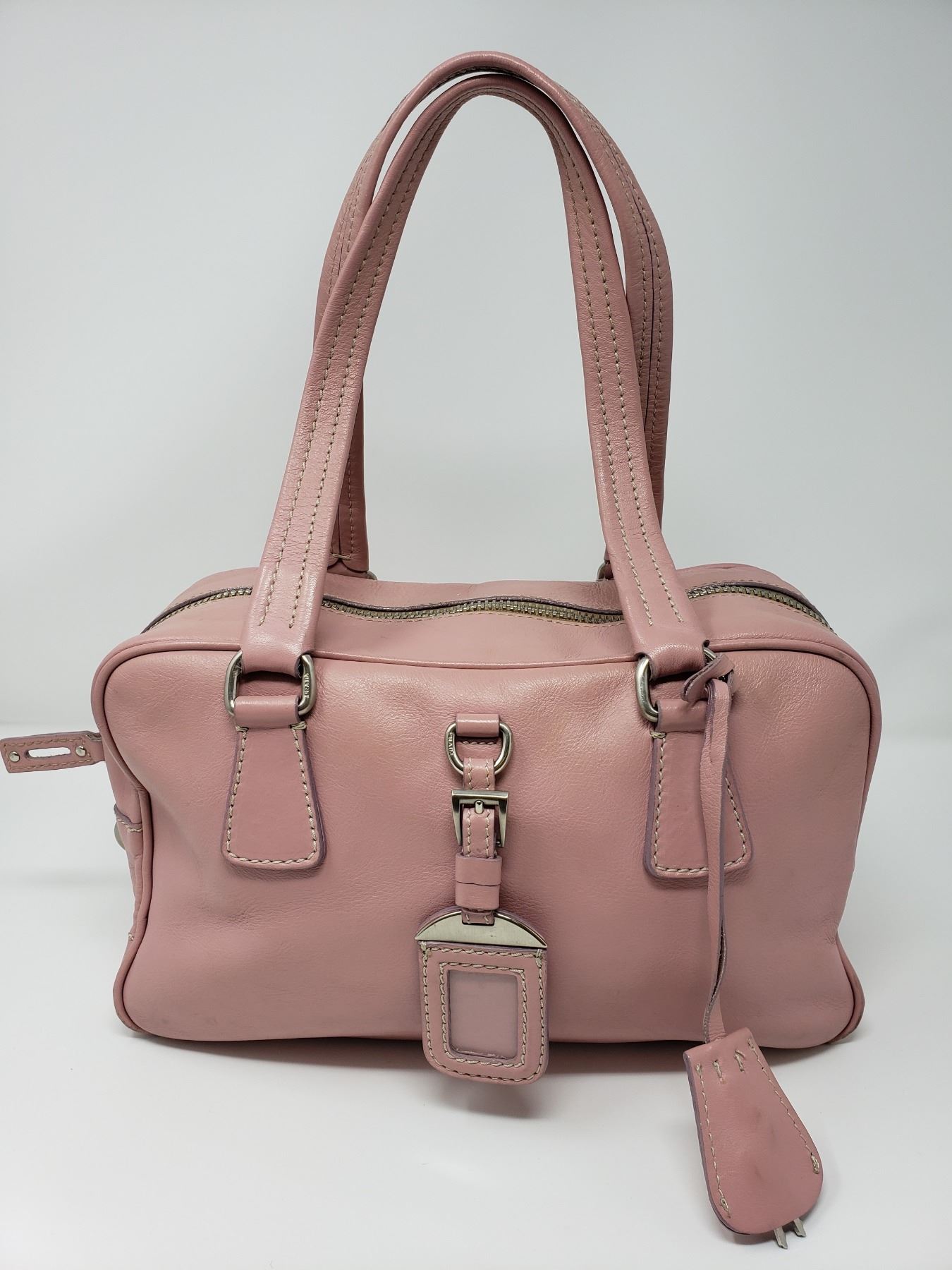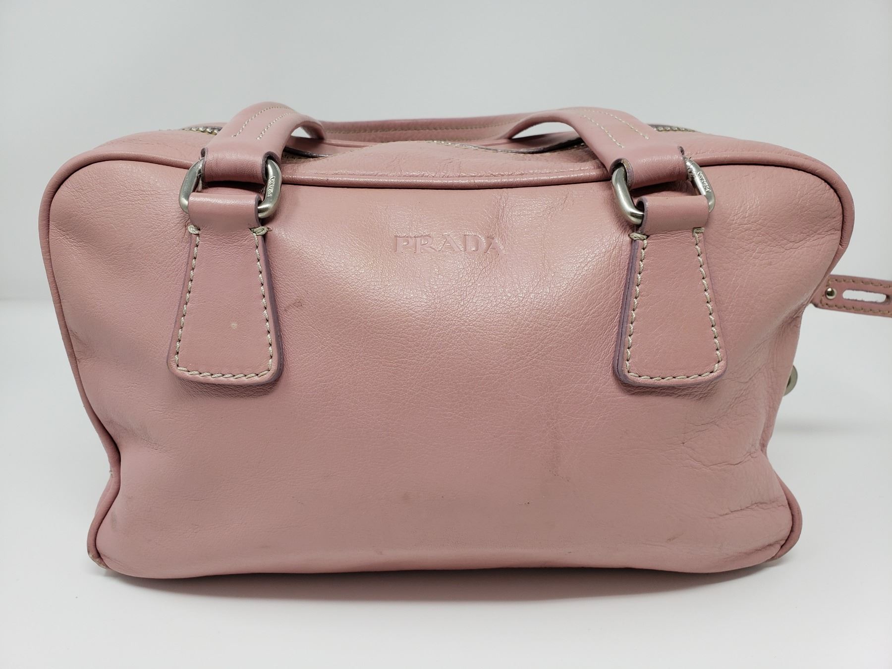 Description: Prada Pink Leather Handbag . Address Tag on Outside . Pink Leather Handles . Silver Zipper with Pink Leather Zipper pull . One inside zippered Pocket , Champagne Satin lining with Prada Logo .