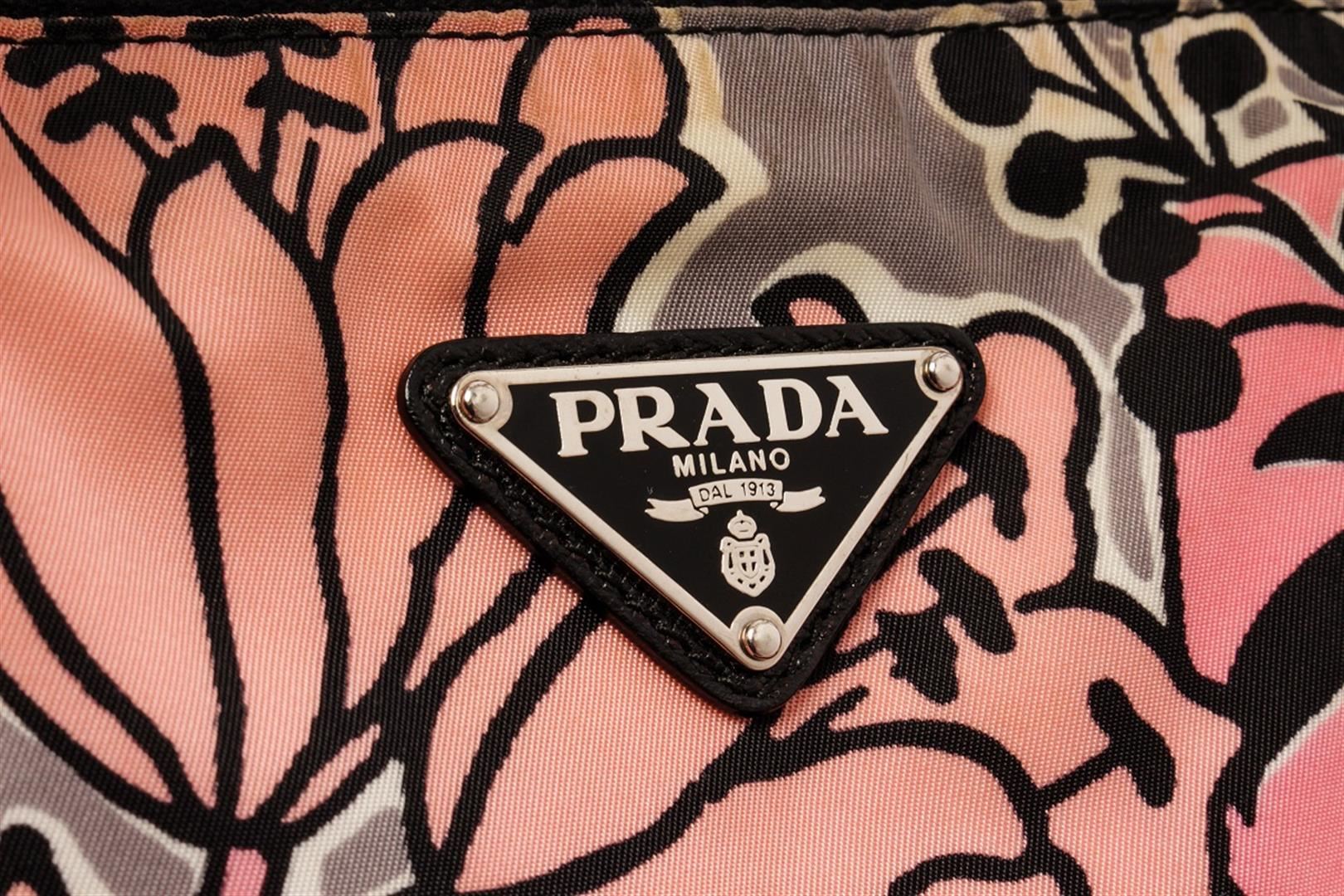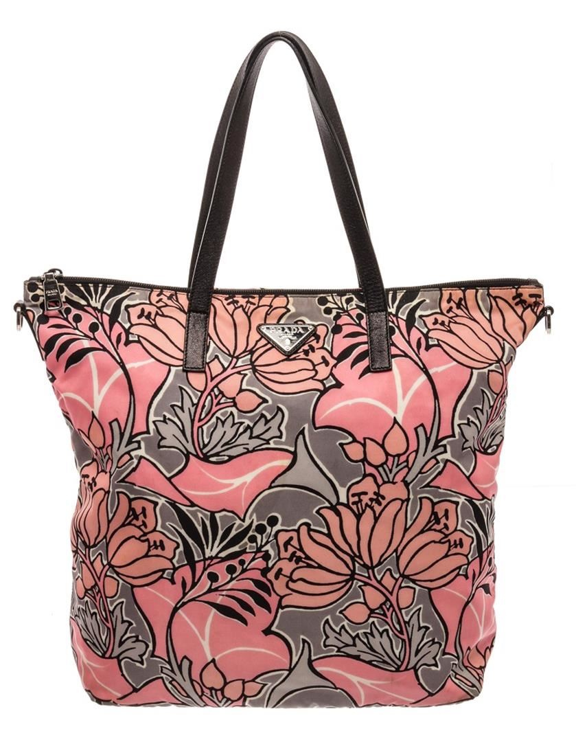 Prada Pink Nylon Saffiano Tessuto Flower Print 2Way Tote Bag. All available information is listed in the description and shown in the photos. Prada Pink Nylon Saffiano Tessuto Flower Print 2Way Tote Bag with it features black saffiano calfskin leather handles, an adjustable nylon shoulder strap and silver hardware. the top zipper opens to a spacious prada logo jacquard fabric interior with zipper and patch pockets. Height: 13.50" Width: 5.75" length: 16.00", Drop: 7.75-12.00" / 34.29 x 14.60 x 40.64 Cm