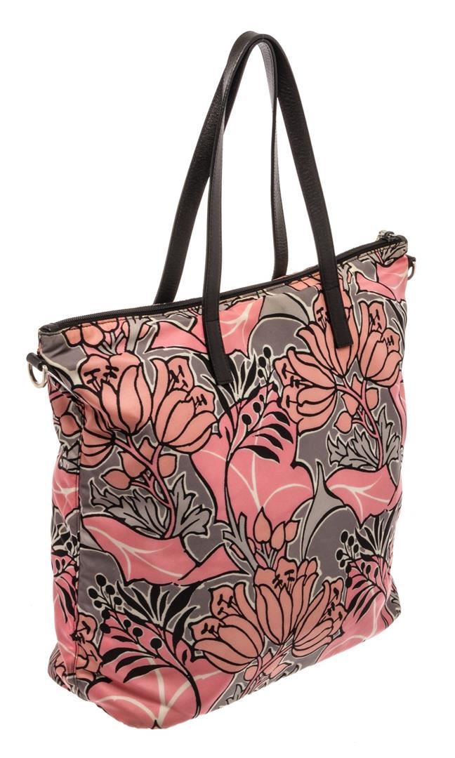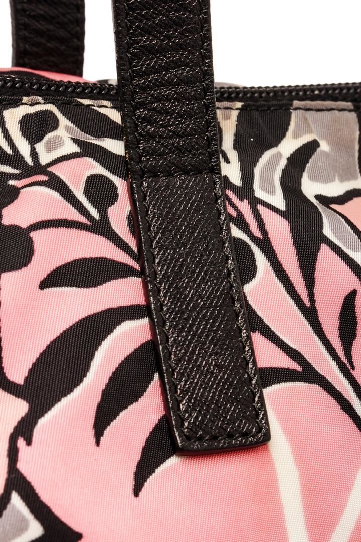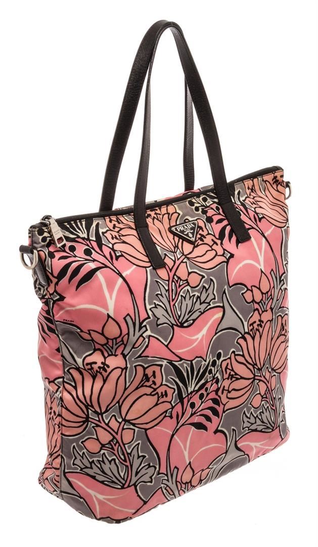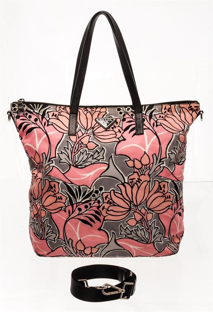 Prada Pink Nylon Saffiano Tessuto Flower Print 2Way Tote Bag. All available information is listed in the description and shown in the photos. Prada Pink Nylon Saffiano Tessuto Flower Print 2Way Tote Bag with it features black saffiano calfskin leather handles, an adjustable nylon shoulder strap and silver hardware. the top zipper opens to a spacious prada logo jacquard fabric interior with zipper and patch pockets. Height: 13.50" Width: 5.75" length: 16.00", Drop: 7.75-12.00" / 34.29 x 14.60 x 40.64 Cm
