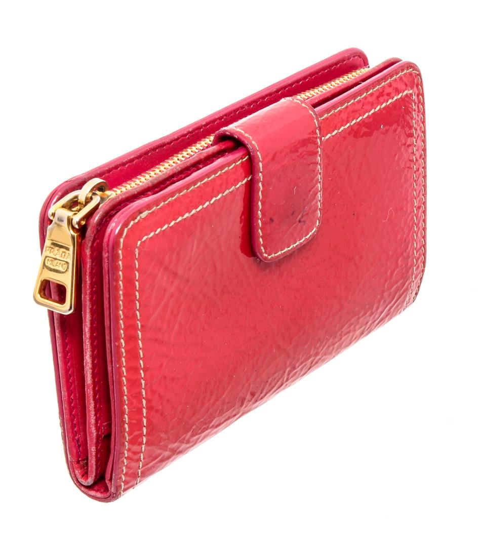 Prada Pink Patent Leather Tab Wallet with gold-tone hardware, logo placard at front, pink leather interior lining, three slip pockets, ten card slots, one zip pocket and overall snap tab closure.