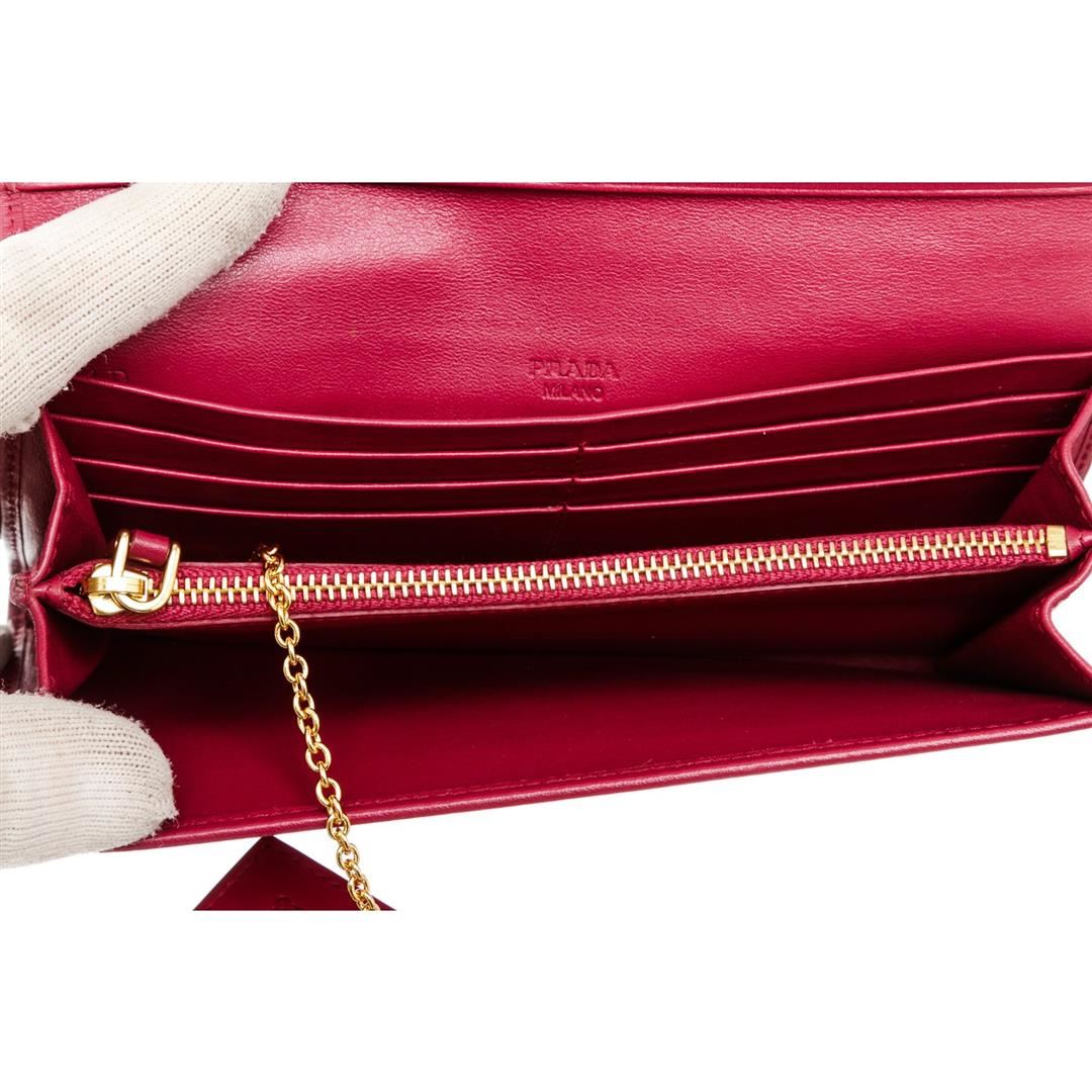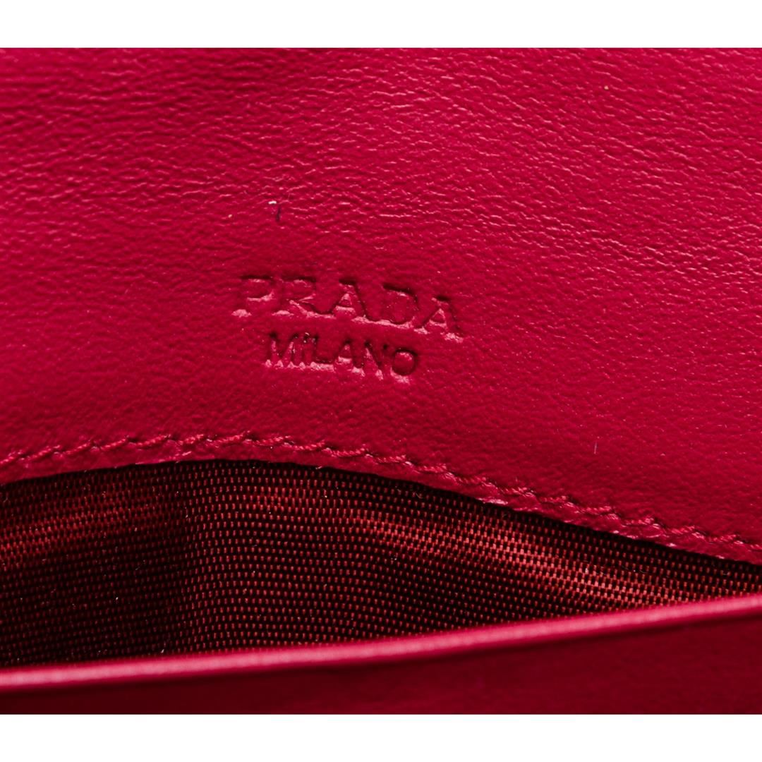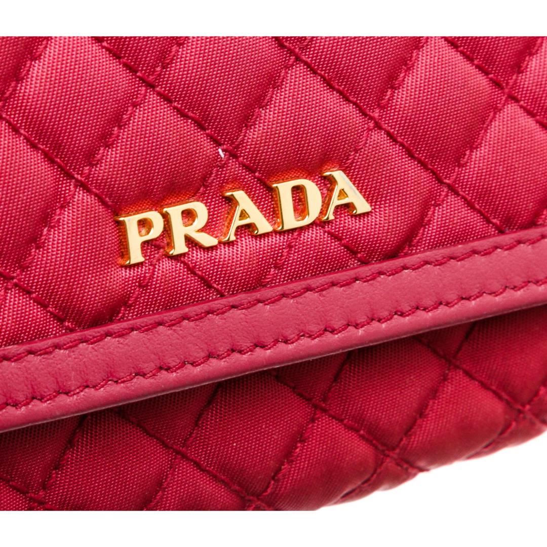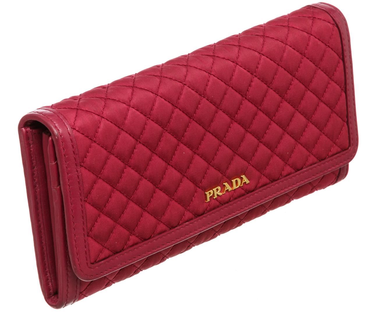 Pink quilted fabric leather Prada flap wallet with gold-tone hardware, tonal leather lining, two slip pockets under front flap, ten credit card slots, three compartments one with zipper closure, two side slip pockets and flap with snap button closure. Authentic.