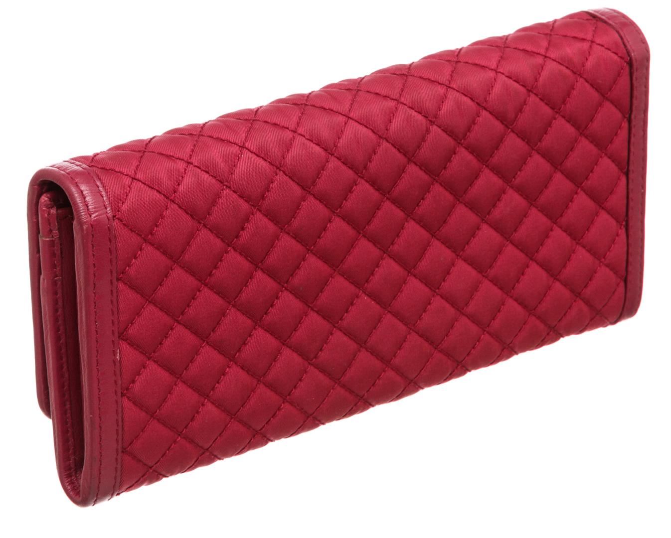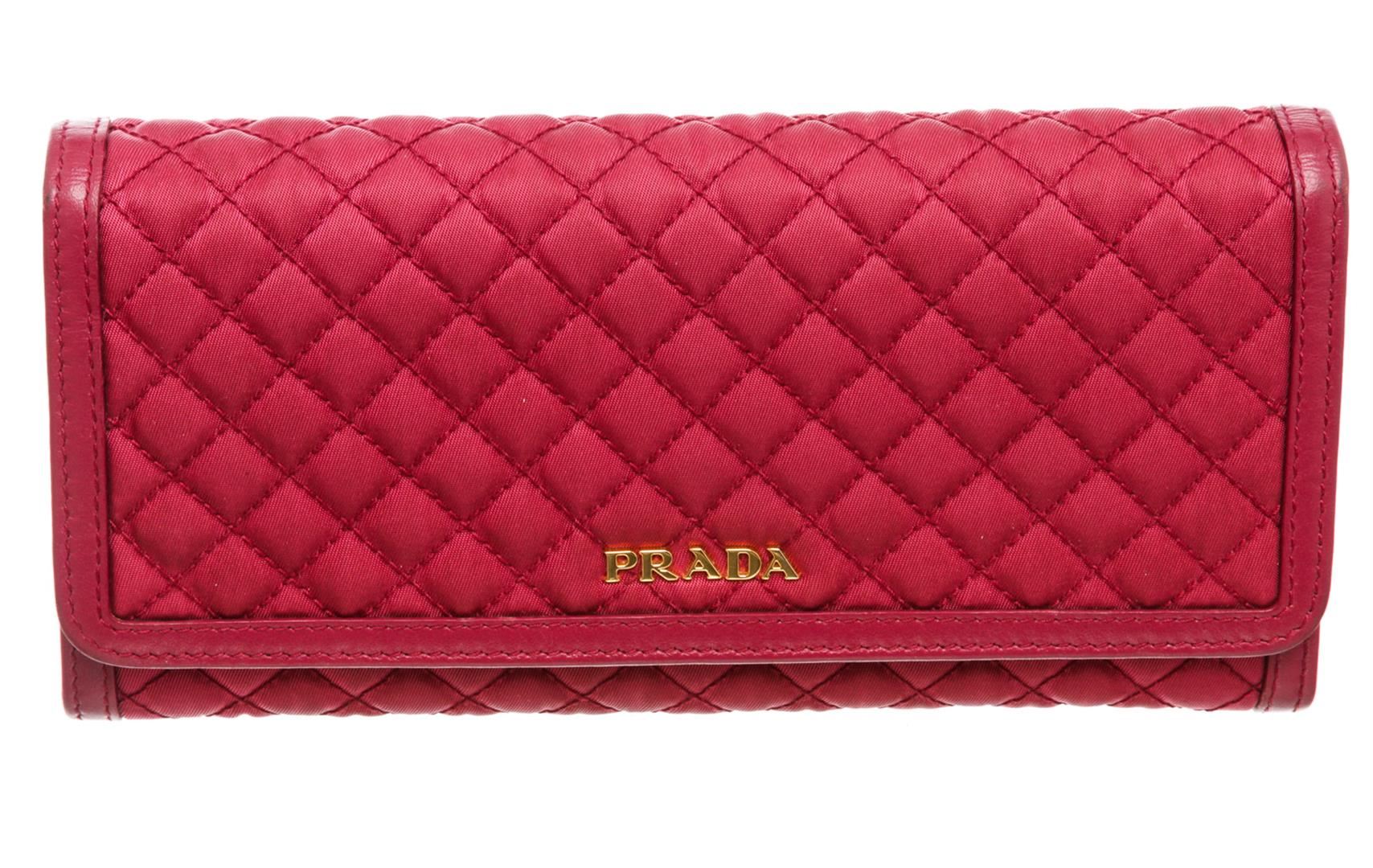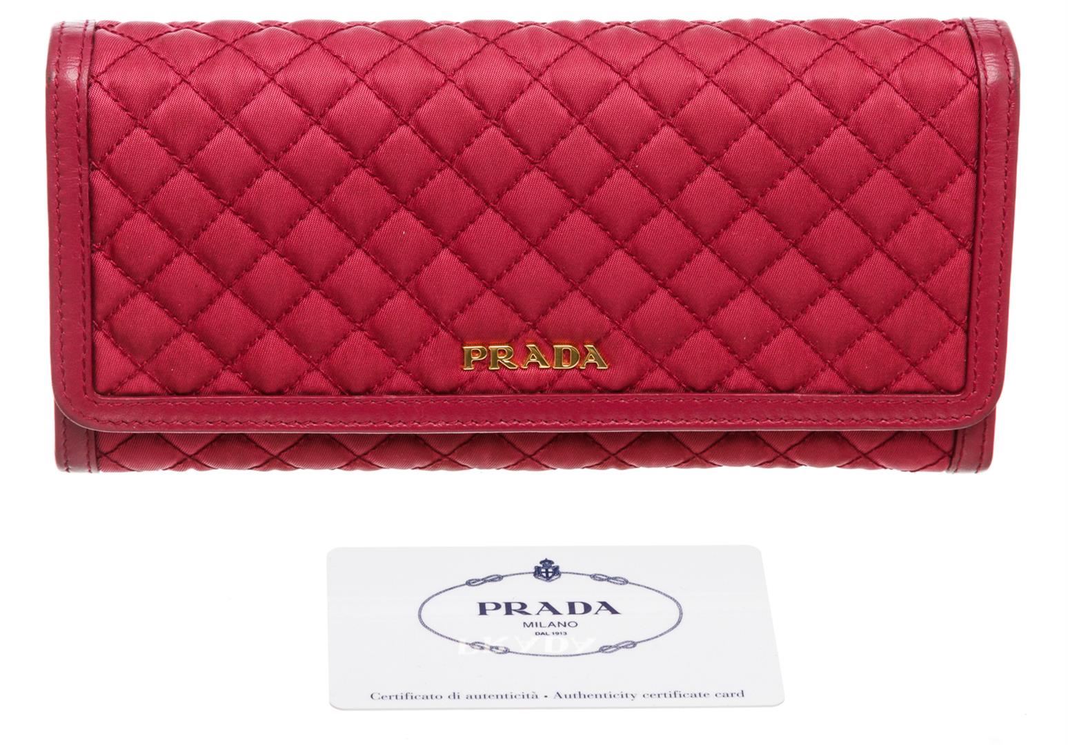 Pink quilted fabric leather Prada flap wallet with gold-tone hardware, tonal leather lining, two slip pockets under front flap, ten credit card slots, three compartments one with zipper closure, two side slip pockets and flap with snap button closure. Authentic.