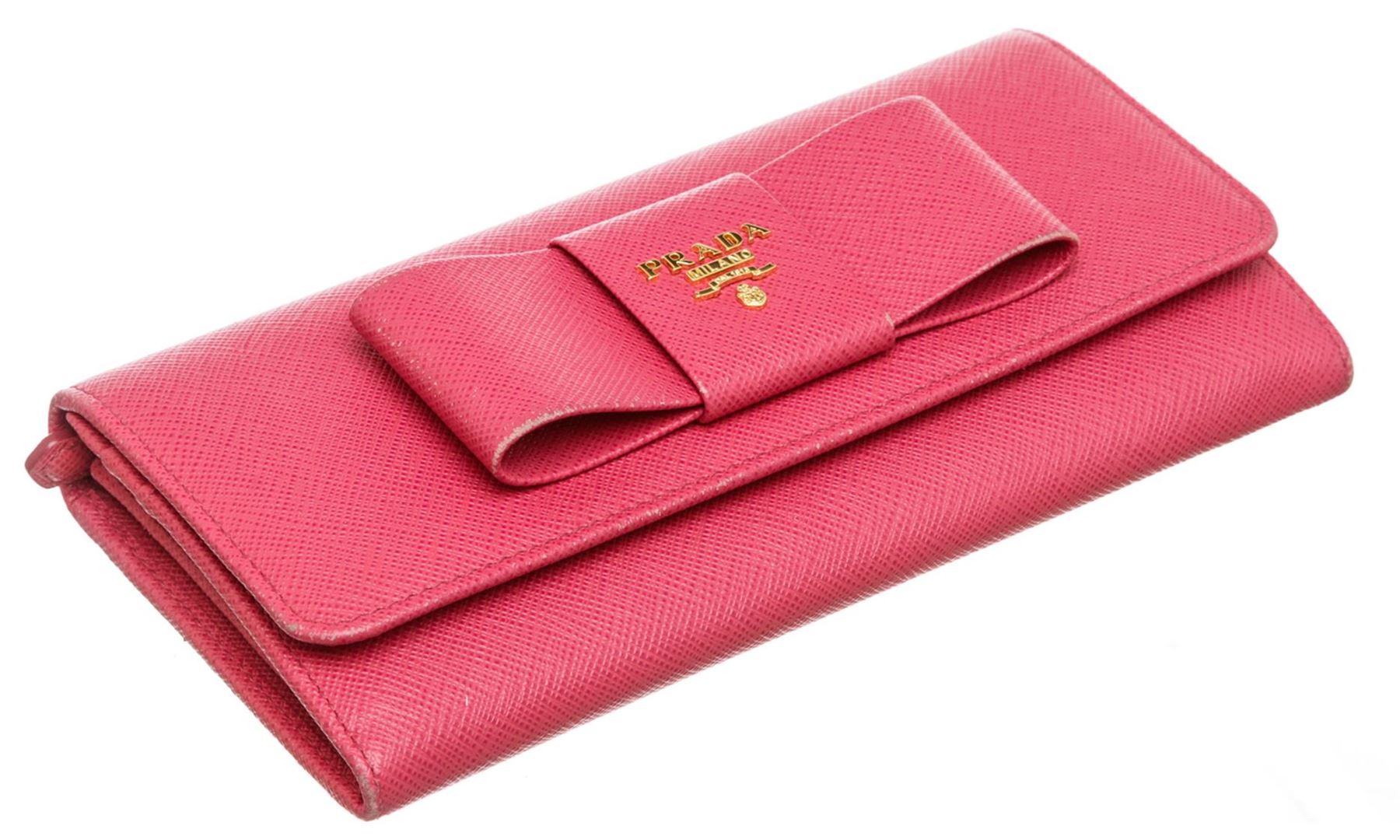 Pink Saffiano Lux leather Prada Fiocco wallet with gold-tone hardware, bow embellishment featuring logo adornment at front, exterior zip pocket at back, three interior compartments; one with zip closure, tonal leather lining, four bill compartments, 10 card slots at interior wall and dual snap closures at front flap.