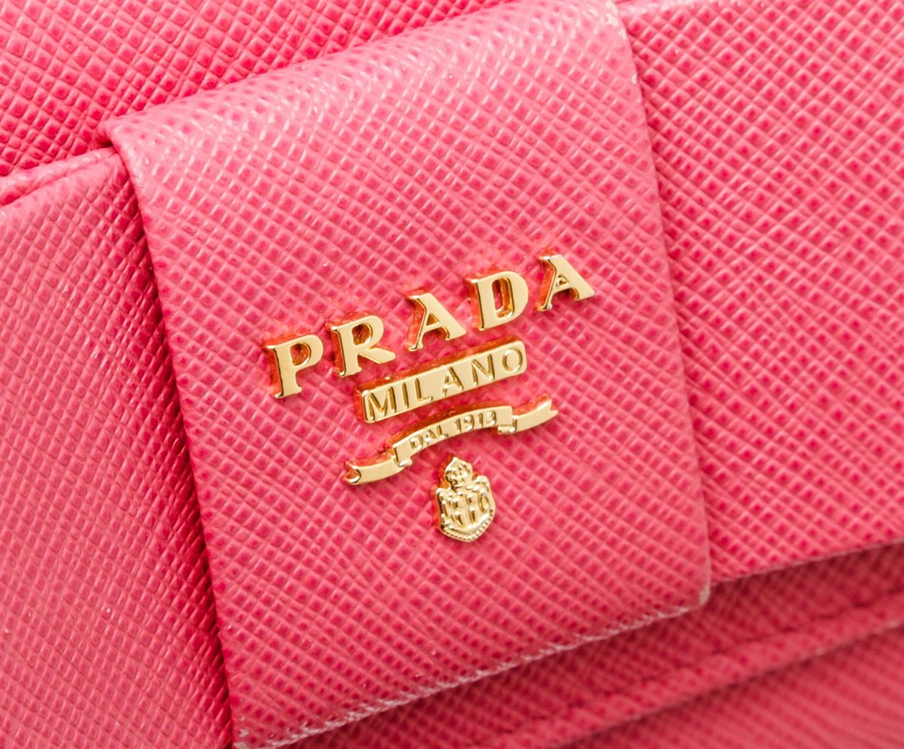 Pink Saffiano Lux leather Prada Fiocco wallet with gold-tone hardware, bow embellishment featuring logo adornment at front, exterior zip pocket at back, three interior compartments; one with zip closure, tonal leather lining, four bill compartments, 10 card slots at interior wall and dual snap closures at front flap.