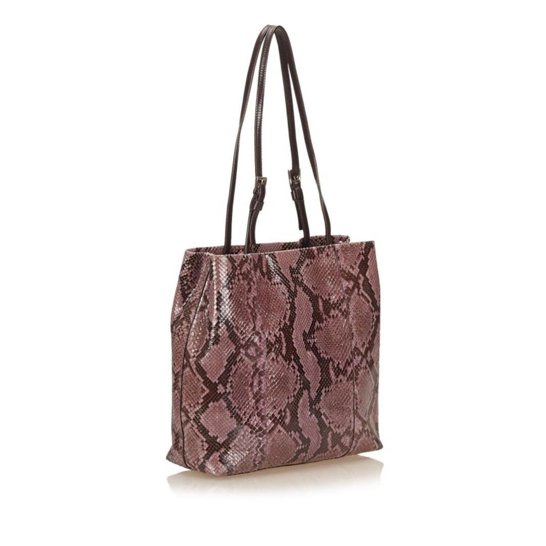 This shoulder bag features a python body, flat leather handles, open top with magnetic closure, and interior compartments.
