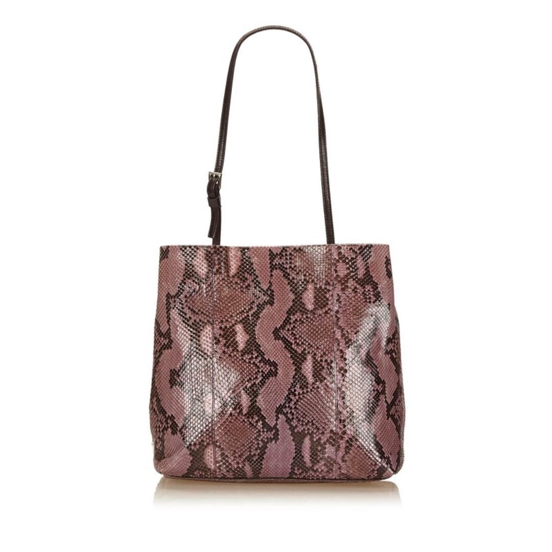 This shoulder bag features a python body, flat leather handles, open top with magnetic closure, and interior compartments.