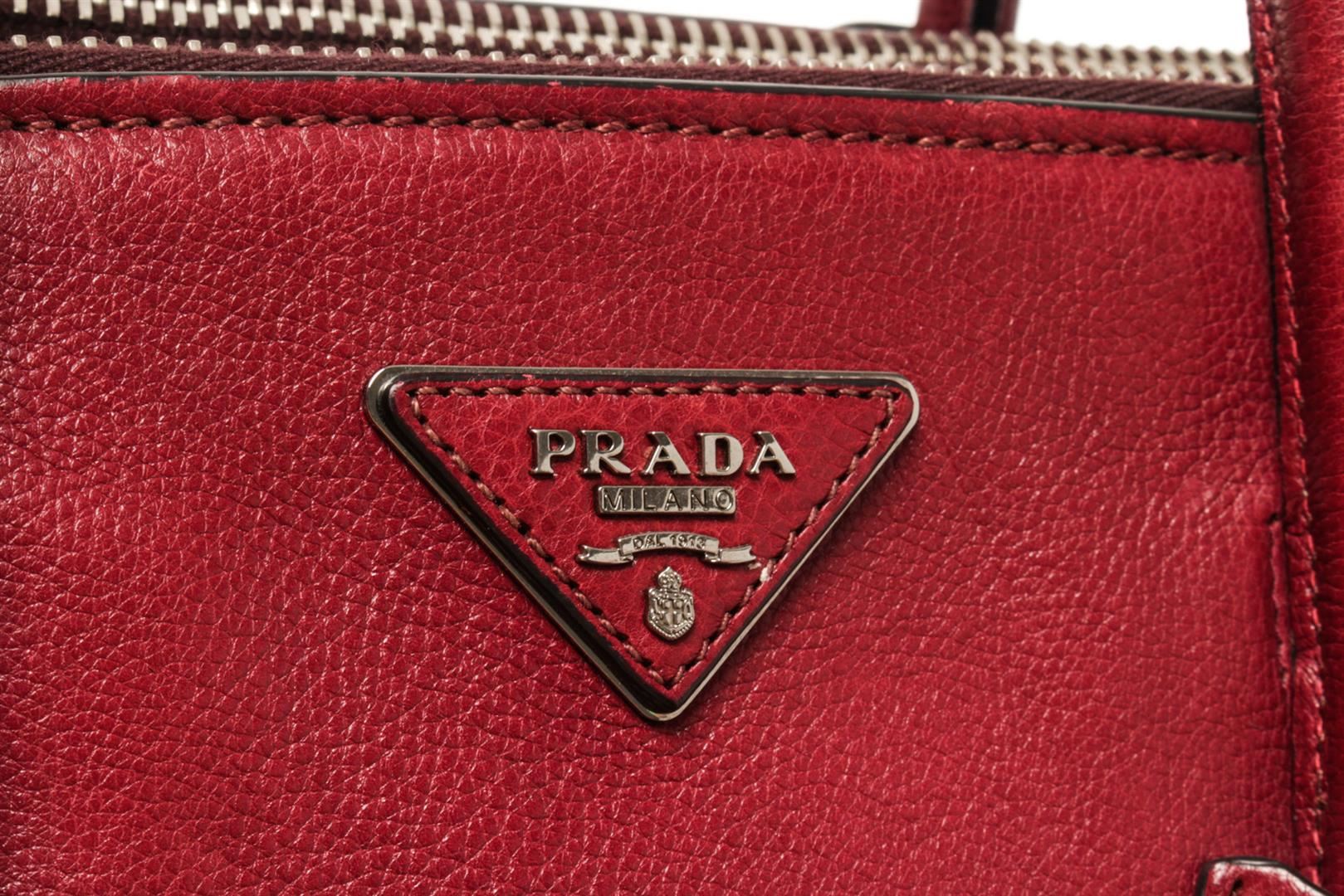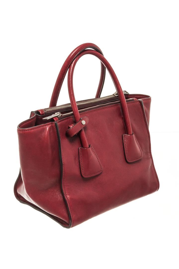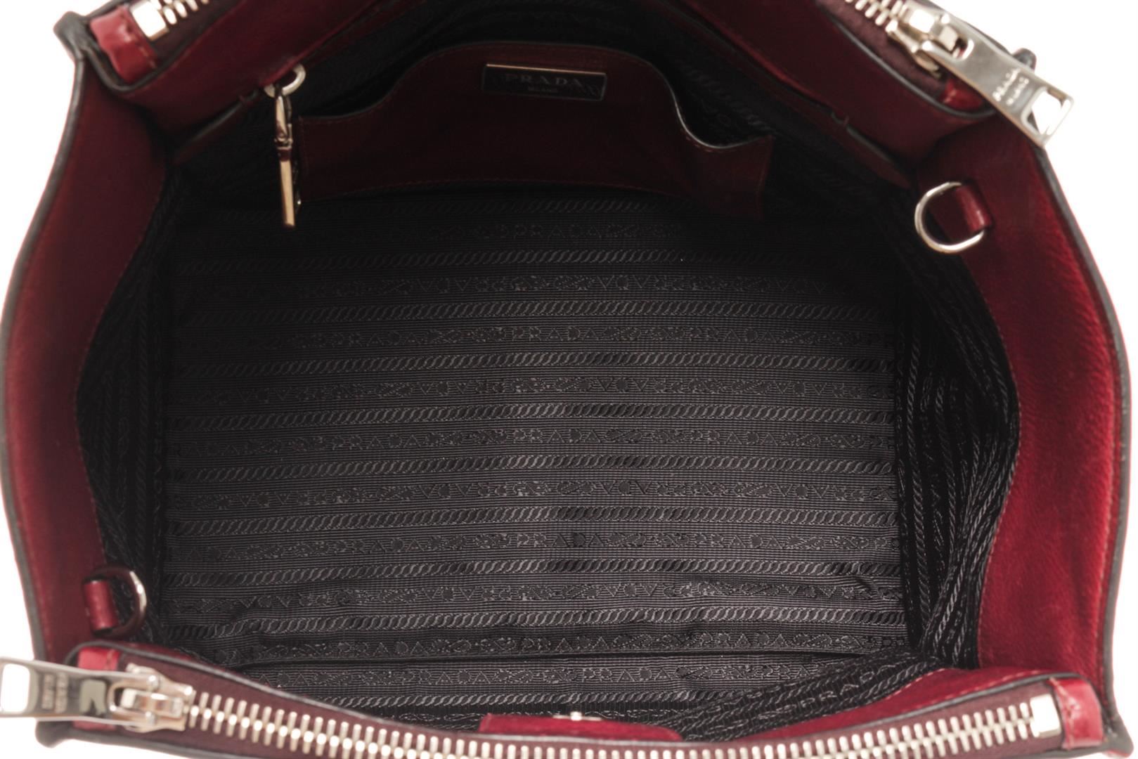 One Prada Red Calf Twin Pocket Tote Bag. Item is sold AS-IS. All available information is listed in the description and shown in the photo. Prada Red Calf Twin Pocket Tote Bag with top handle, detachable adjustable strap, Prada fabric lining, Prada pocket interior, silver tone hardware, zipper/snap closure. Height: 10.5" Width: 8" Depth: 11", Handle Drop: / 26.67 x 20.32 x 27.94 Cm