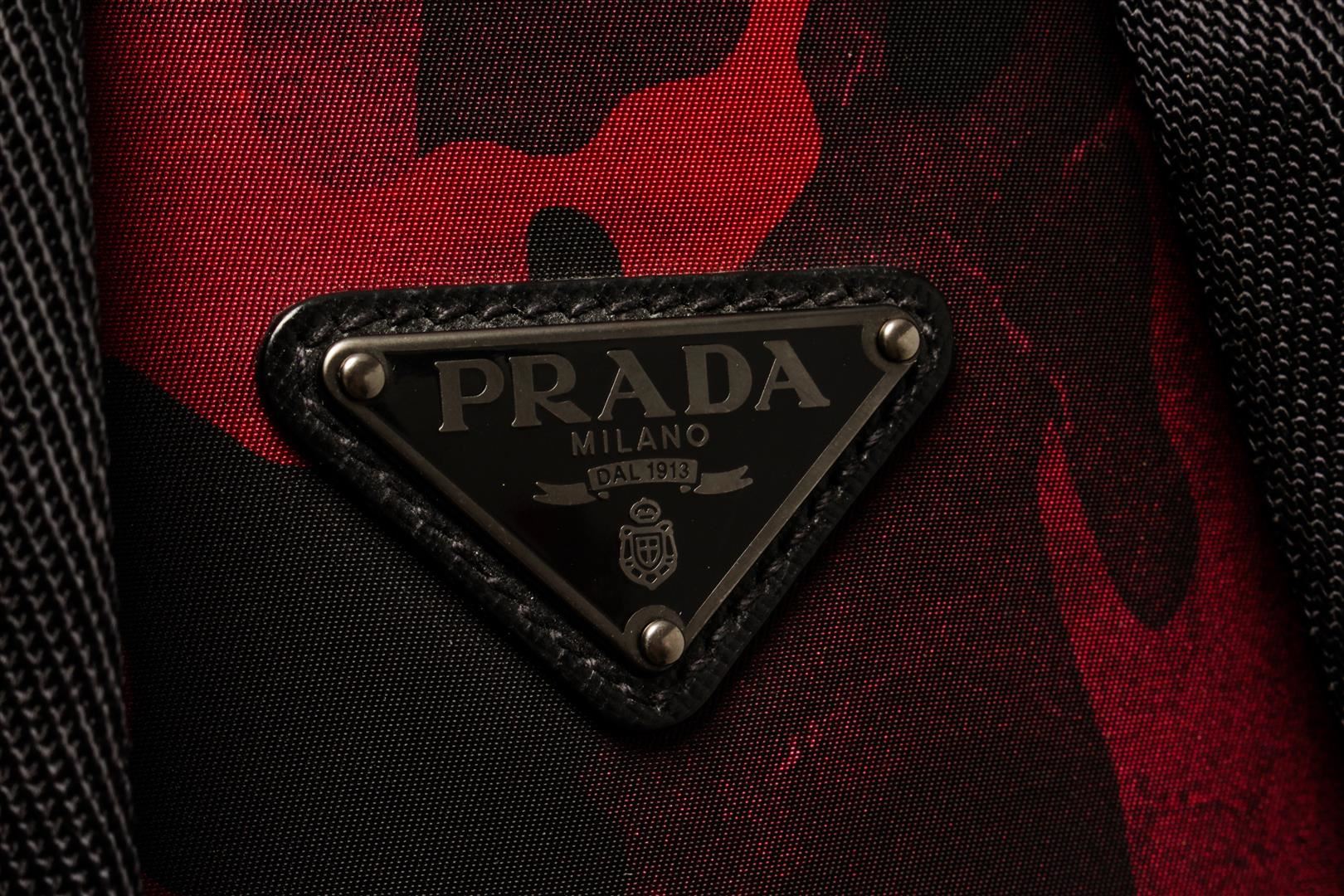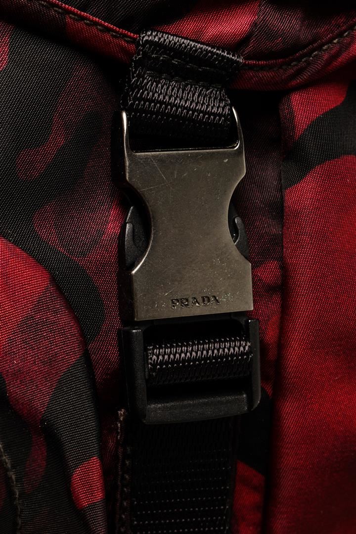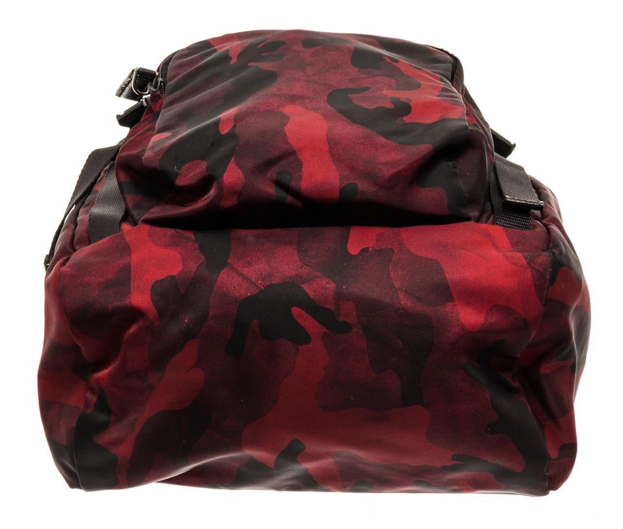 One Prada Red Camouflage Tessuto Backpack. Item is sold AS-IS. All available information is listed in the description and shown in the photo. Prada red camouflage tessuto backpack with adjustable straps, one exterior zipper pocket on the top flap, one exterior zipper pocket on the front, double buckle, and drawstring and flap closure.