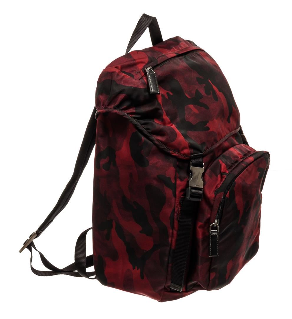 One Prada Red Camouflage Tessuto Backpack. Item is sold AS-IS. All available information is listed in the description and shown in the photo. Prada red camouflage tessuto backpack with adjustable straps, one exterior zipper pocket on the top flap, one exterior zipper pocket on the front, double buckle, and drawstring and flap closure.