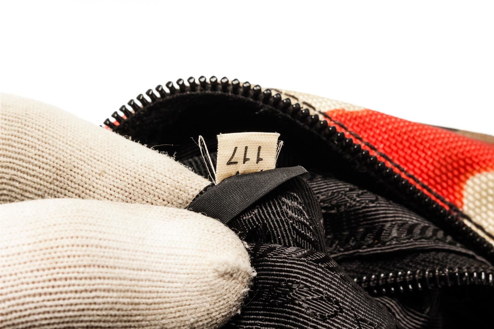 One Prada Red Multicolor Canvas Zip Around Small Satchel Bag. Item is sold AS-IS. All available information is listed in the description and shown in the photo. prada red multicolor canvas zip around small satchel bag with creasing and minor wear on exterior, moderate stain on base, discoloration on handles. minor splitting on zipper pull wax edge, pilling along zipper tape, scratches and tarnish on hardware. Height: 8 in (20.32 cm), Width: 6 in (15.24 cm), Depth: 12 in (30.48 cm)