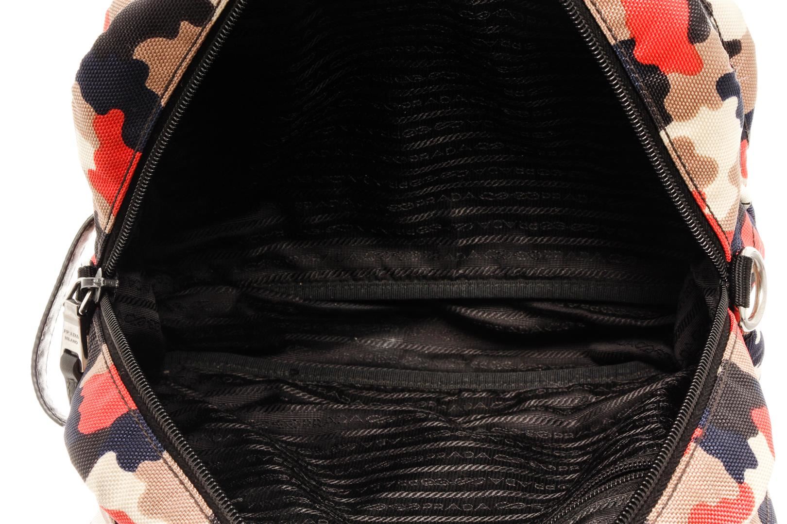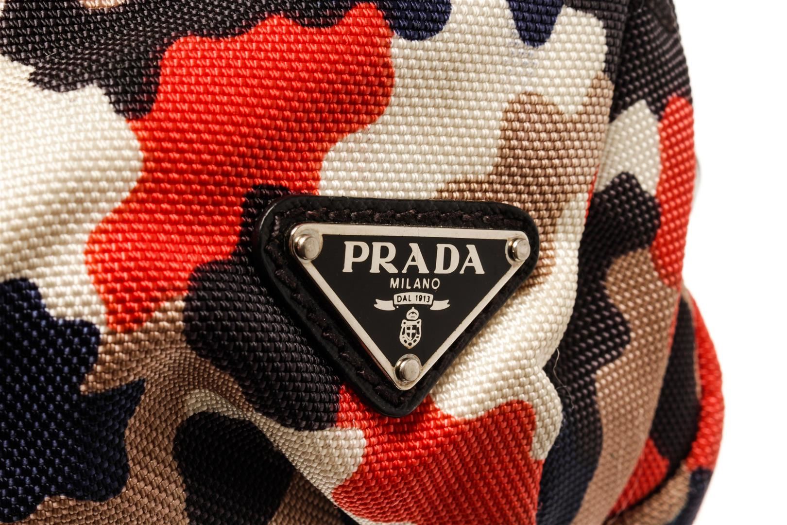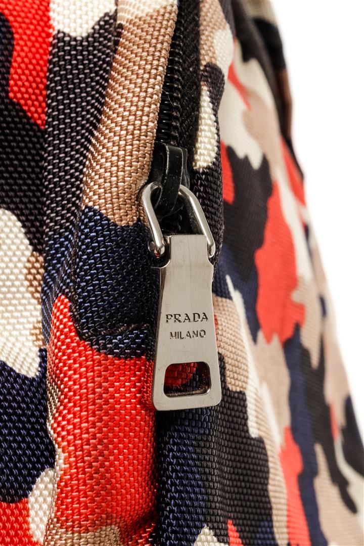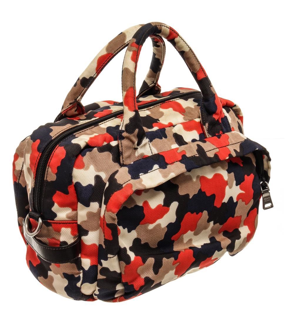 One Prada Red Multicolor Canvas Zip Around Small Satchel Bag. Item is sold AS-IS. All available information is listed in the description and shown in the photo. prada red multicolor canvas zip around small satchel bag with creasing and minor wear on exterior, moderate stain on base, discoloration on handles. minor splitting on zipper pull wax edge, pilling along zipper tape, scratches and tarnish on hardware. Height: 8 in (20.32 cm), Width: 6 in (15.24 cm), Depth: 12 in (30.48 cm)
