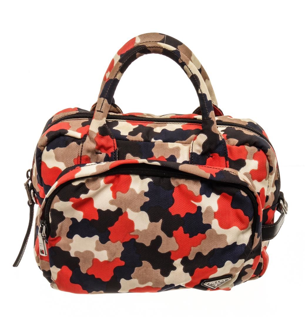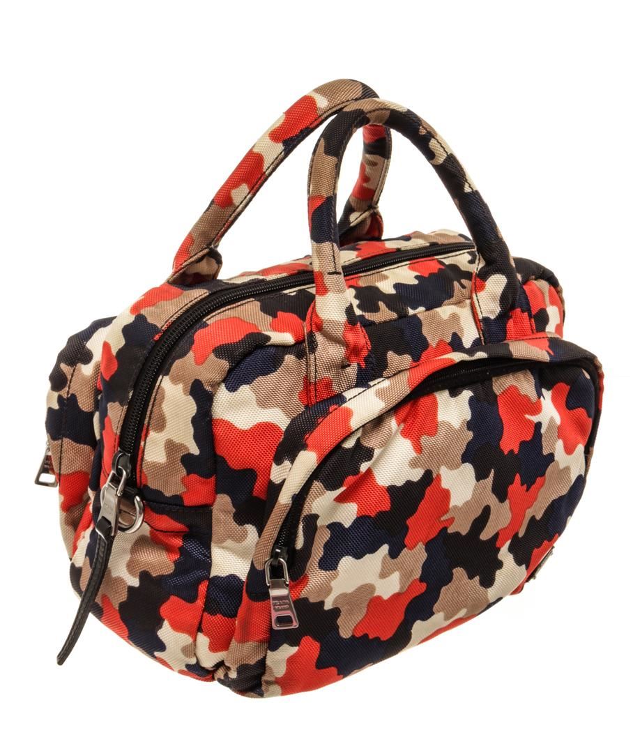 One Prada Red Multicolor Canvas Zip Around Small Satchel Bag. Item is sold AS-IS. All available information is listed in the description and shown in the photo. prada red multicolor canvas zip around small satchel bag with creasing and minor wear on exterior, moderate stain on base, discoloration on handles. minor splitting on zipper pull wax edge, pilling along zipper tape, scratches and tarnish on hardware. Height: 8 in (20.32 cm), Width: 6 in (15.24 cm), Depth: 12 in (30.48 cm)