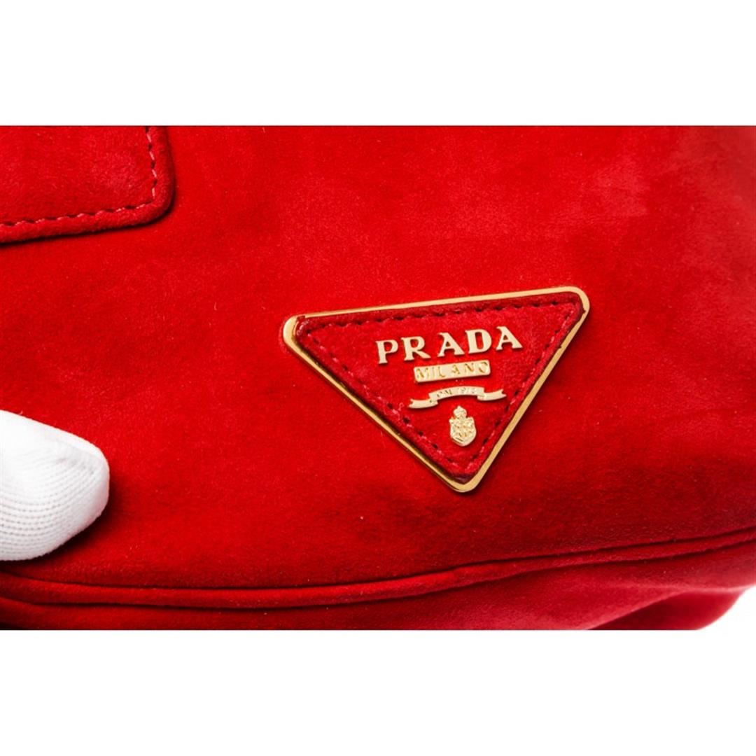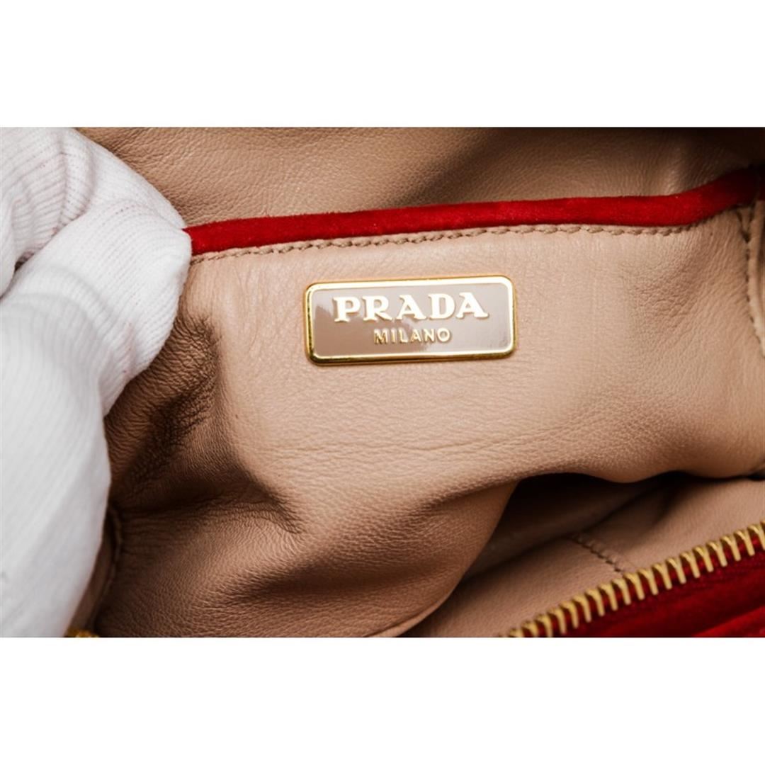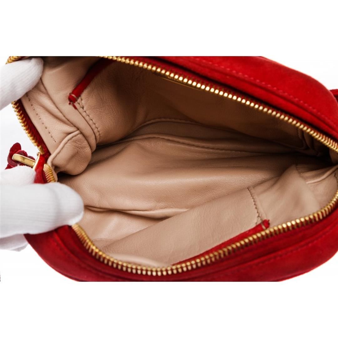 Prada Red Suede Clutch with gold-tone hardware. Contains an overall zipper closure, lock, key and a single button embellishment handle. Interior or leather lined with two sideip pockets. Includes authenticity card. Item is pre-owned.