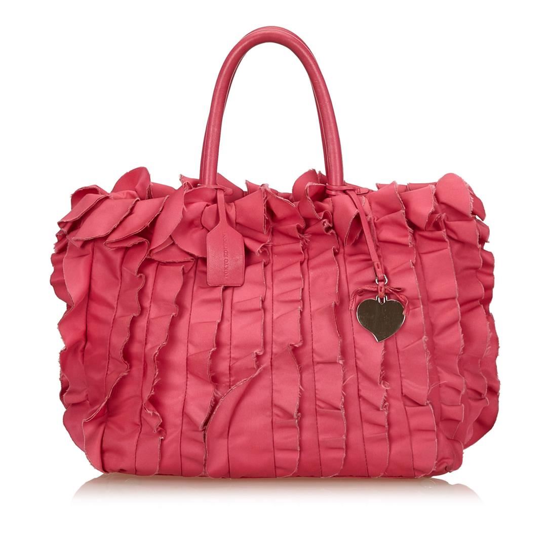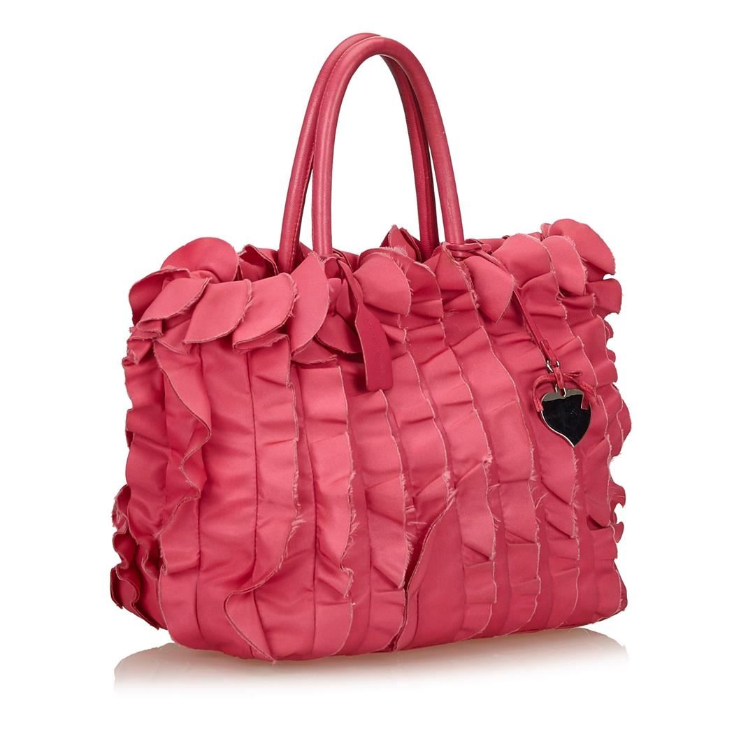 One Prada Ruffle Satin Tote Bag. This tote bag features a satin body, rolled leather handles, open top with magnetic closure, and interior zip pocket.