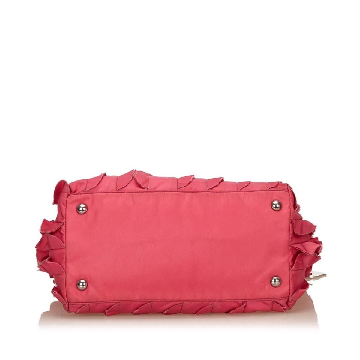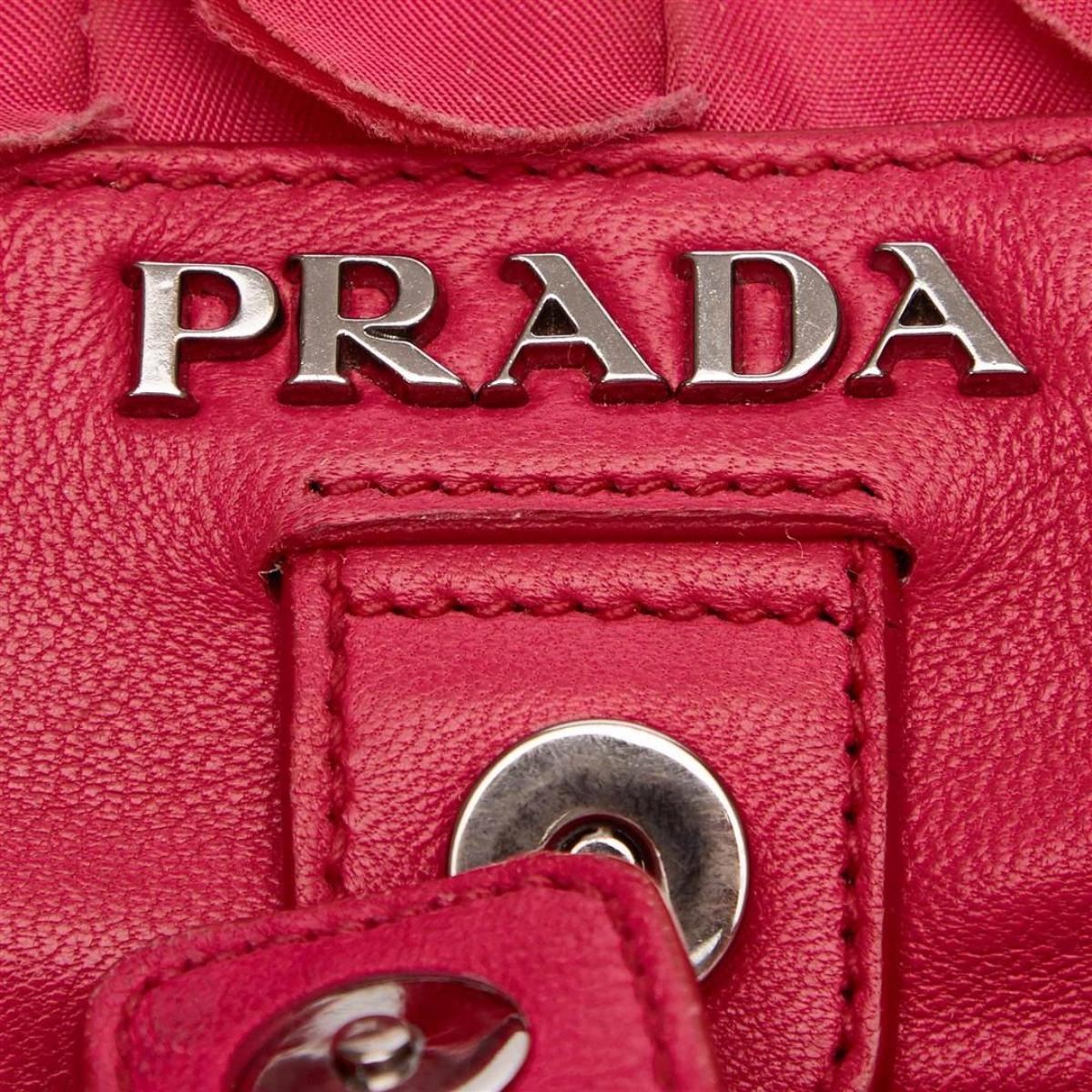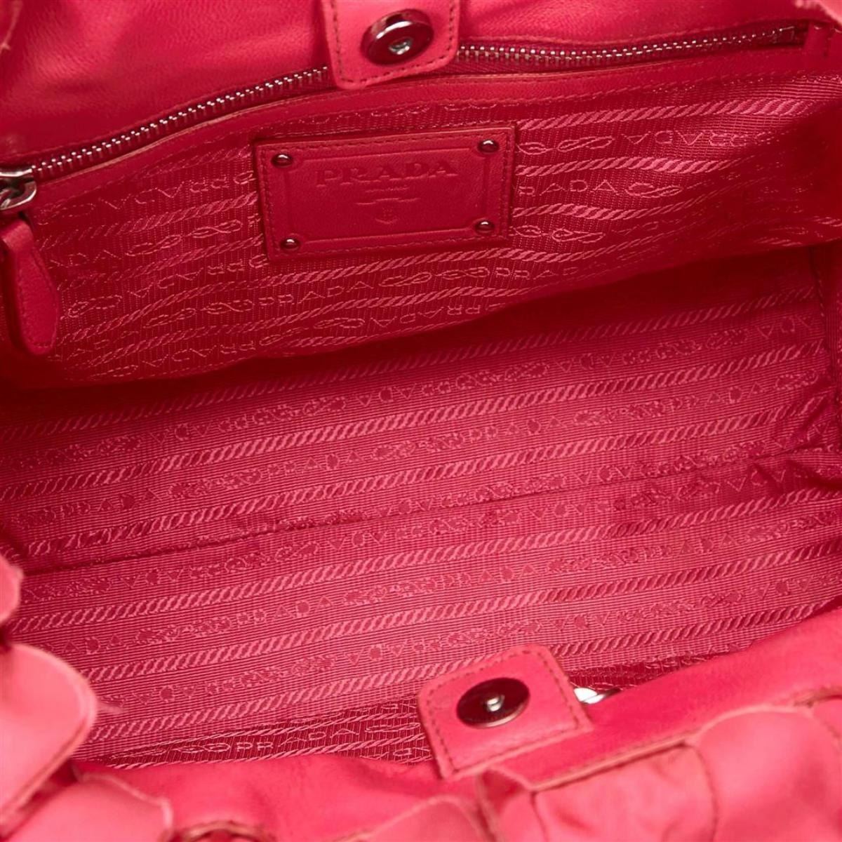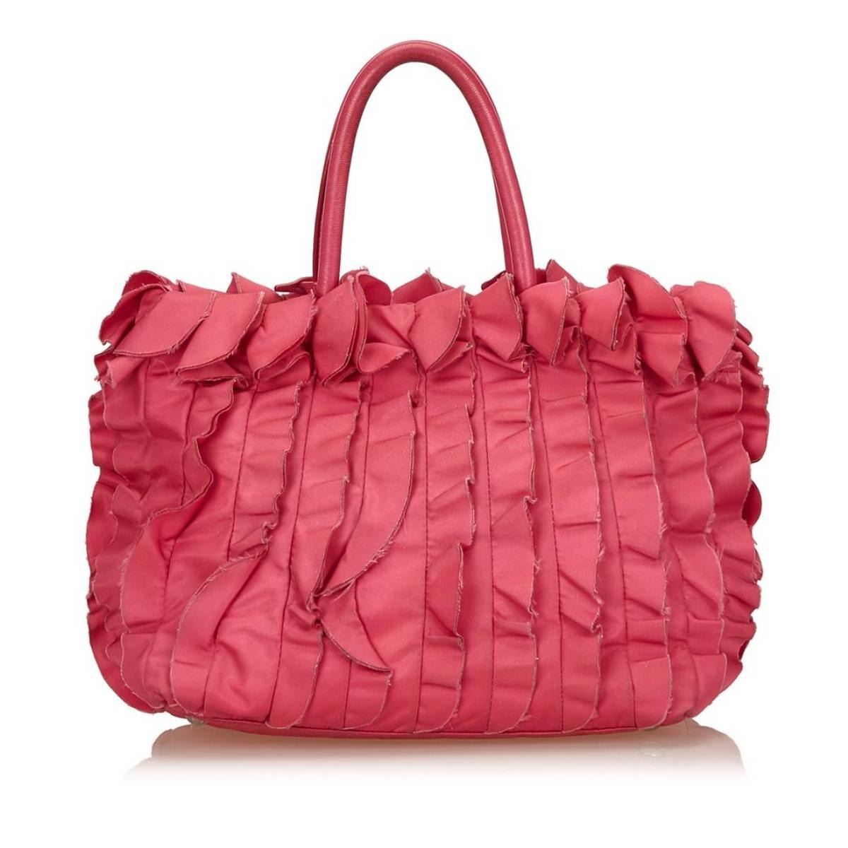 One Prada Ruffle Satin Tote Bag. This tote bag features a satin body, rolled leather handles, open top with magnetic closure, and interior zip pocket.