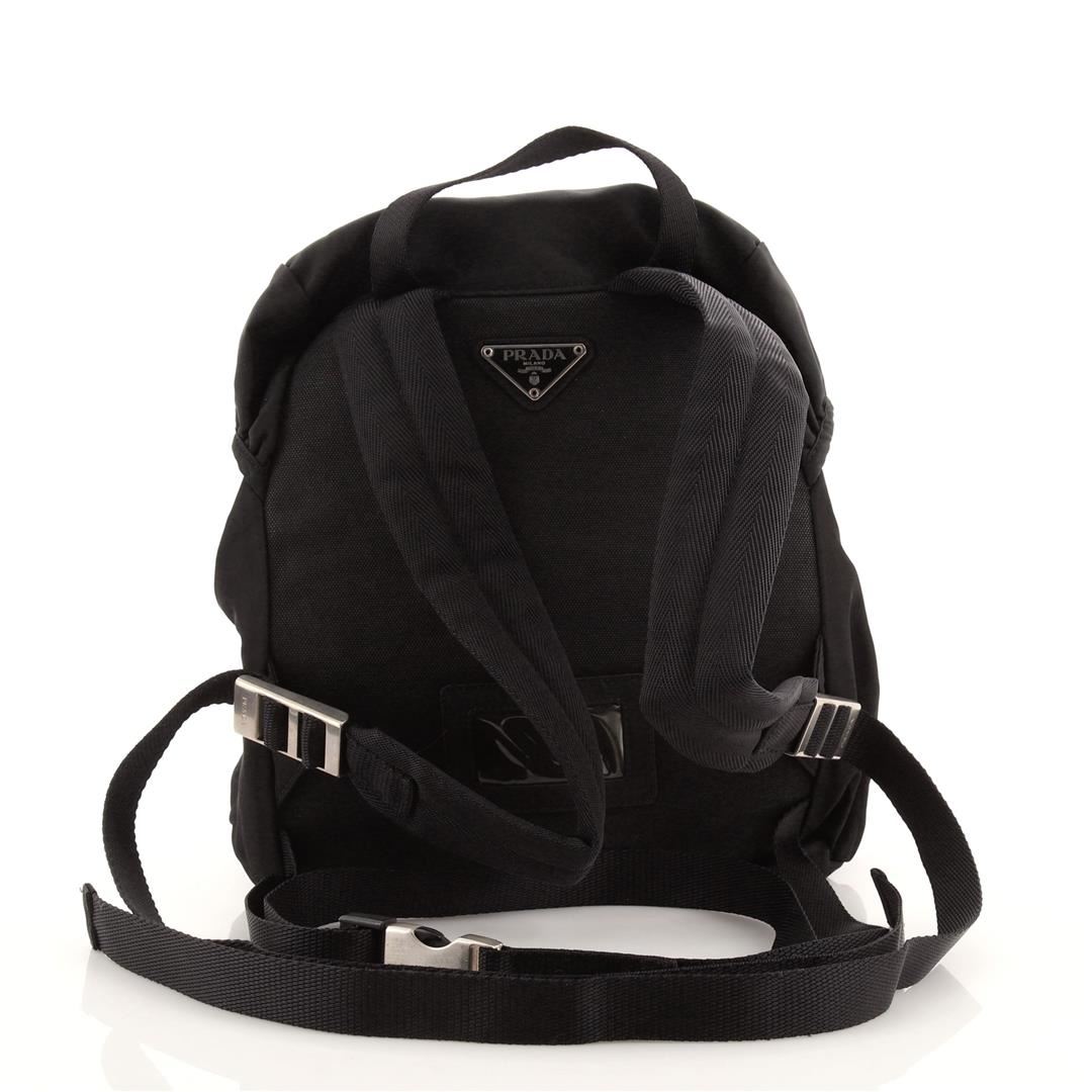 Prada Single Buckle Pocket Backpack Tessuto Small. Odor in interior. Wear on exterior and in interior, scuffs on rear, discoloration and wear in exterior pocket and in interior. Light glitter in interior, scratches and tarnish on hardware.