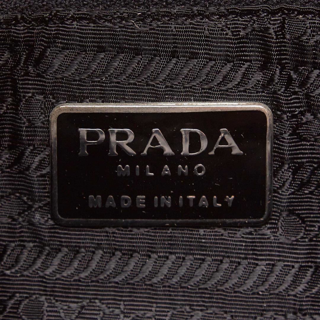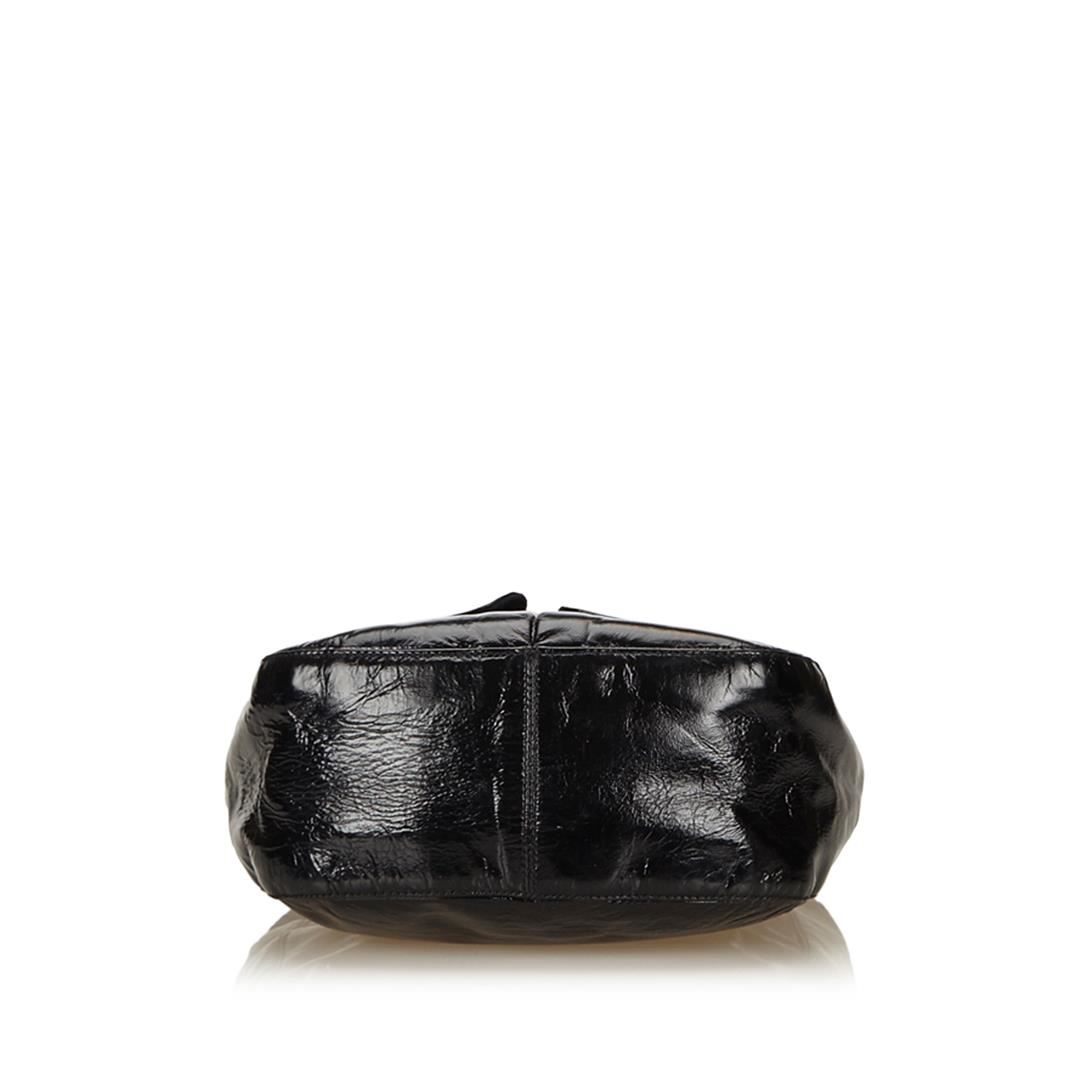 One Prada Small Patent Leather Handbag. This handbag features a patent leather body, exterior front flap pockets, flat leather handle, open top, and interior zip pocket.