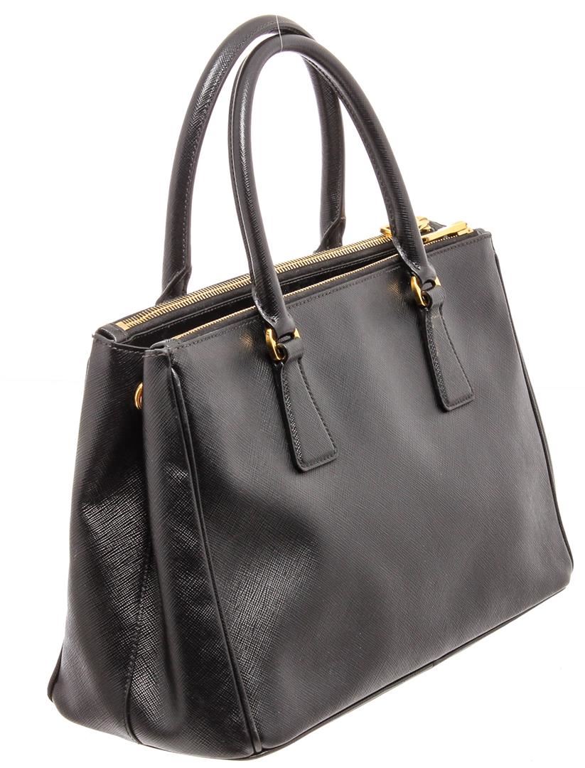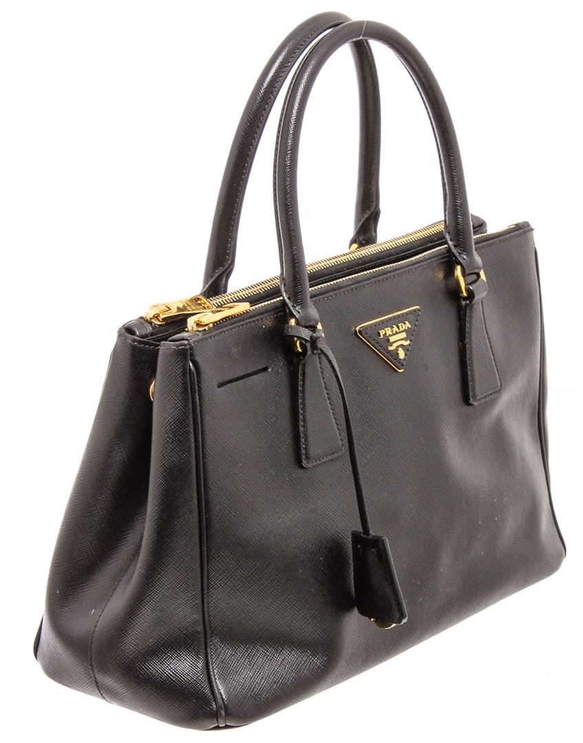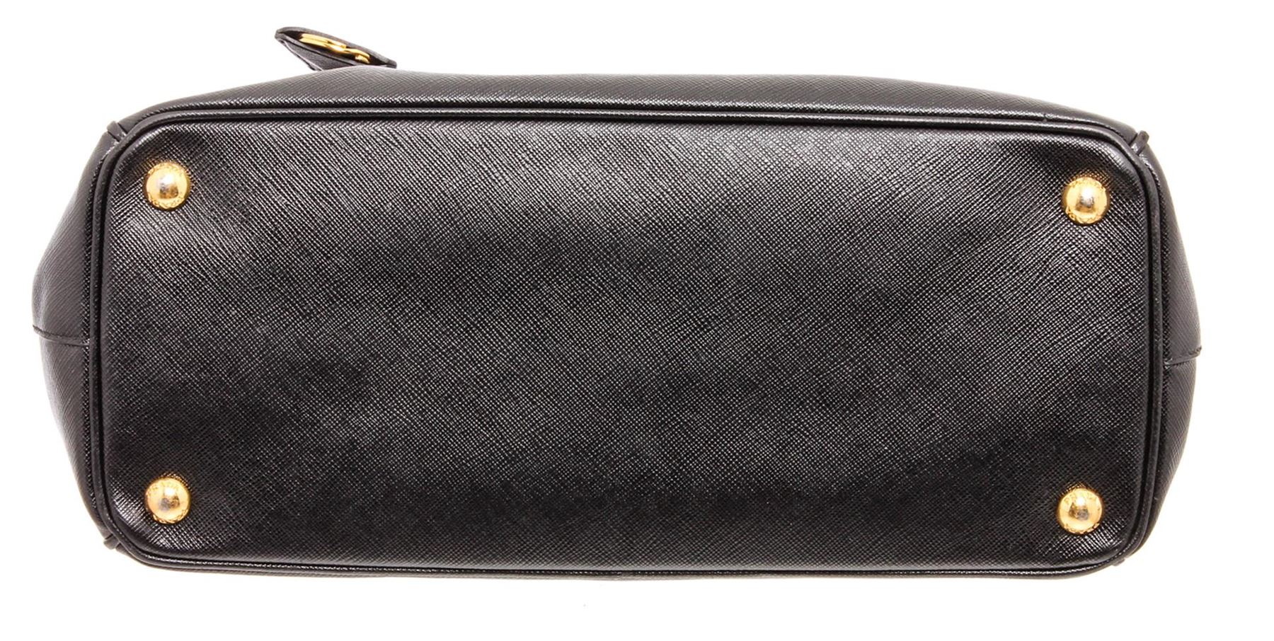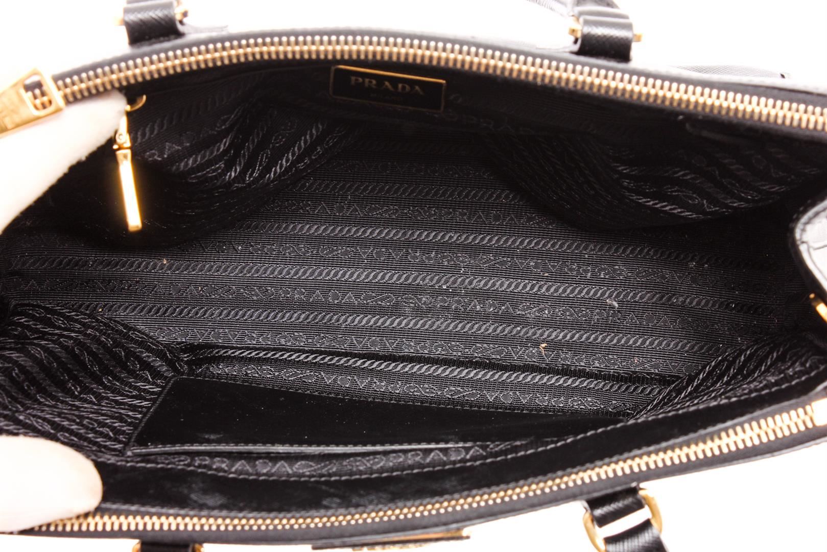 Black Saffiano Lux Prada Double Zip Galleria tote with gold-tone hardware, dual rolled top handles, protective feet at base, pyramid logo adornment at top line, tonal logo jacquard woven interior lining, dual interior slit pocket; one with zip closure and open top.