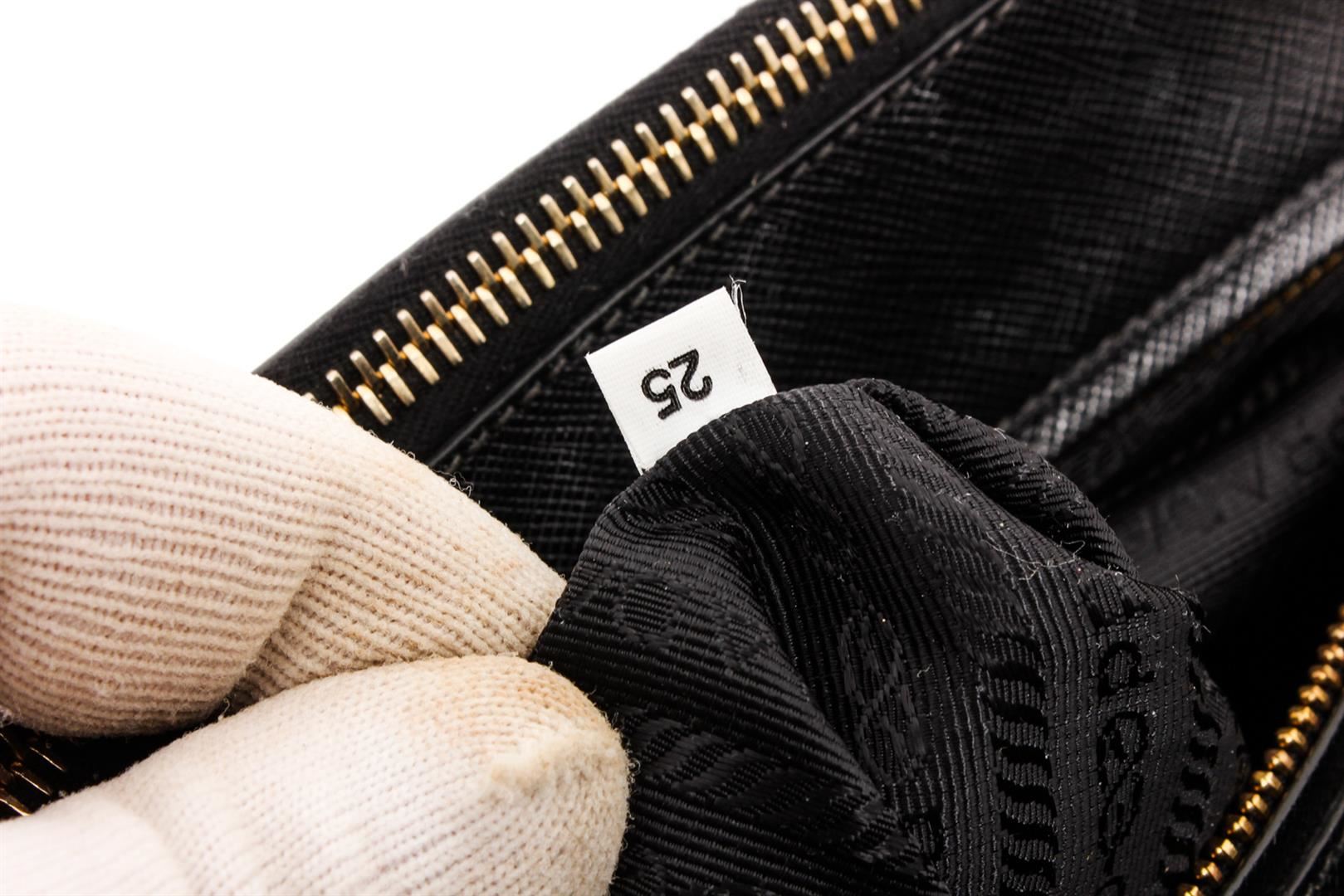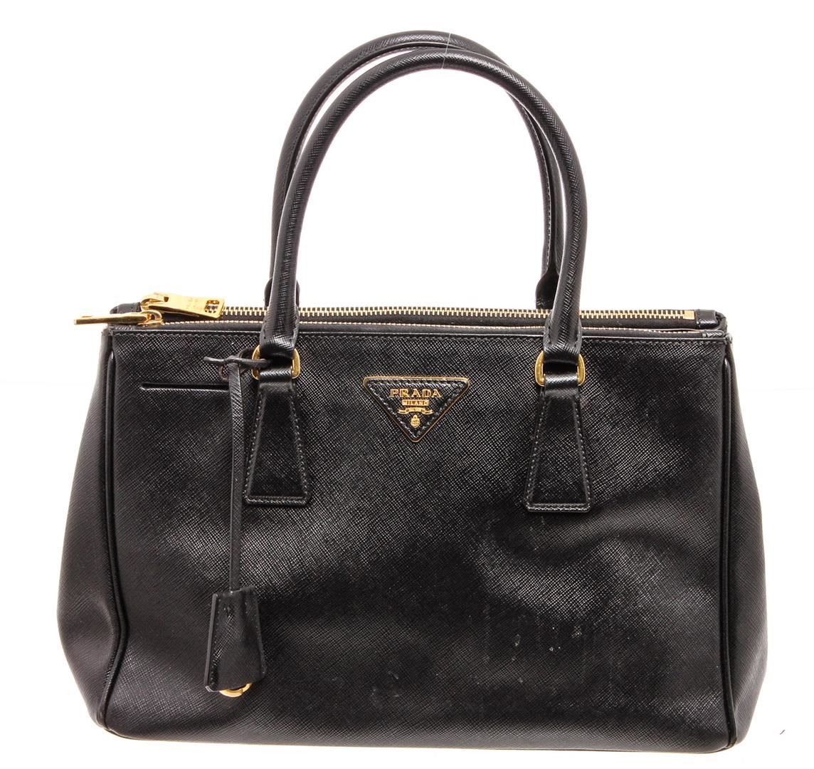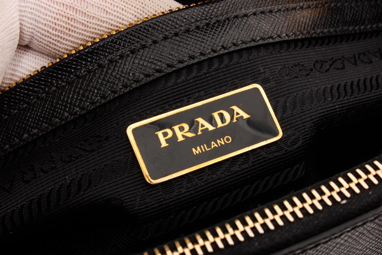 Black Saffiano Lux Prada Double Zip Galleria tote with gold-tone hardware, dual rolled top handles, protective feet at base, pyramid logo adornment at top line, tonal logo jacquard woven interior lining, dual interior slit pocket; one with zip closure and open top.