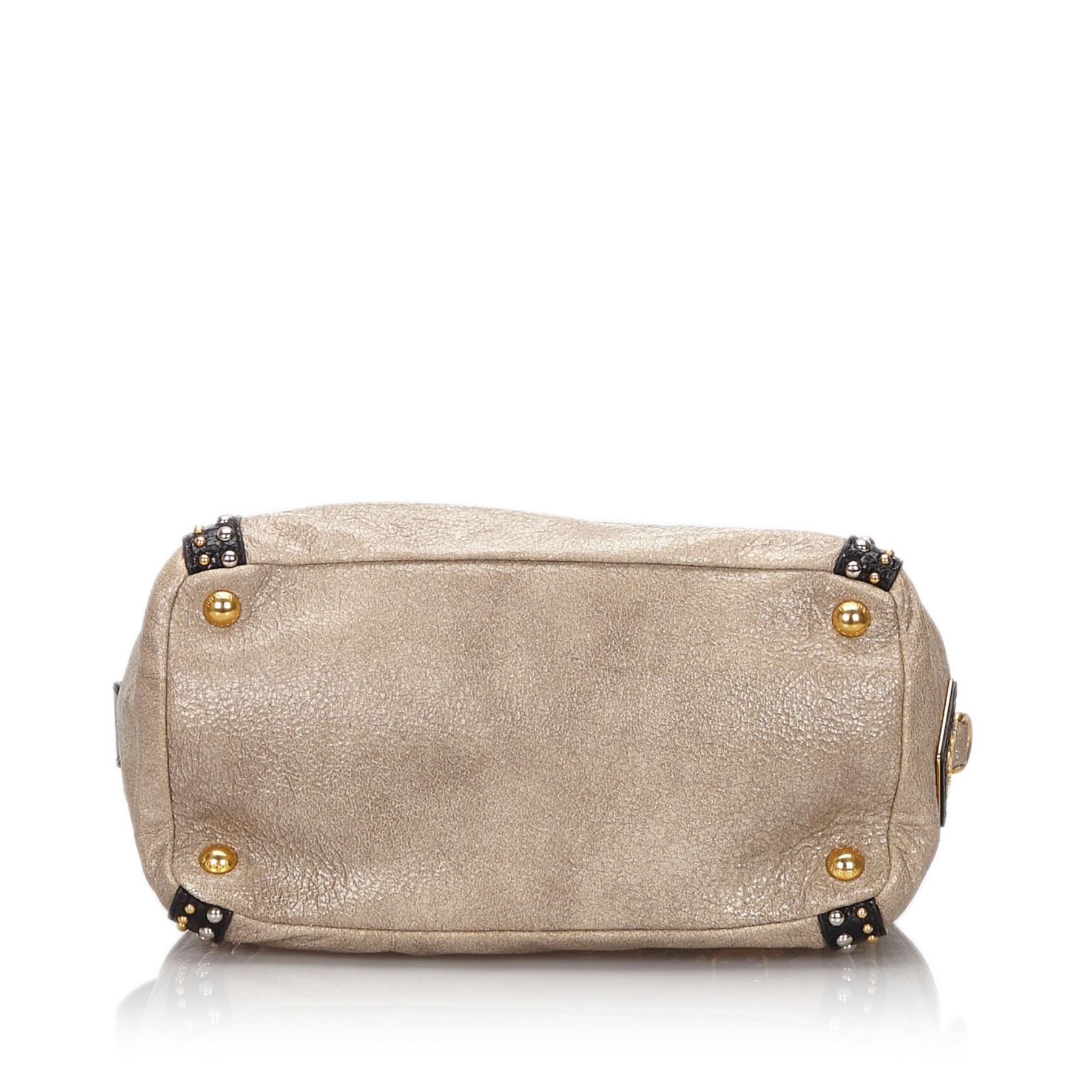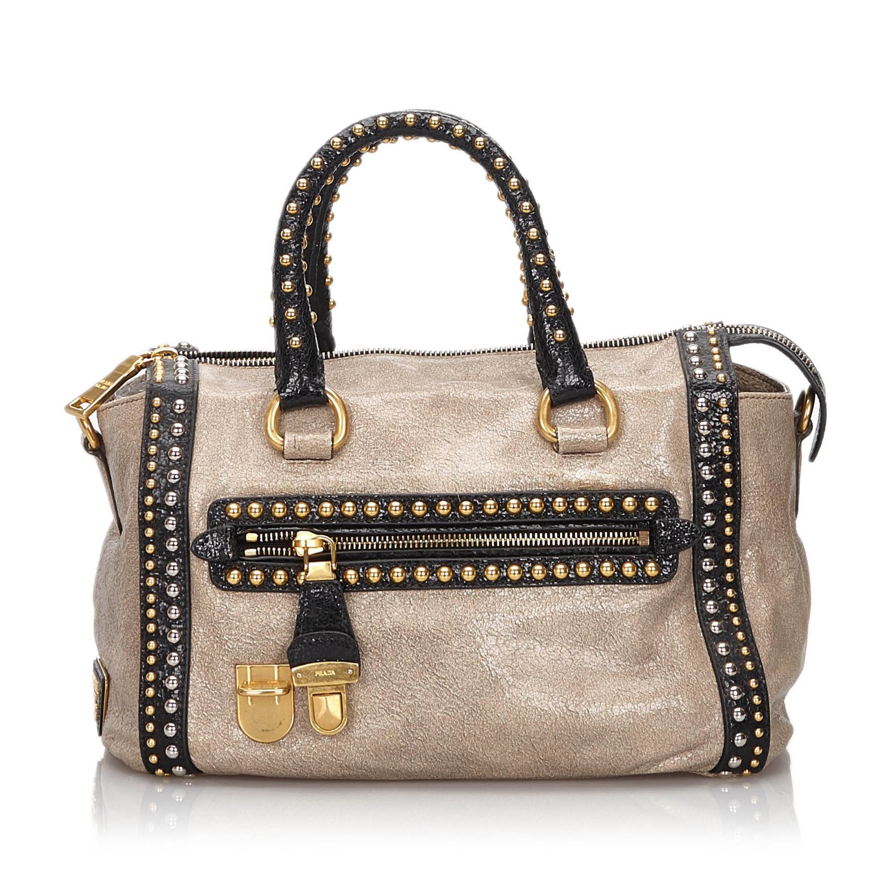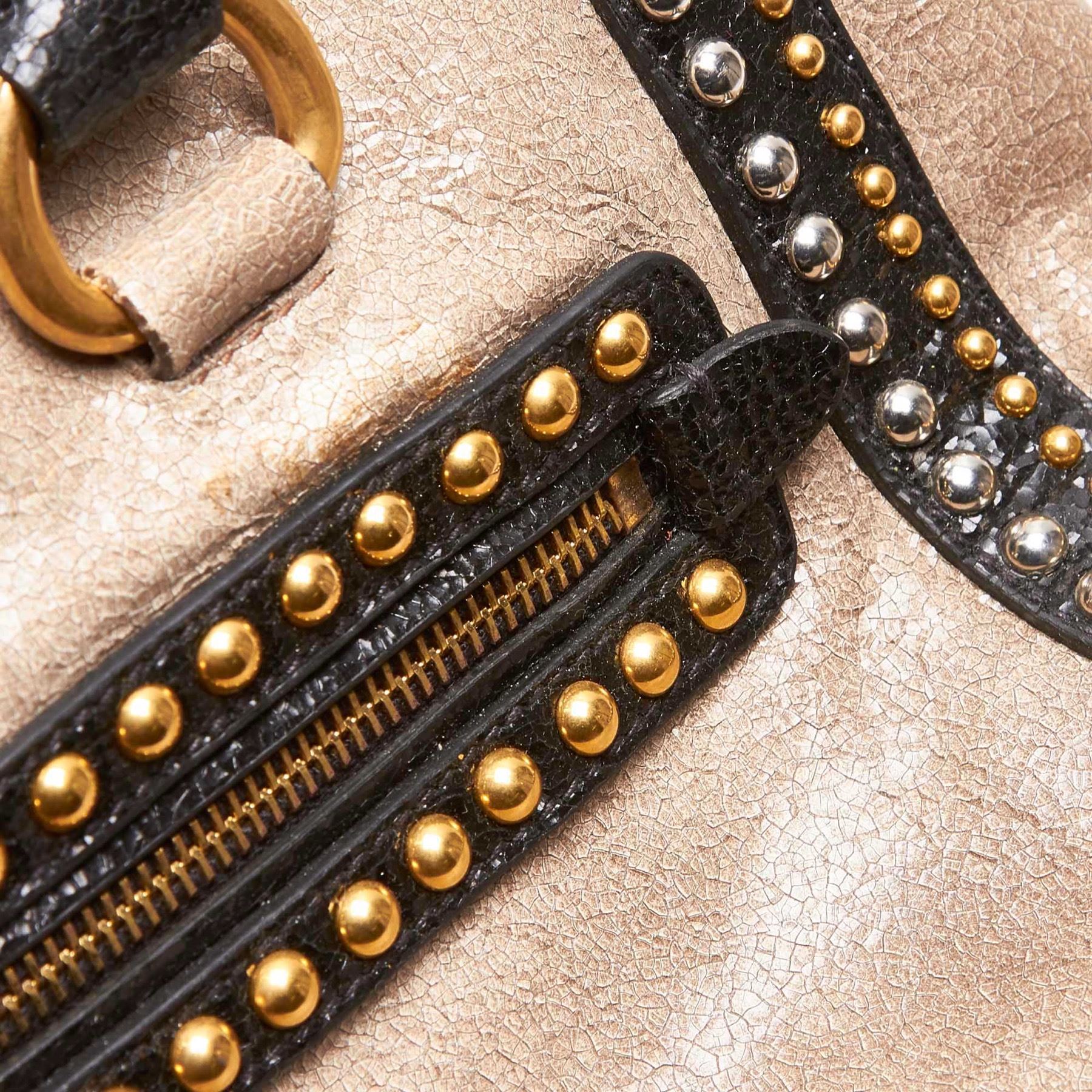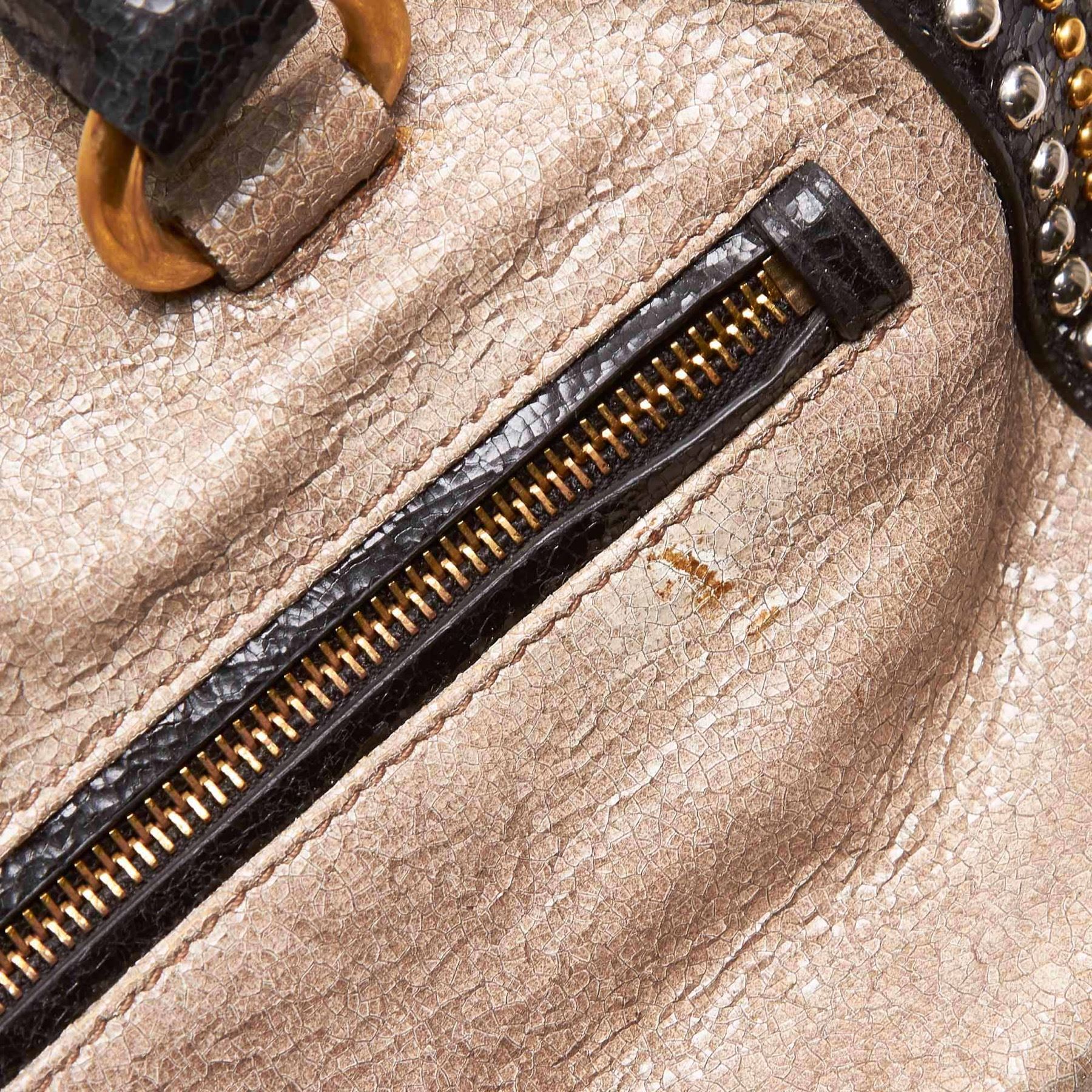 The Craquele satchel features a leather body with stud details, a front exterior zip pocket, rolled leather handles, a flat leather strap, a top zip closure, and interior zip and slip pockets. Leather x Others x Metal x Others Brown x Beige x Black Exterior front is stained and peeling. Exterior back is stained, discolored and peeling. Exterior side is peeling and scratched. Studs is tarnished. Size: 17 x 29 x 15 Card: NO Made in: ITALY