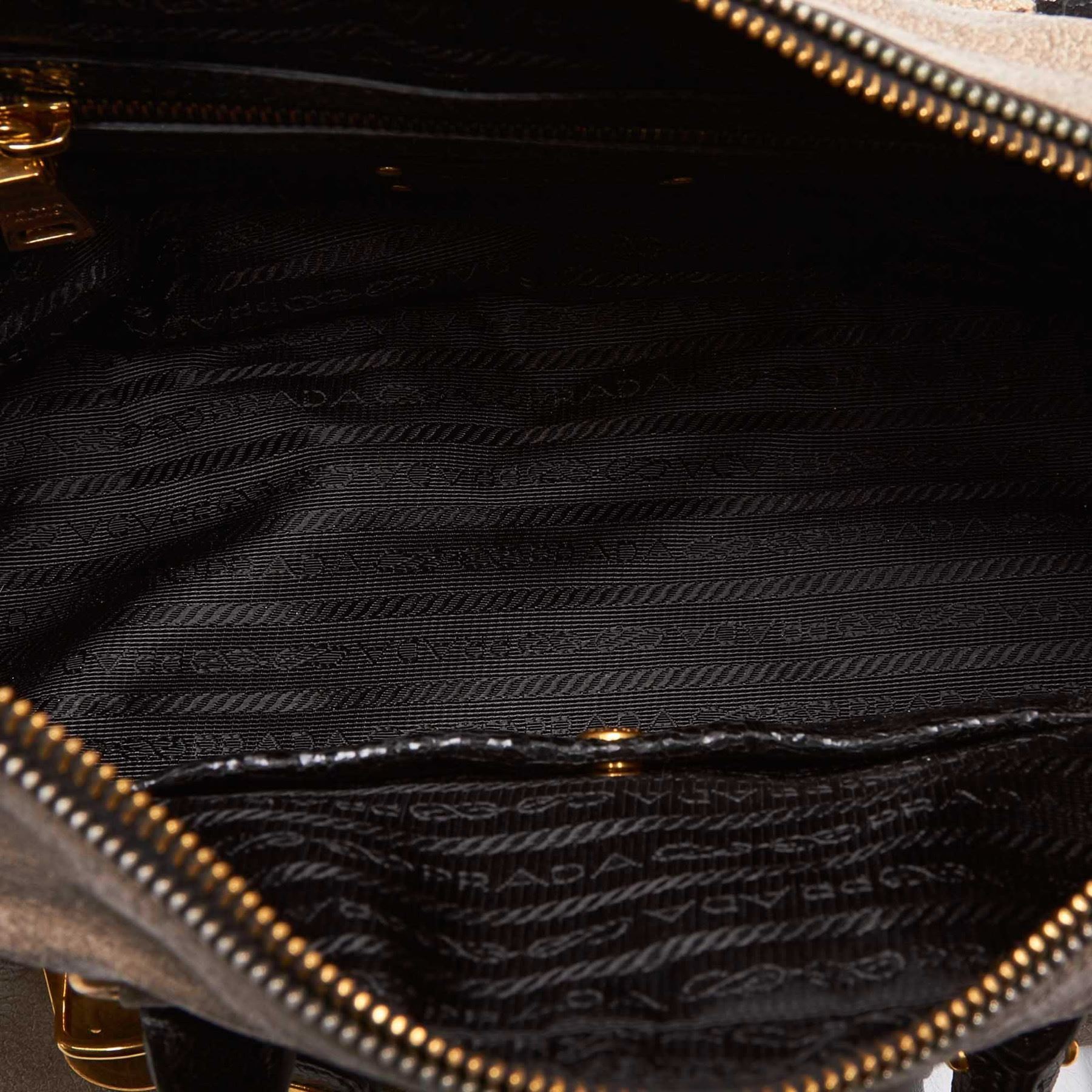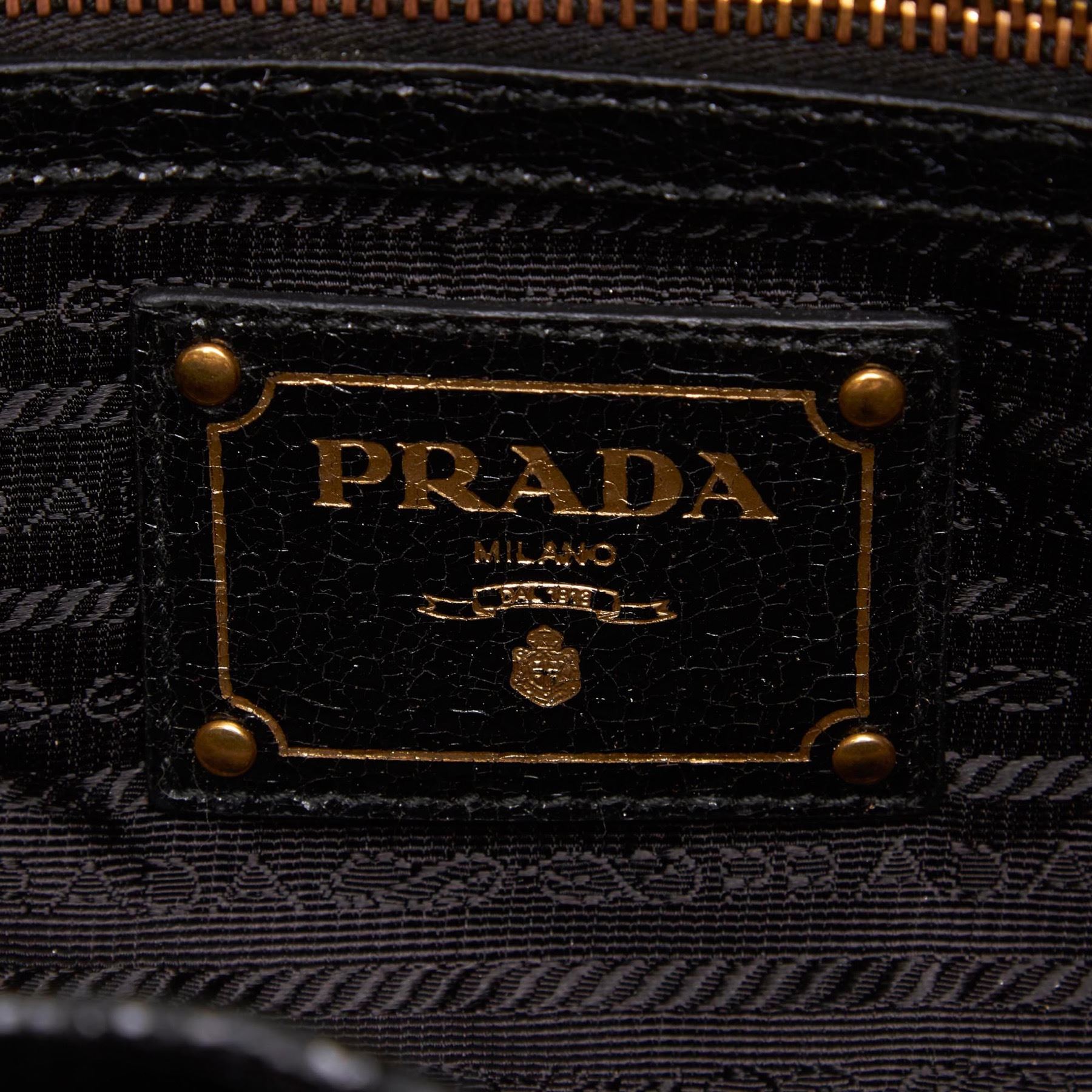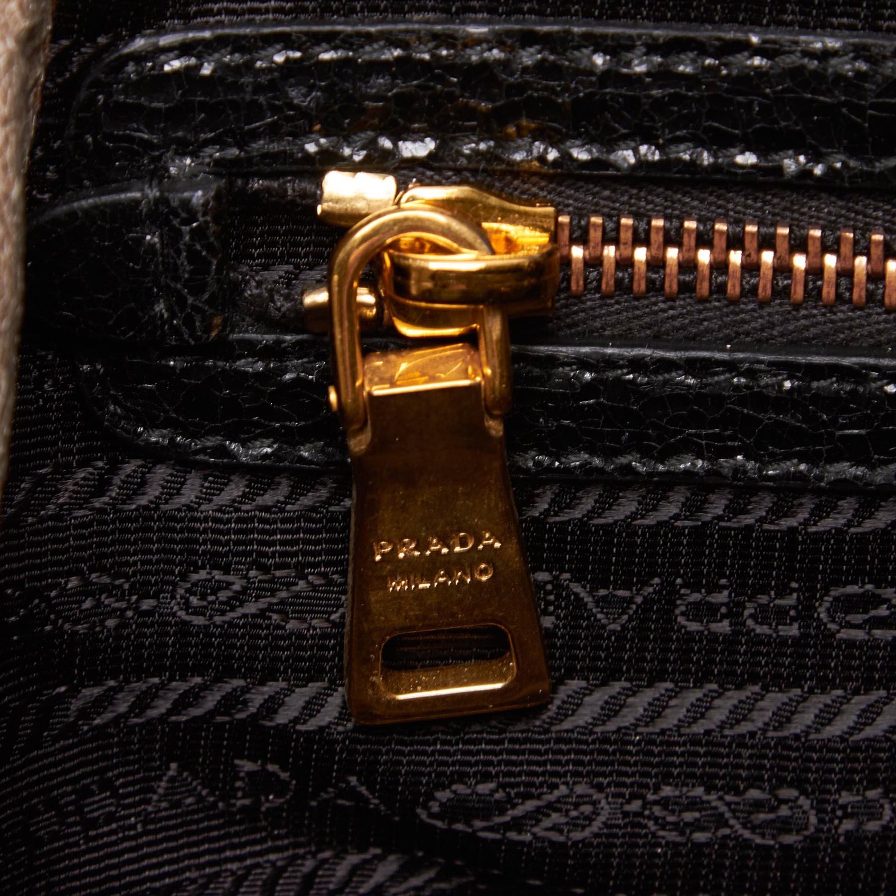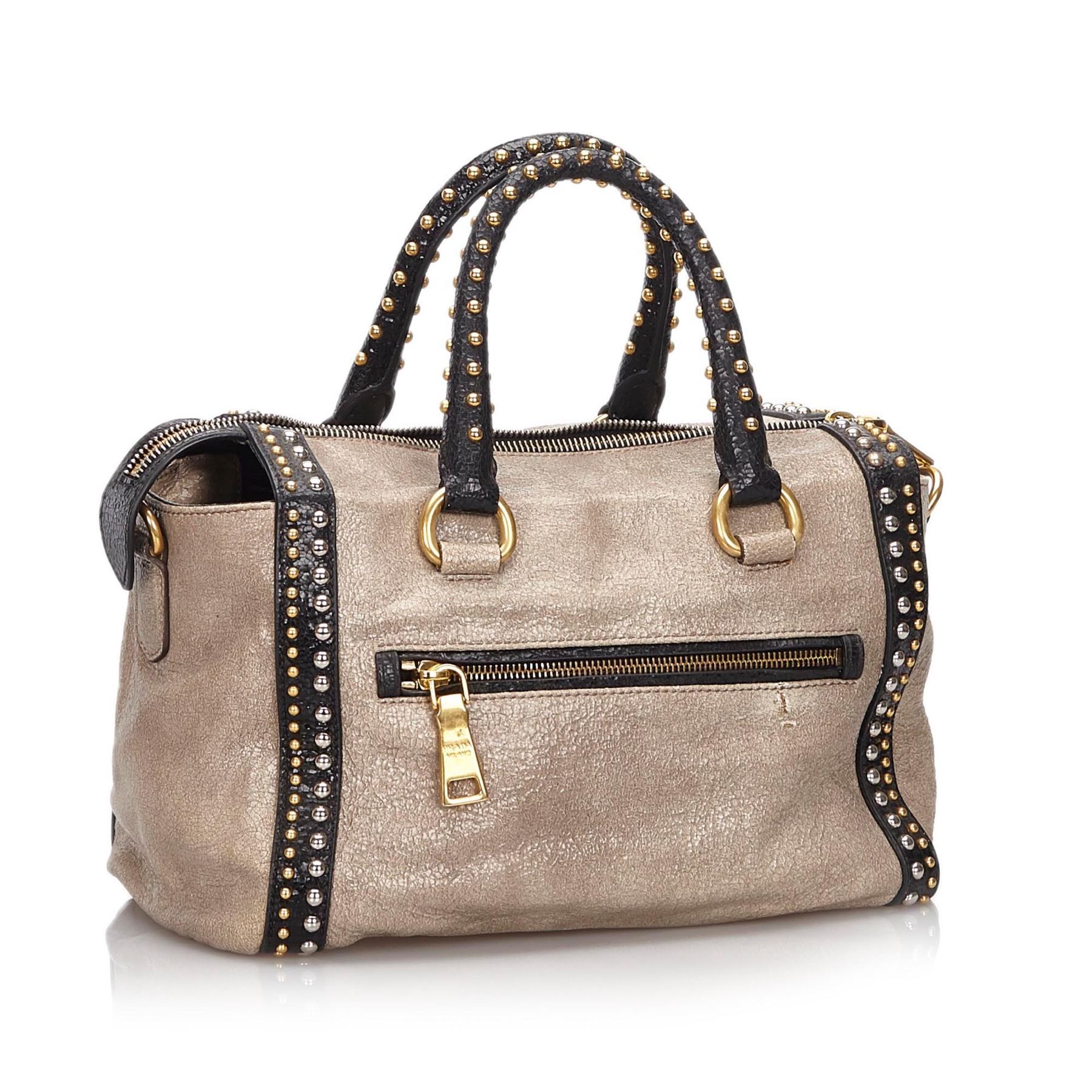 The Craquele satchel features a leather body with stud details, a front exterior zip pocket, rolled leather handles, a flat leather strap, a top zip closure, and interior zip and slip pockets. Leather x Others x Metal x Others Brown x Beige x Black Exterior front is stained and peeling. Exterior back is stained, discolored and peeling. Exterior side is peeling and scratched. Studs is tarnished. Size: 17 x 29 x 15 Card: NO Made in: ITALY