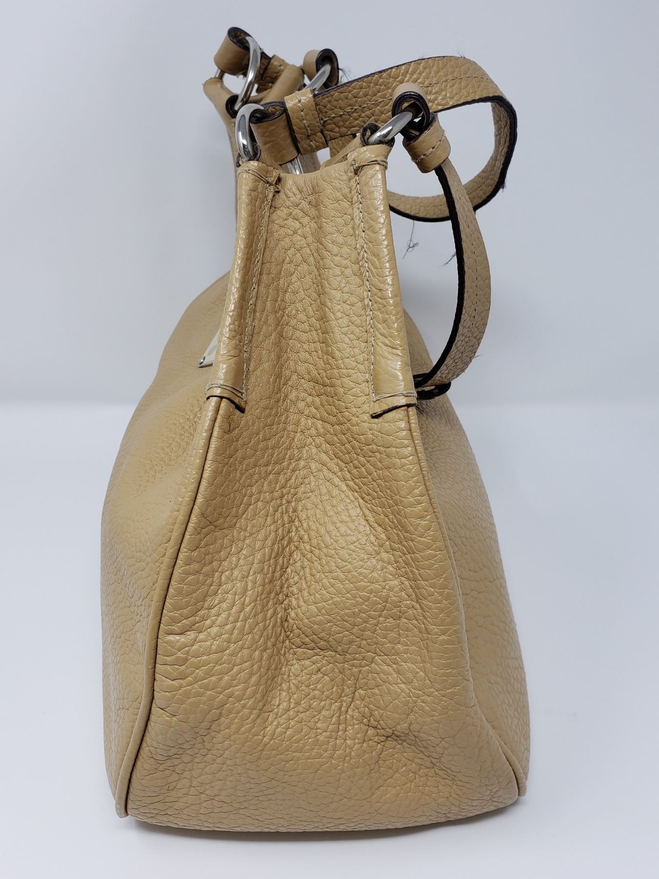 Description: Prada Tan Lambskin Shoulder Bag . Open top with Silver Magnetic Closure / Snap . Leather Handles . One inside Zippered Pocket . Silver Zipper . Champagne Satin Lining with Prada Logo .