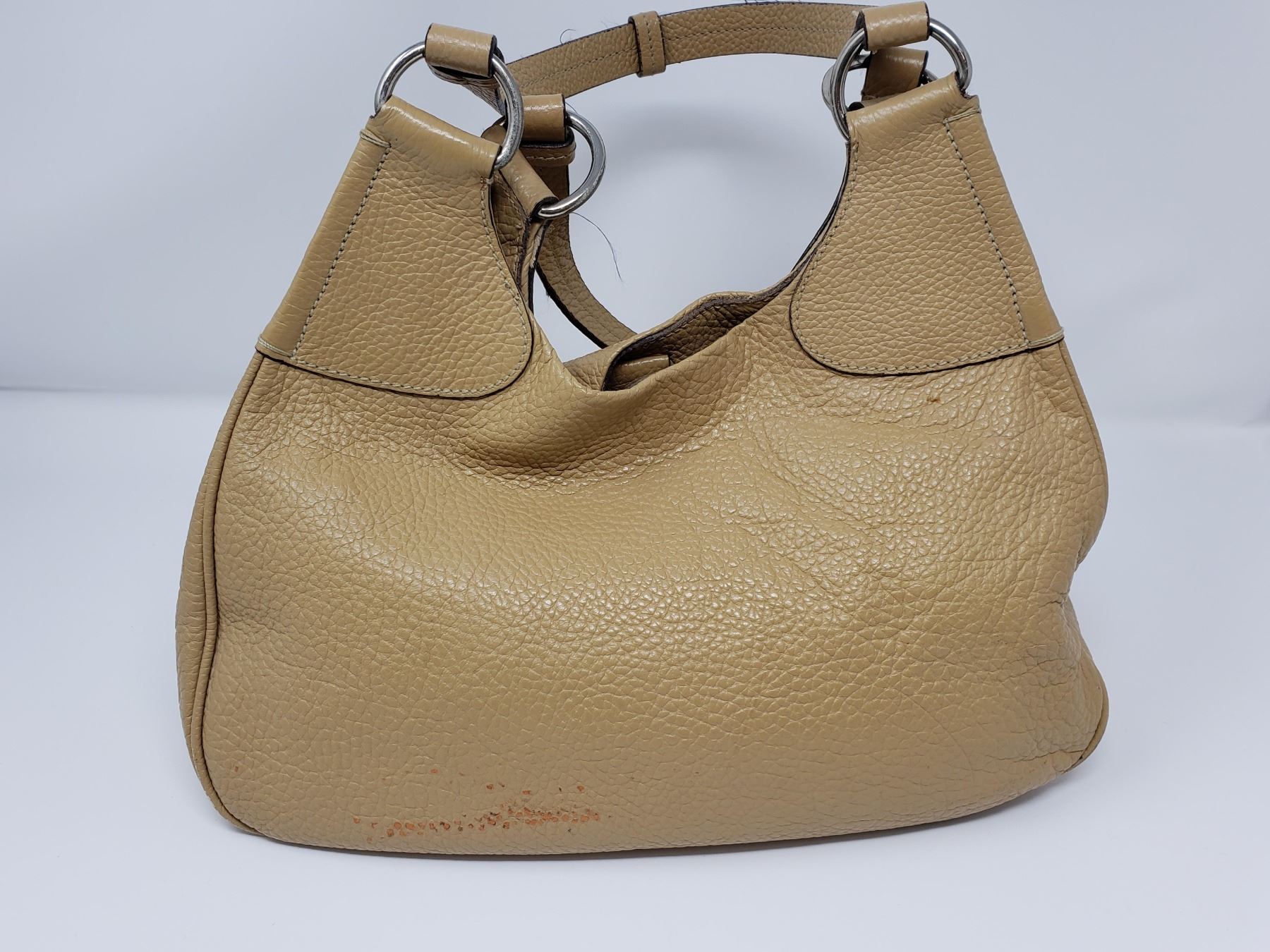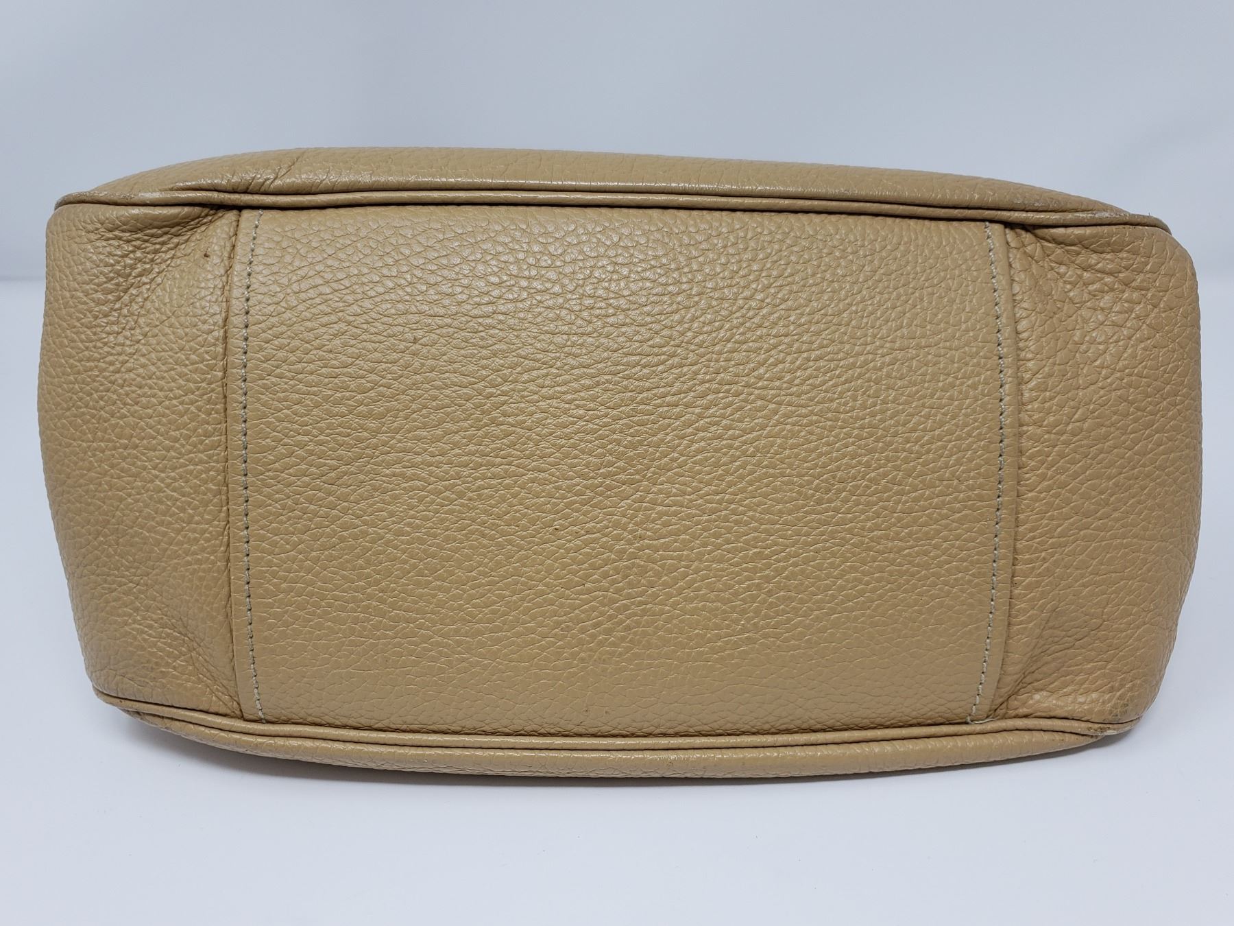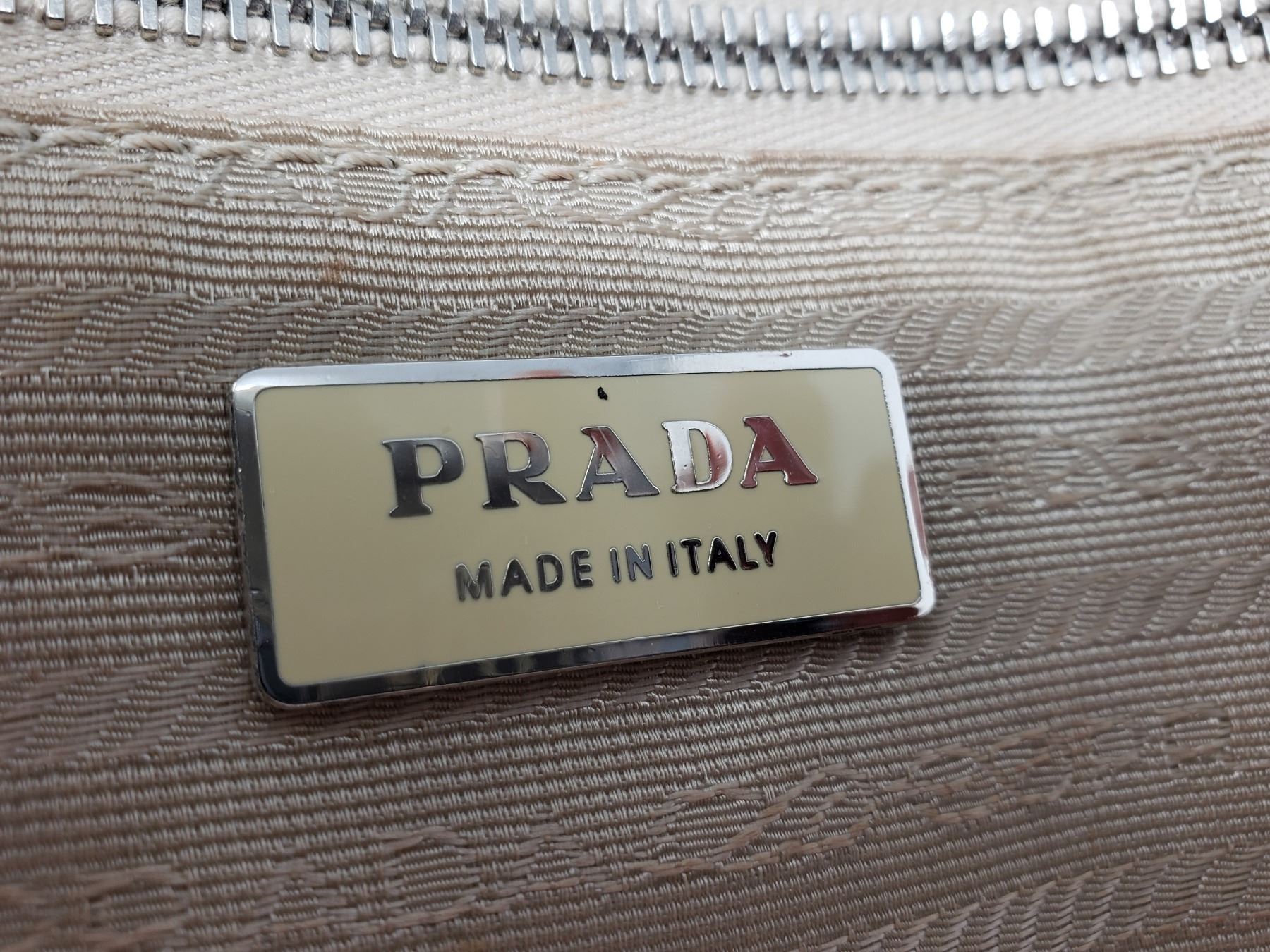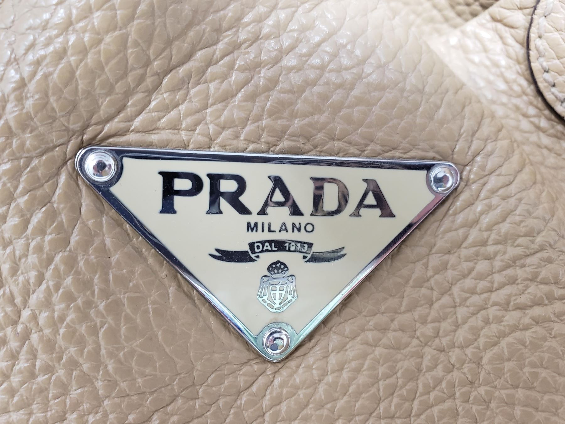 Description: Prada Tan Lambskin Shoulder Bag . Open top with Silver Magnetic Closure / Snap . Leather Handles . One inside Zippered Pocket . Silver Zipper . Champagne Satin Lining with Prada Logo .