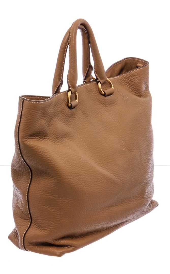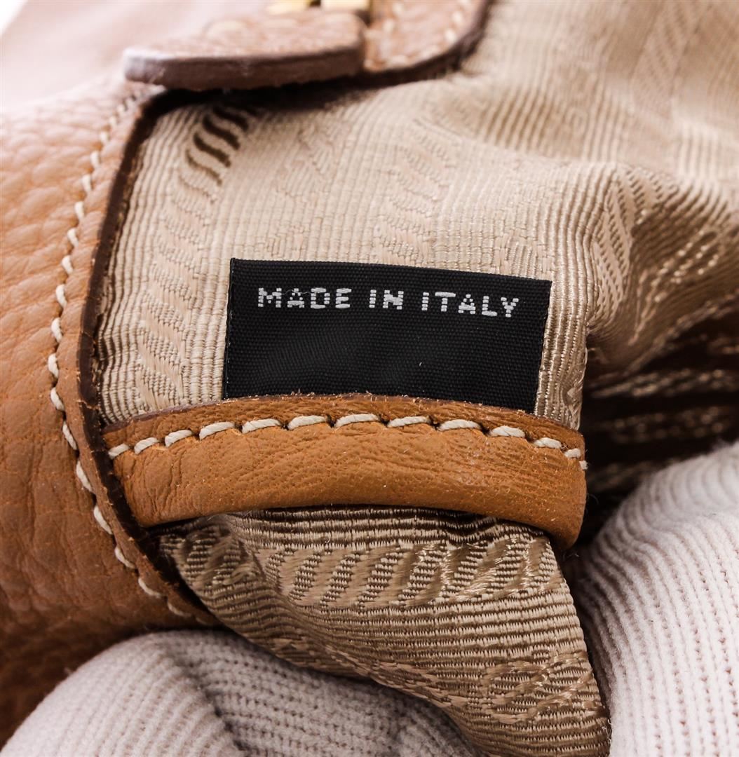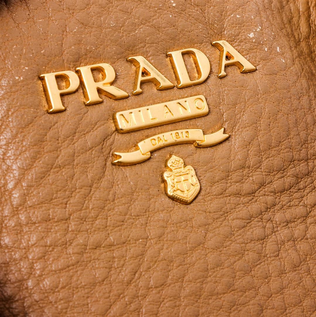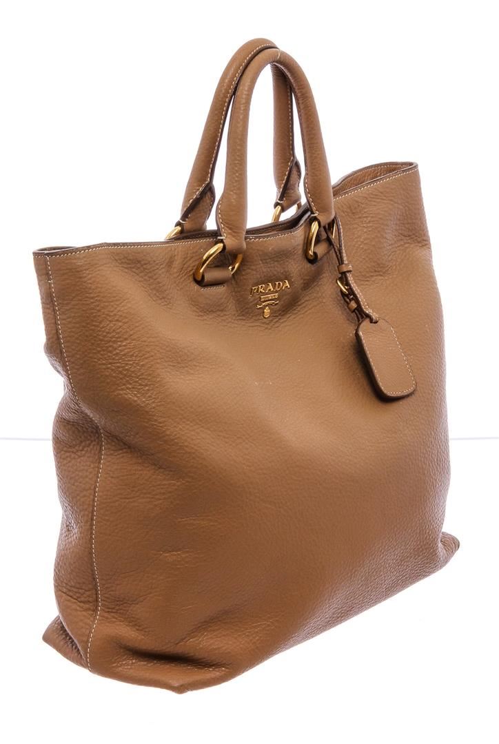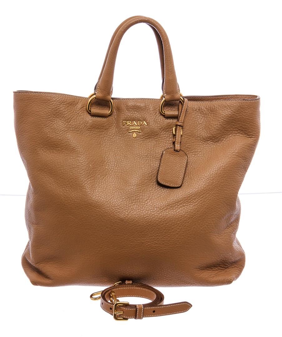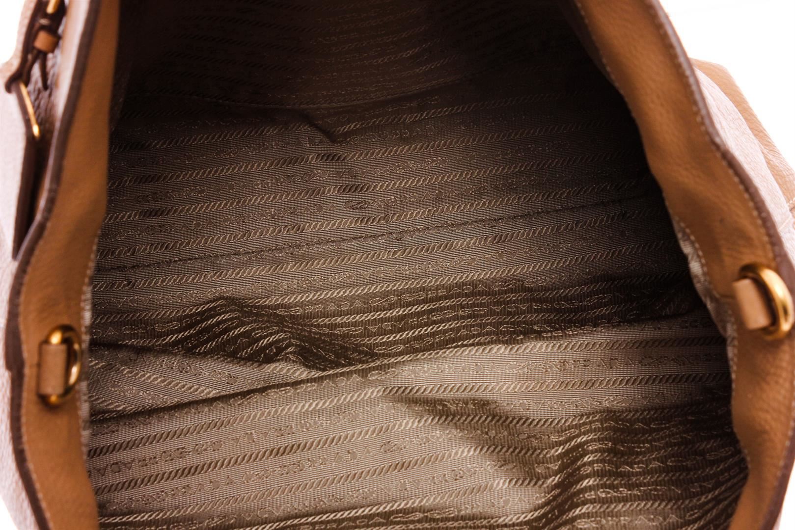 One Prada Tan Leather Double Handle Tote Bag. Prada tan pebbled leather tote bag with golden hardware, rolled top handles with hanging tag, removable and adjustable shoulder strap, exterior logo lettering at front, and logo-jacquard lining at interior.