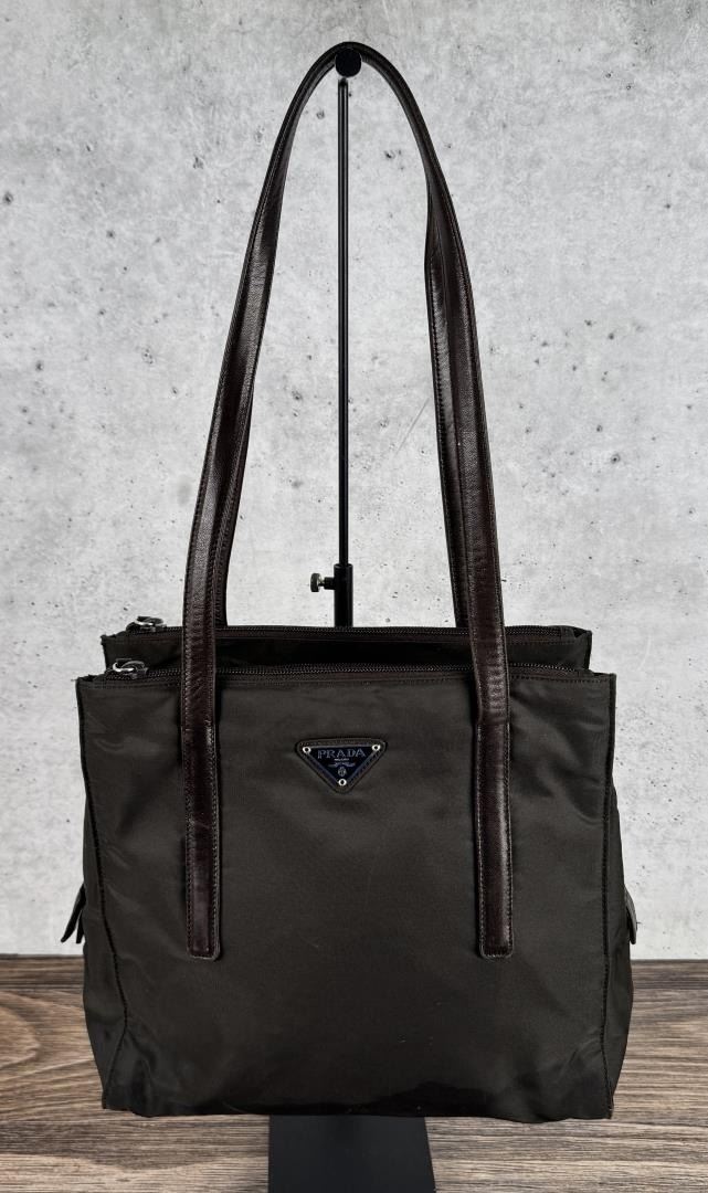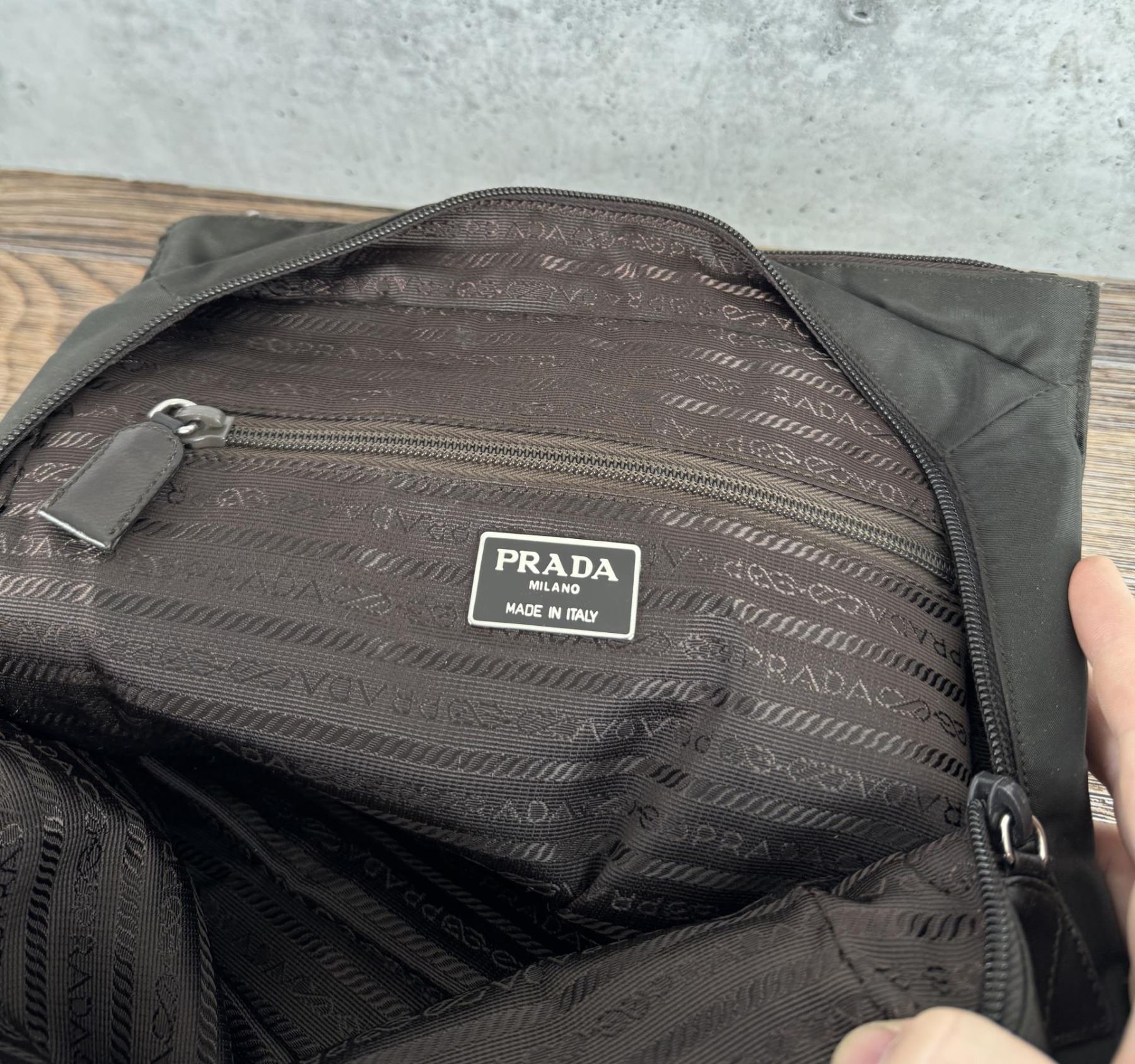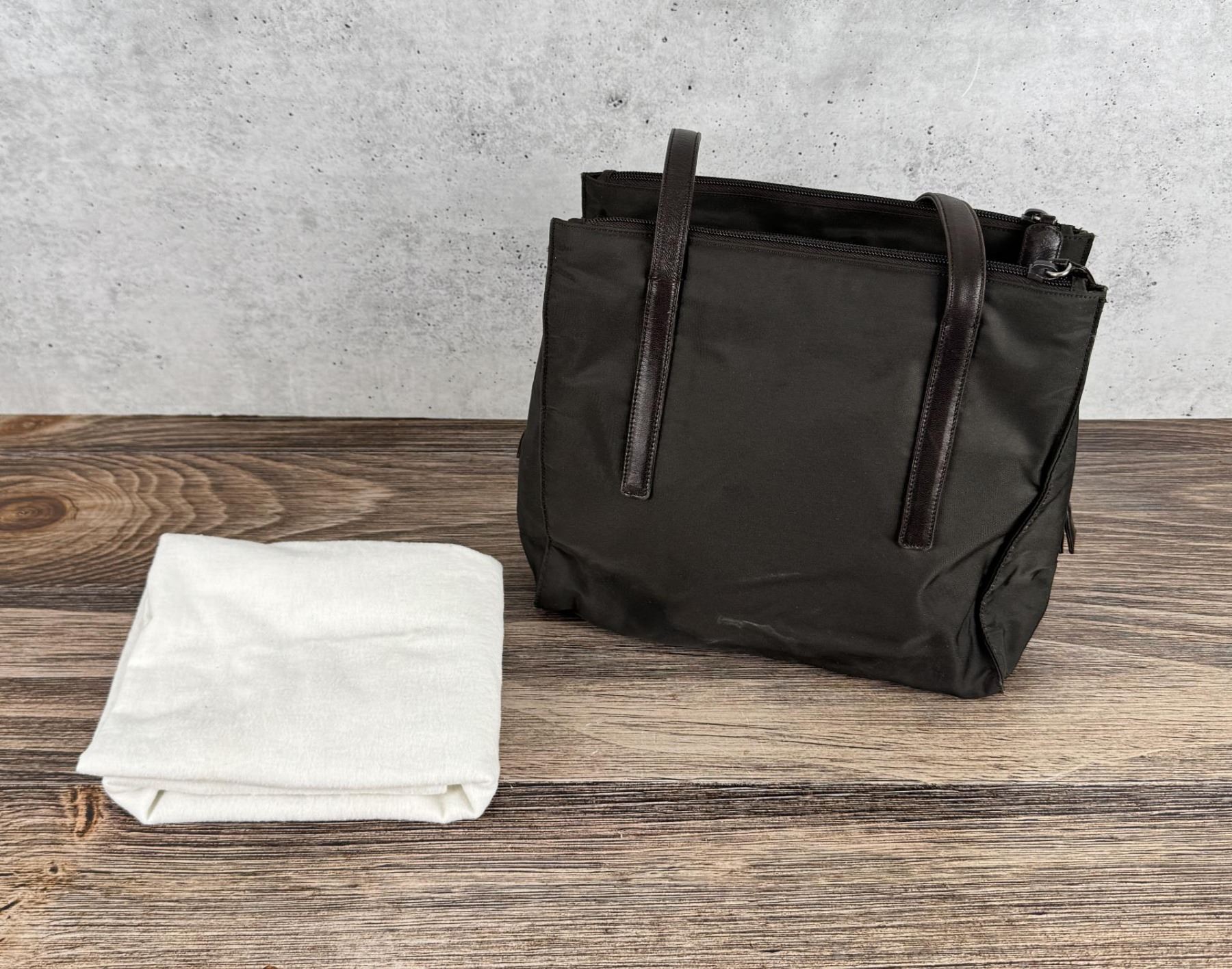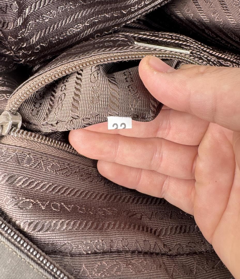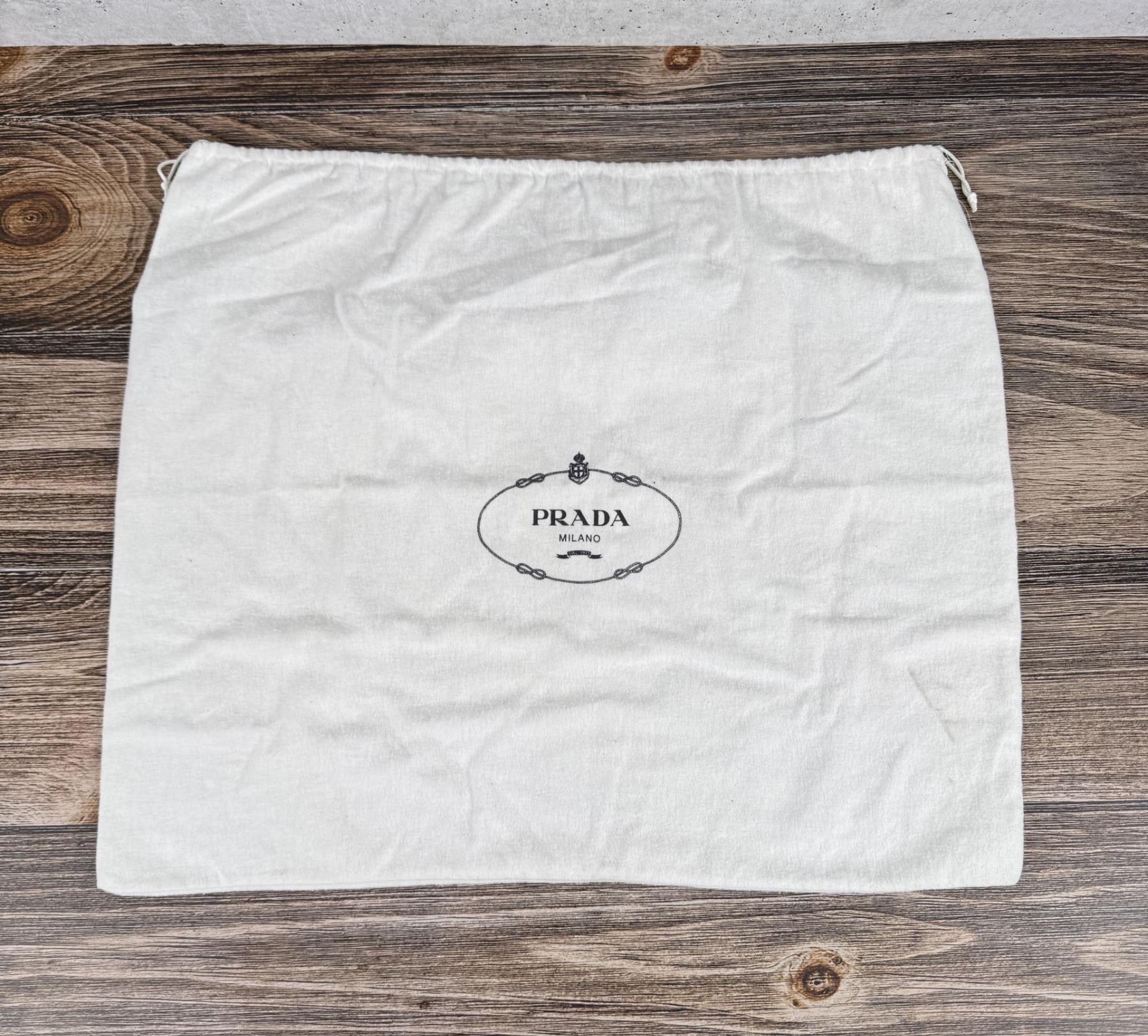 Lot includes Prada dust cover. Tag inside reads 22. Bag measures 12 7/8" by 11 1/8". Strap is 11" long.
